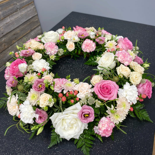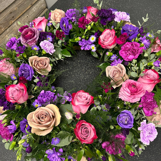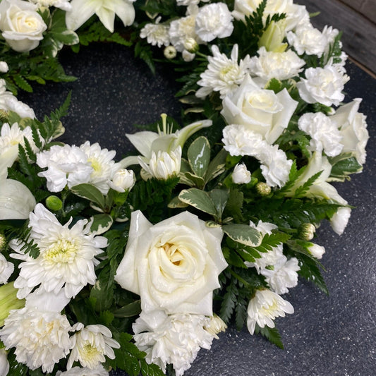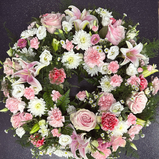 Wreaths represent eternity and the cycle of life. Our Wreath arrangements are crafted with care and artistry, using a combination of fresh flowers and greenery to create a circular symbol of everlasting love and remembrance. Each wreath is thoughtfully designed to bring comfort and solace, paying homage to the unique spirit of the departed.