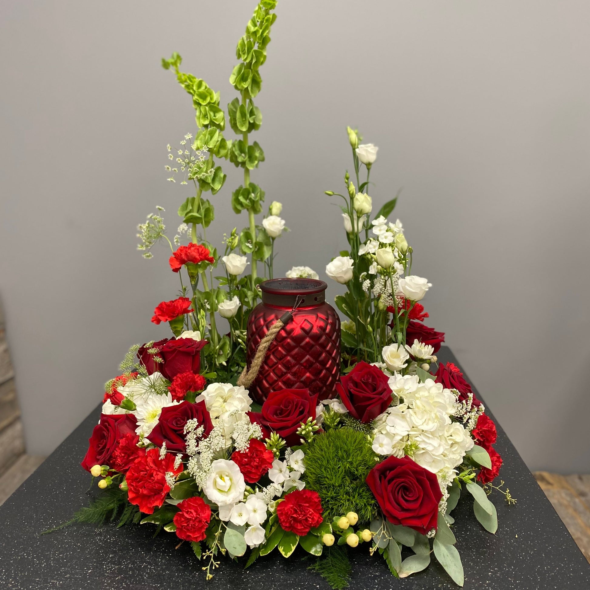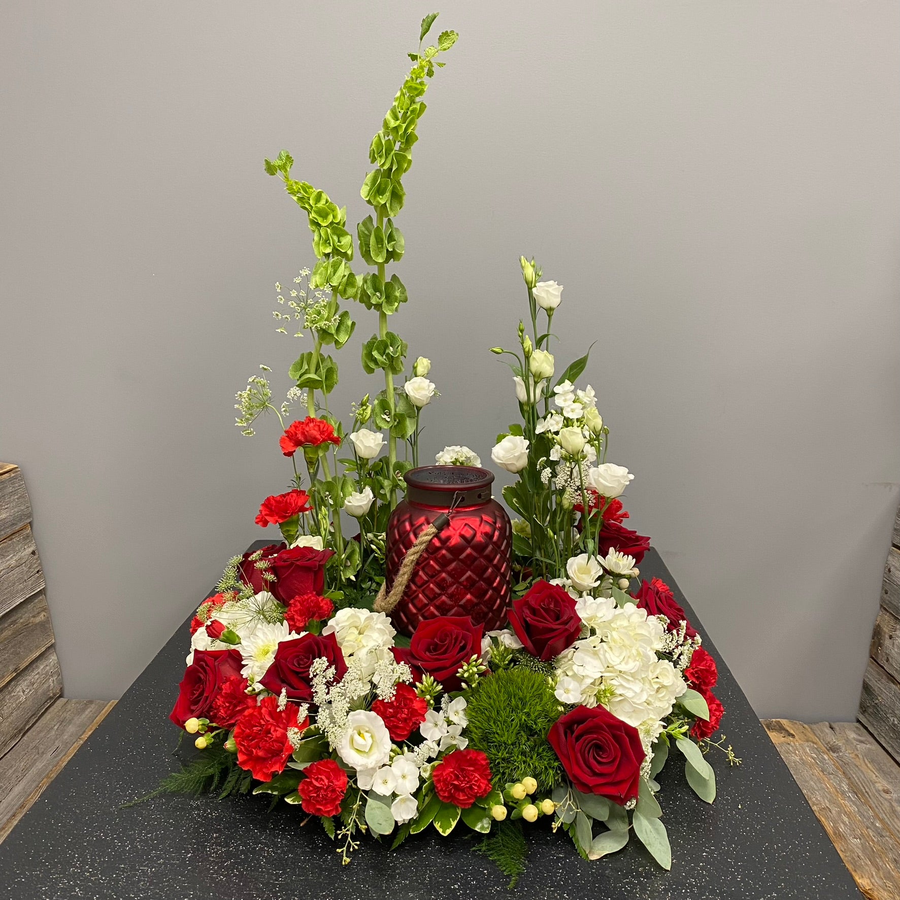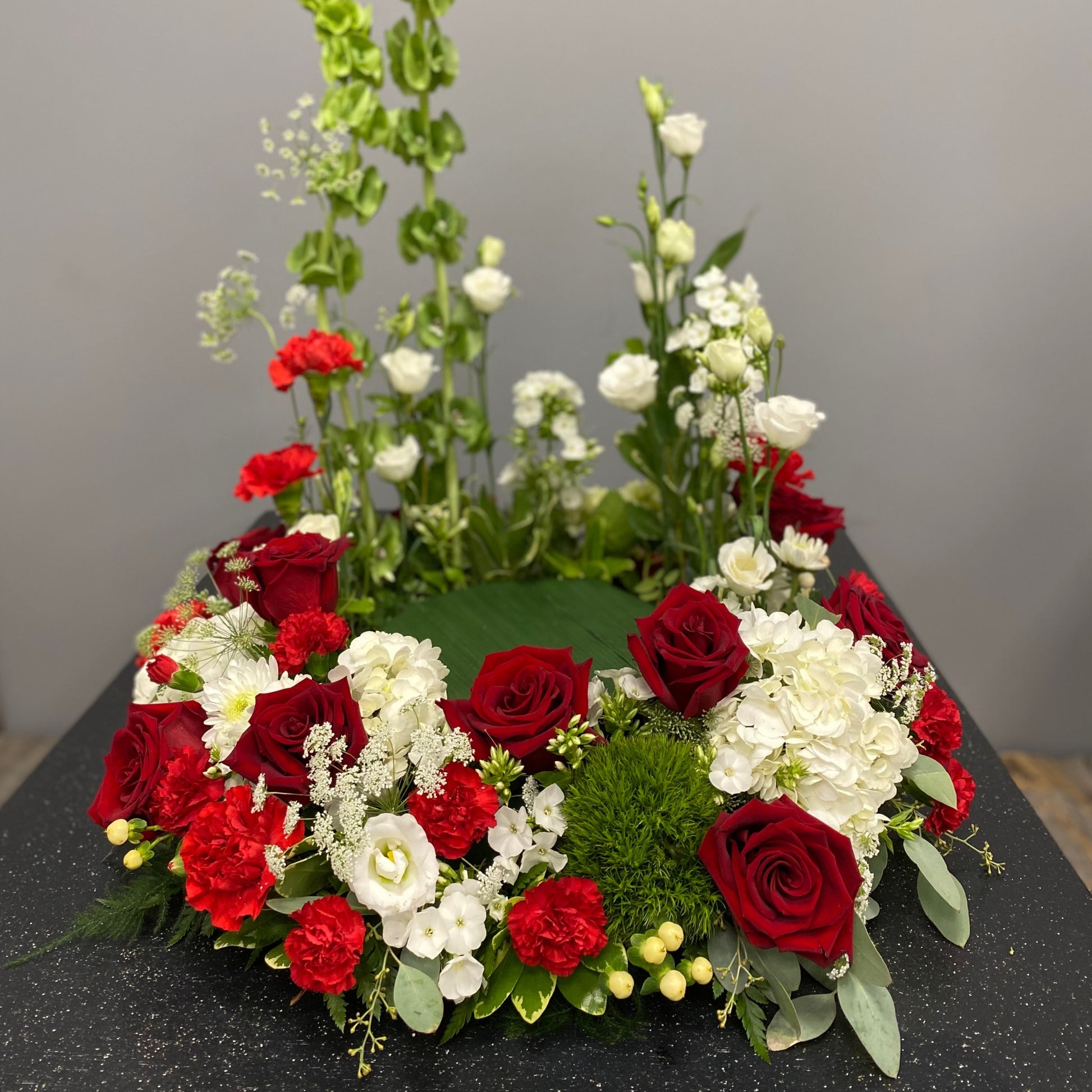 Amazing Grace brings together a classic combination of red & white blossoms in a classic traditional urn riser. This elegant offering of roses, carnations, bells of Ireland, and lisianthus provides a heartfelt tribute of sympathy for all funeral and memorial services.