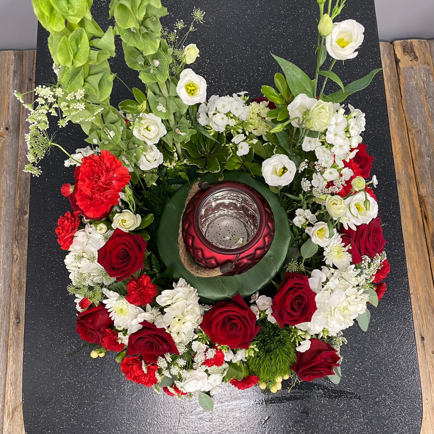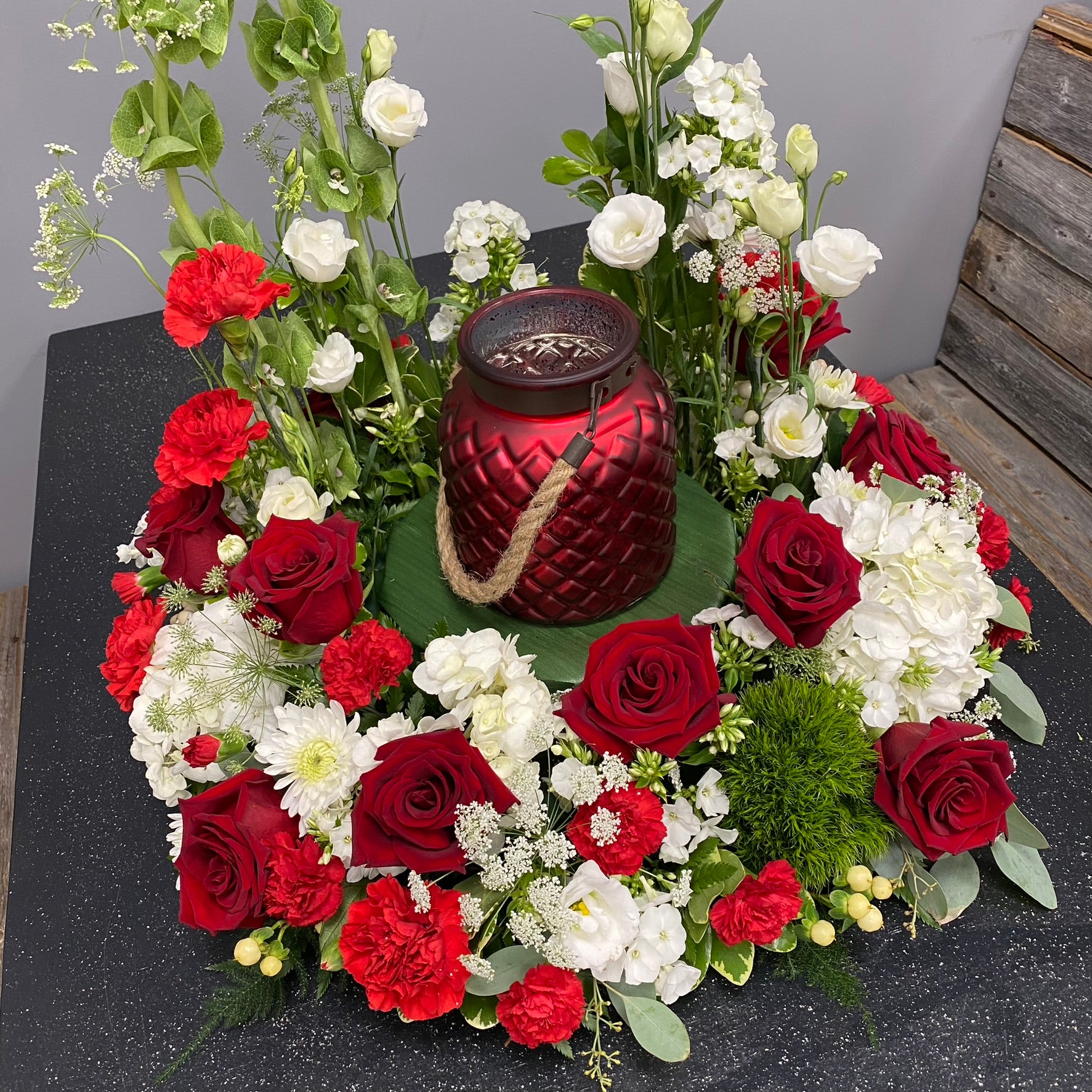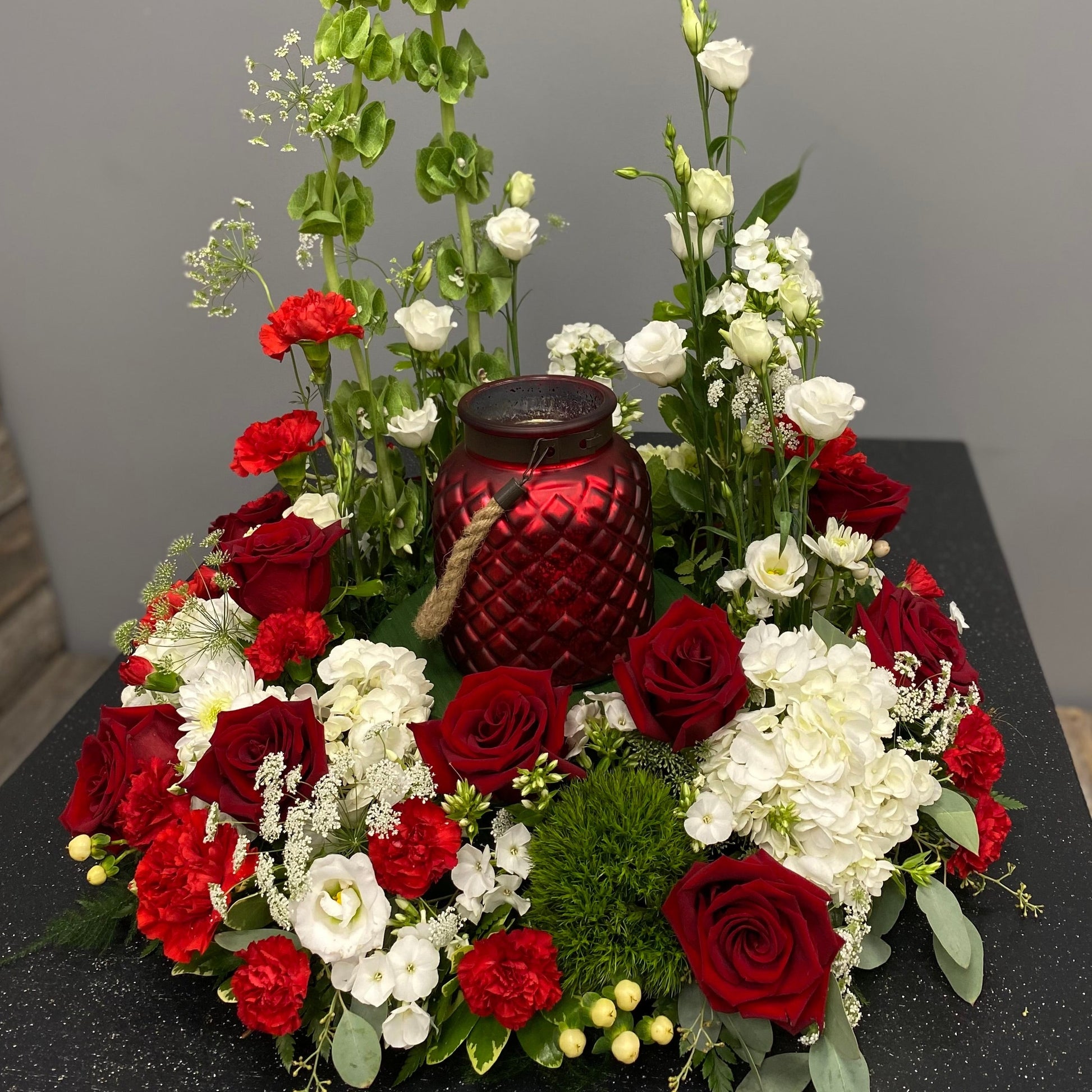 Amazing Grace brings together a classic combination of red & white blossoms in a classic traditional urn riser. This elegant offering of roses, carnations, bells of Ireland, and lisianthus provides a heartfelt tribute of sympathy for all funeral and memorial services.