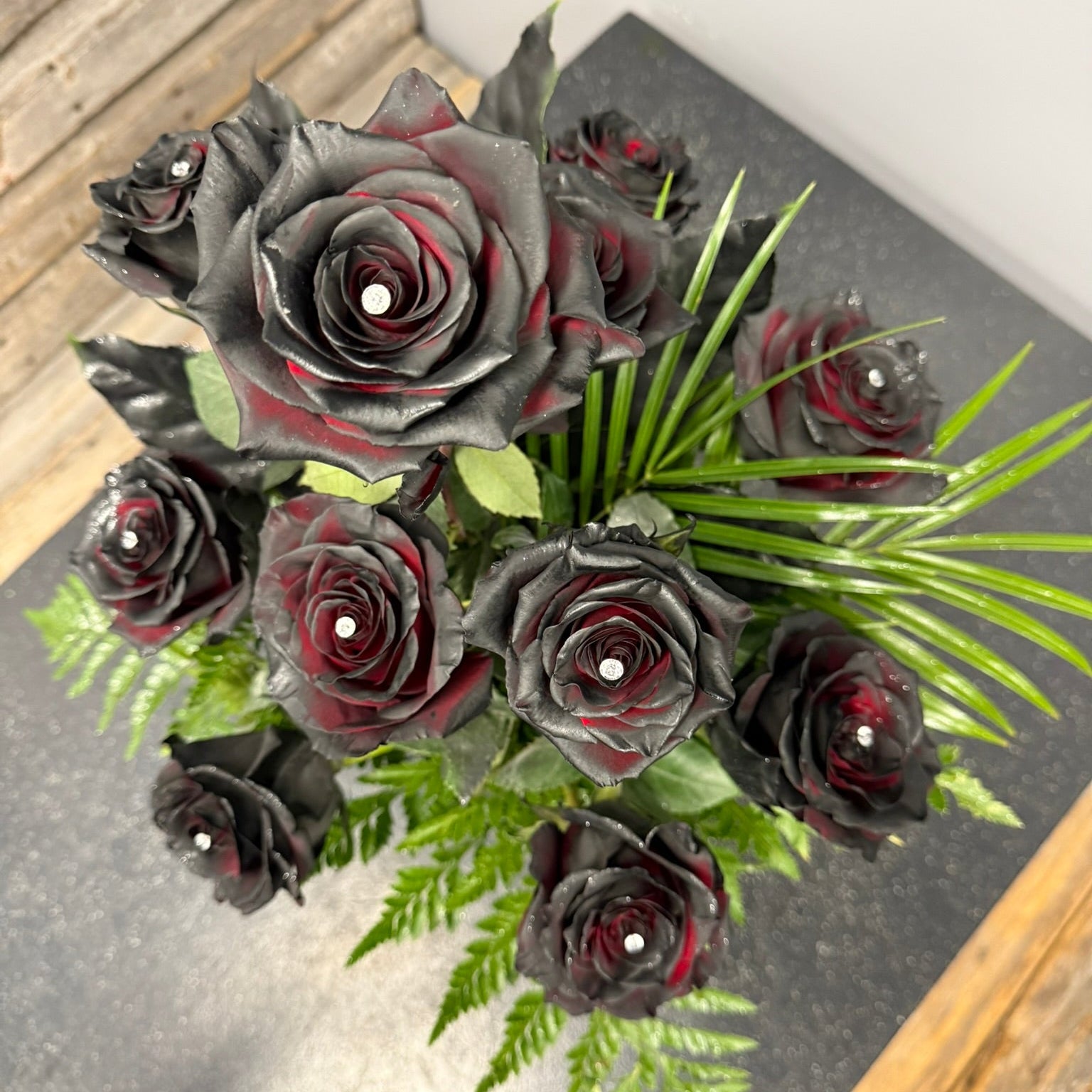 Experience the bold elegance of twelve black roses that redefine modern floral beauty. "Beauty In Darkness" captures an edgy, daring spirit with deep, velvety petals that make a striking statement. Perfect for those who embrace contrast and crave originality, this arrangement transforms any space into a scene of captivating mystery and contemporary sophistication.