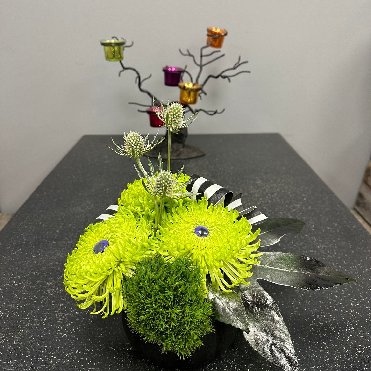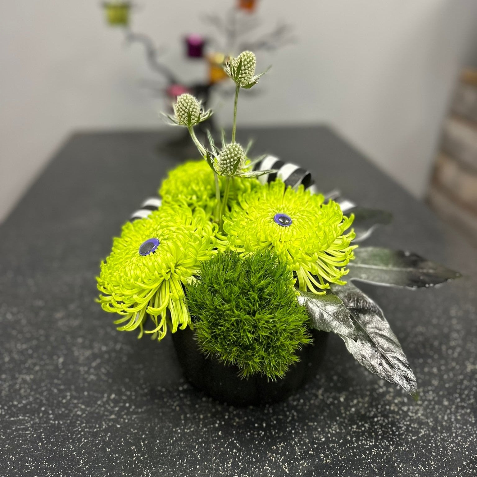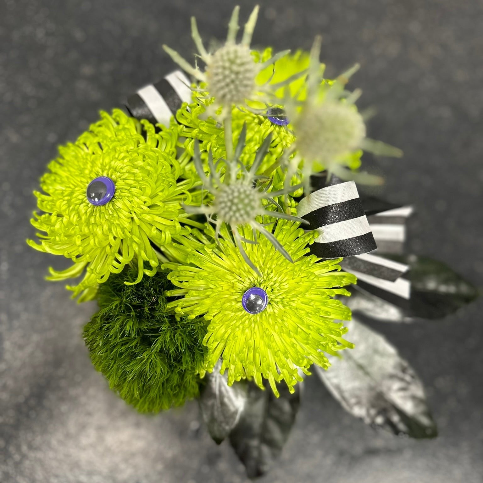 Get ready to say "Beetlejuice" three times with this unique floral arrangement! Inspired by the movie, it features a bold combination of black, white, and lime green, with a touch of spooky black pumpkin. Perfect for adding a quirky touch to any room. Get yours before it disappears!
