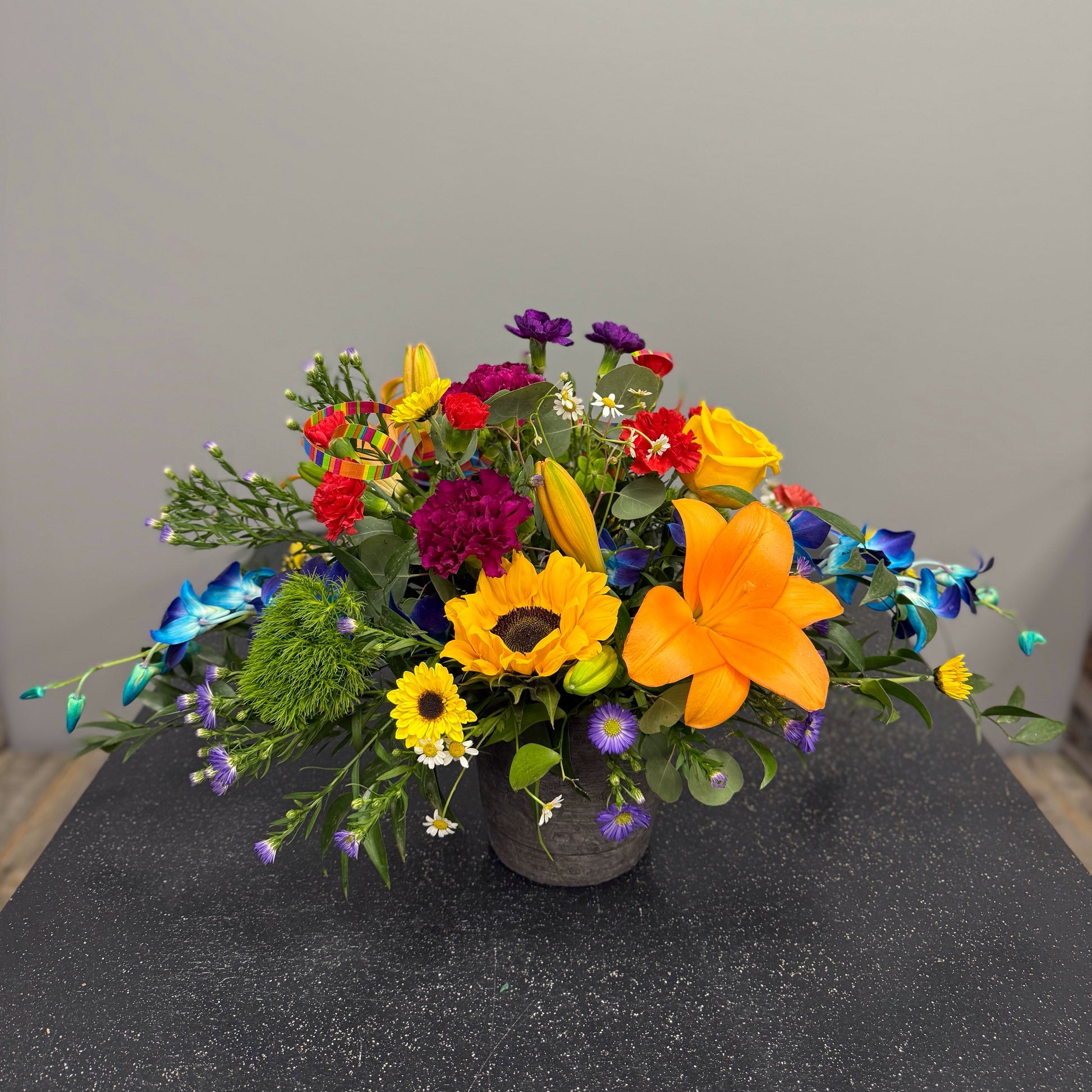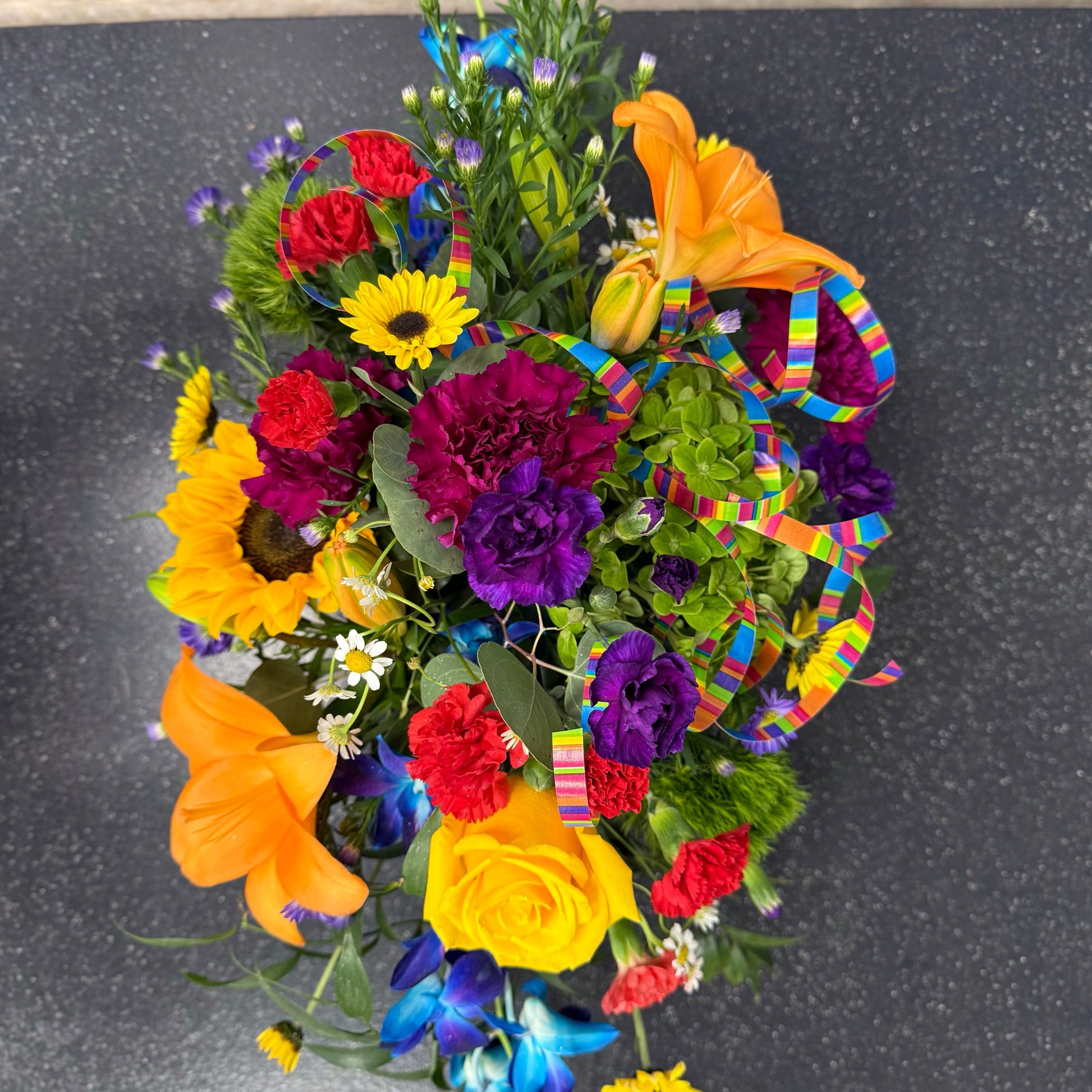 Celebrate in style with our Birthday Bash bouquet—a vibrant explosion of joy! This cheerful arrangement bursts with sunny sunflowers, radiant orange lilies, elegant blue dendrobium orchids, and classic roses, all complemented by playful carnations and chrysanthemums. Perfect for making someone's special day unforgettable, this bright and spirited mix captures the excitement of birthday celebrations. Whether you're surprising a friend, family member, or colleague, this show-stopping bouquet delivers happiness in full bloom. Make their birthday legendary!