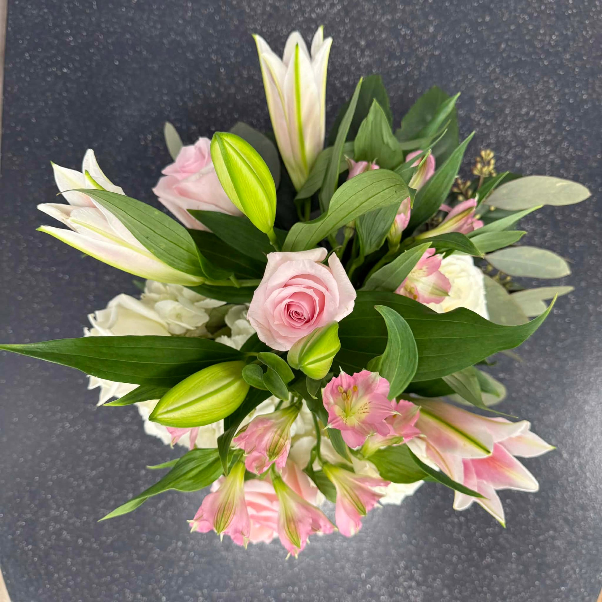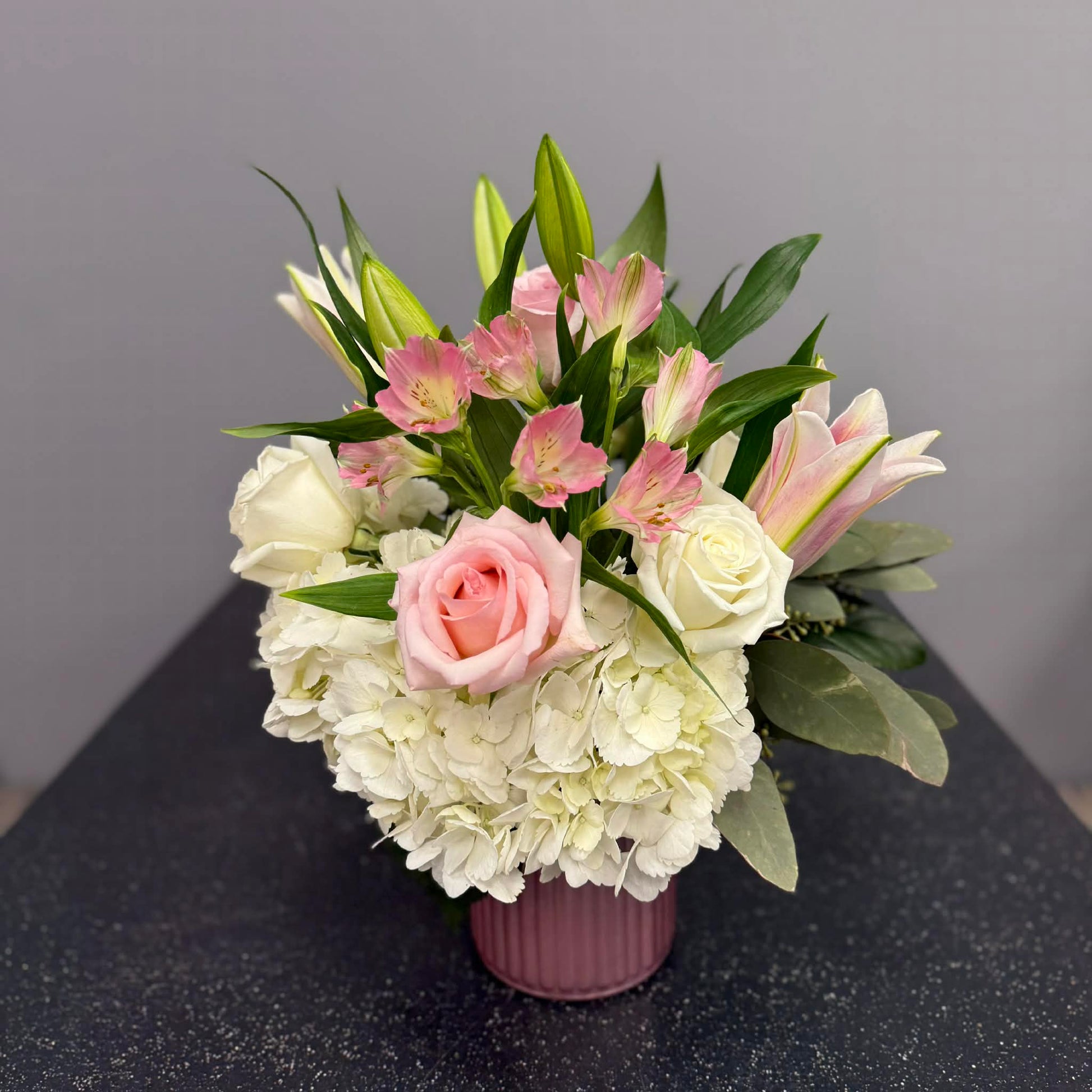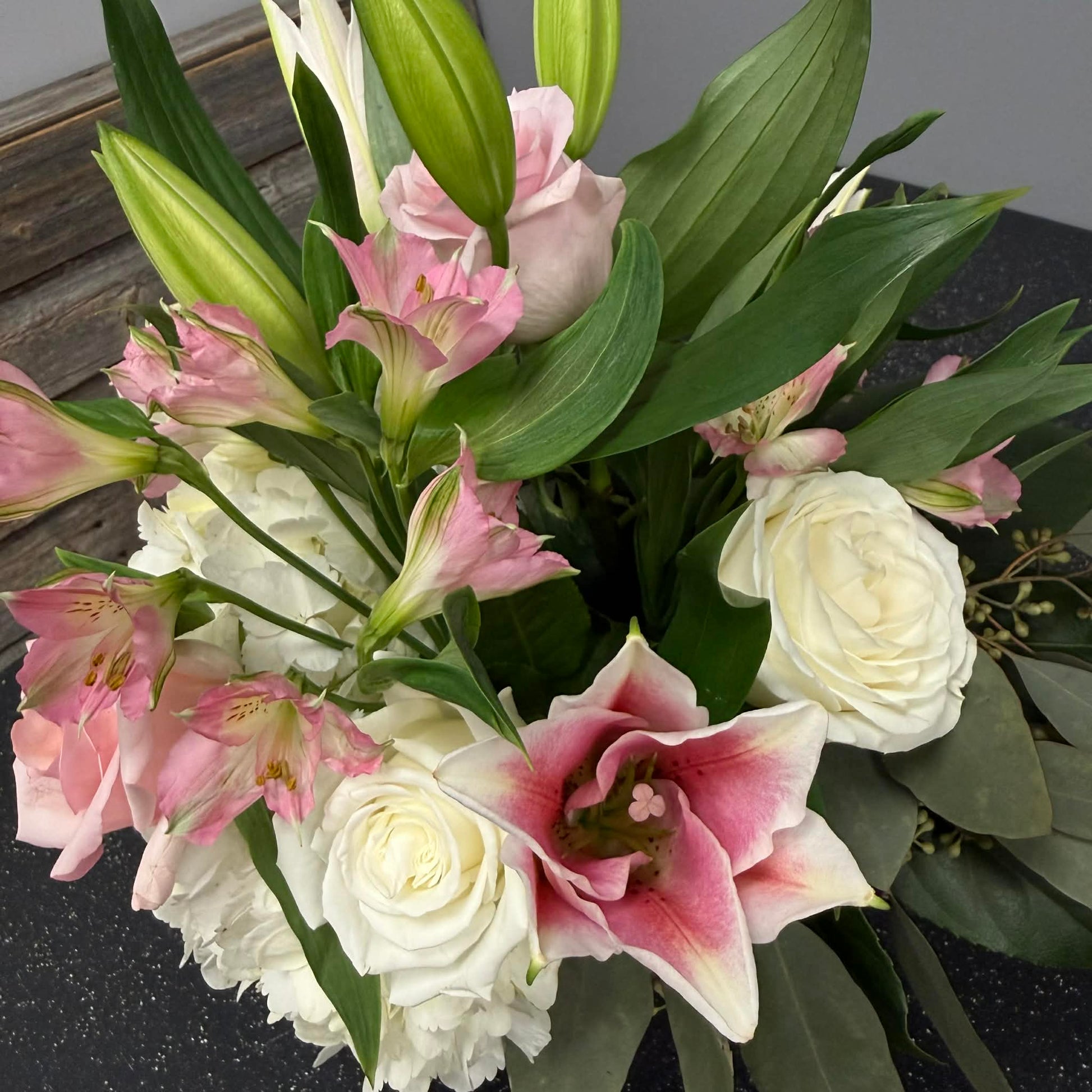 Garden Kiss is a tender blend of soft pink and ivory blooms, designed to feel fresh from the garden. Blush roses, Playa Blanca roses, and pillowy white hydrangea create a timeless, elegant base. Light pink alstromeria, fragrant oriental lilies, and eucalyptus add graceful movement and scent. A sweet, gentle arrangement that feels like love in full bloom.