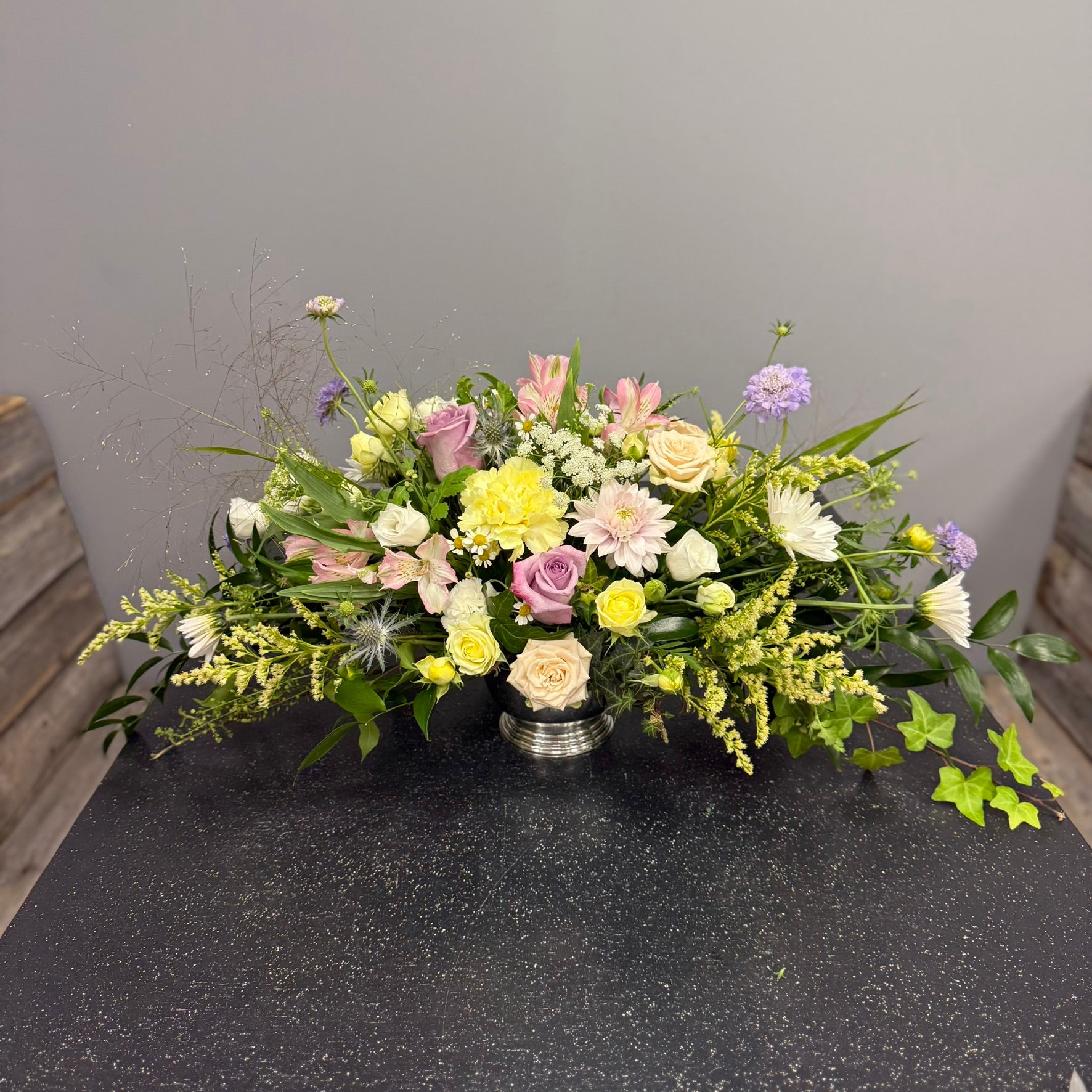 Garden Party is a beautiful display that brings the joy of a lush garden to your home. Its cluster of purple roses and green kermit mums, set atop a striking silver pedestal, is an elegant addition that will fill any room with natural beauty.