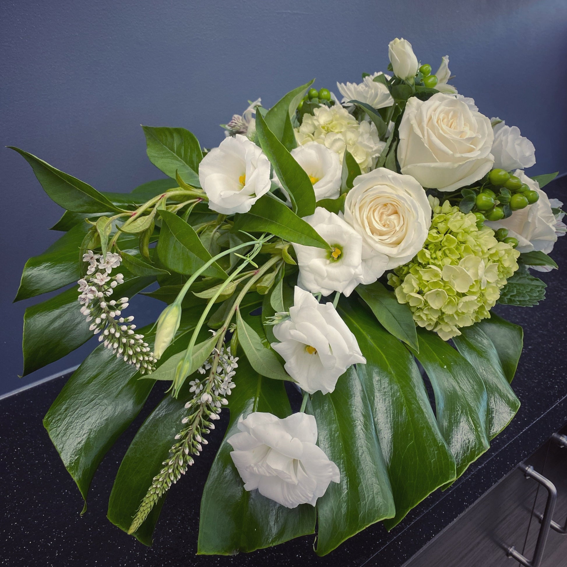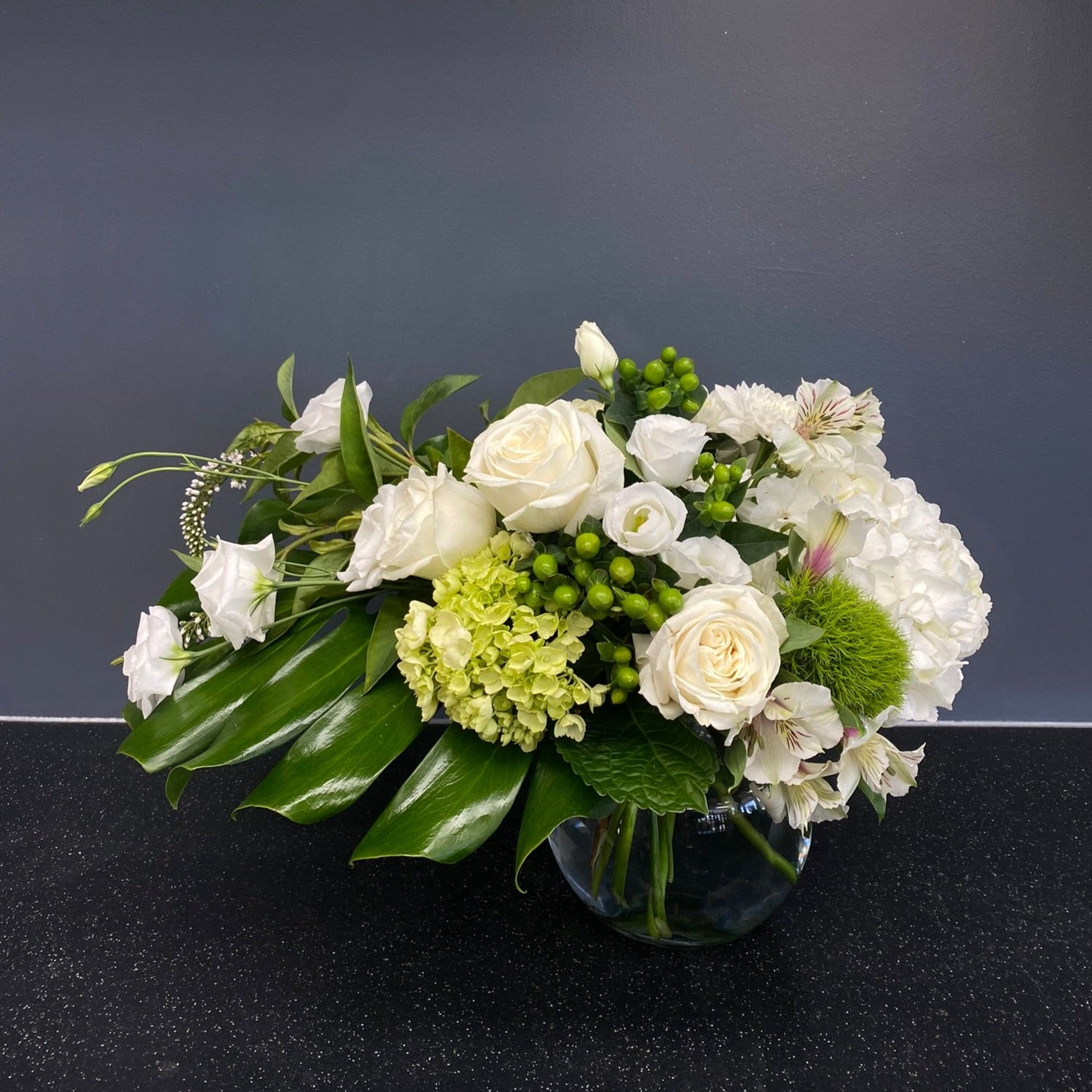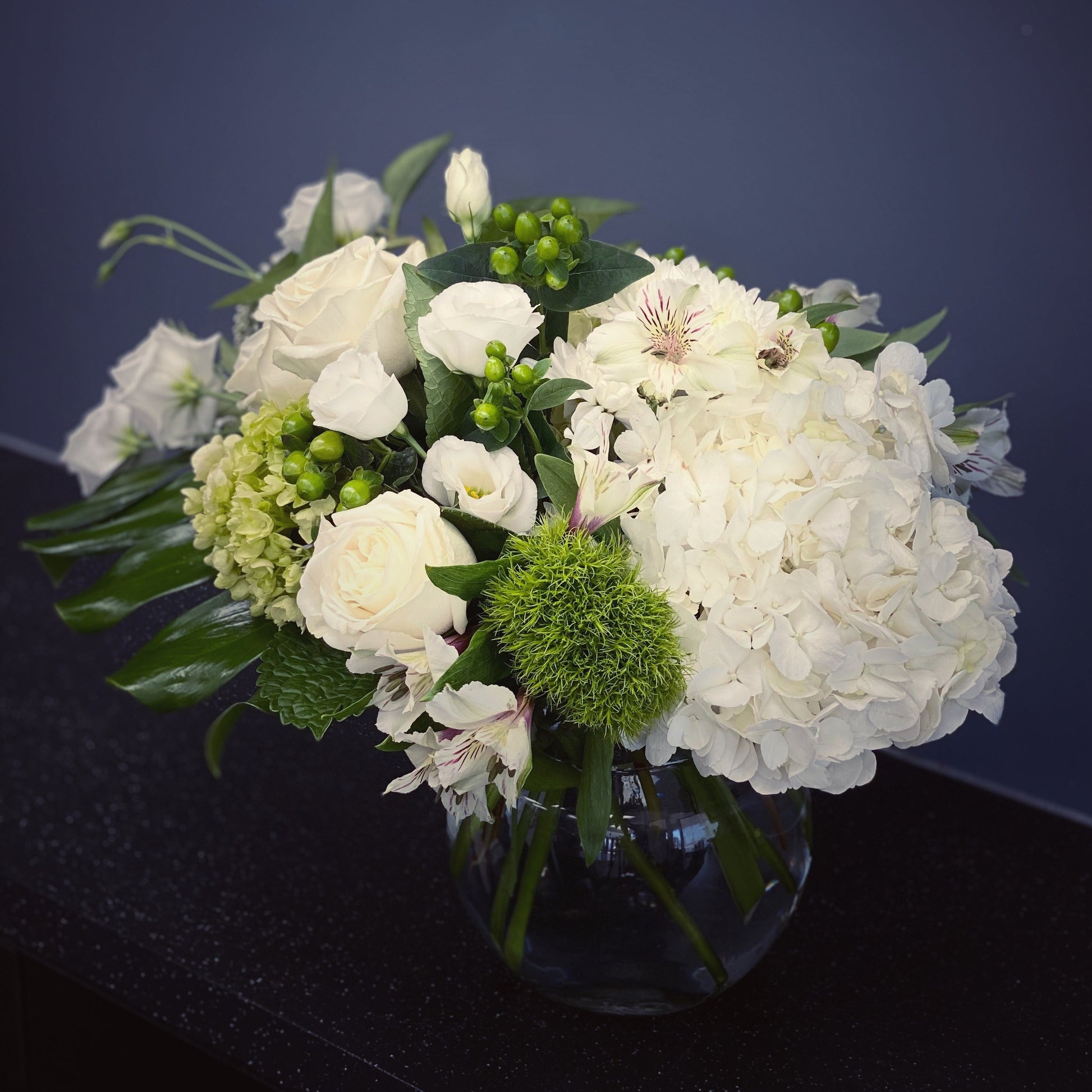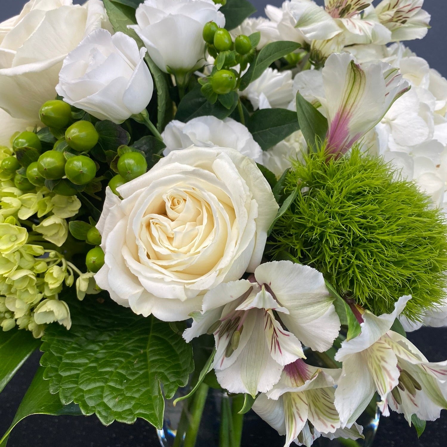 Welcome inner peace and tranquility with this thoughtful and refreshing bouquet of white roses, green hydrangea, and white lisianthus. Let it help you relax and feel more at ease.