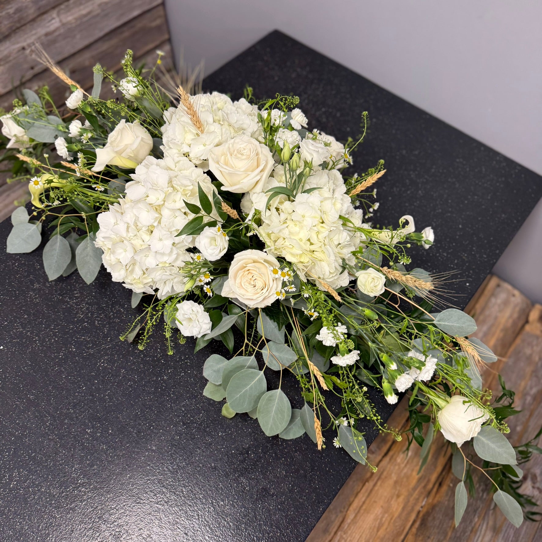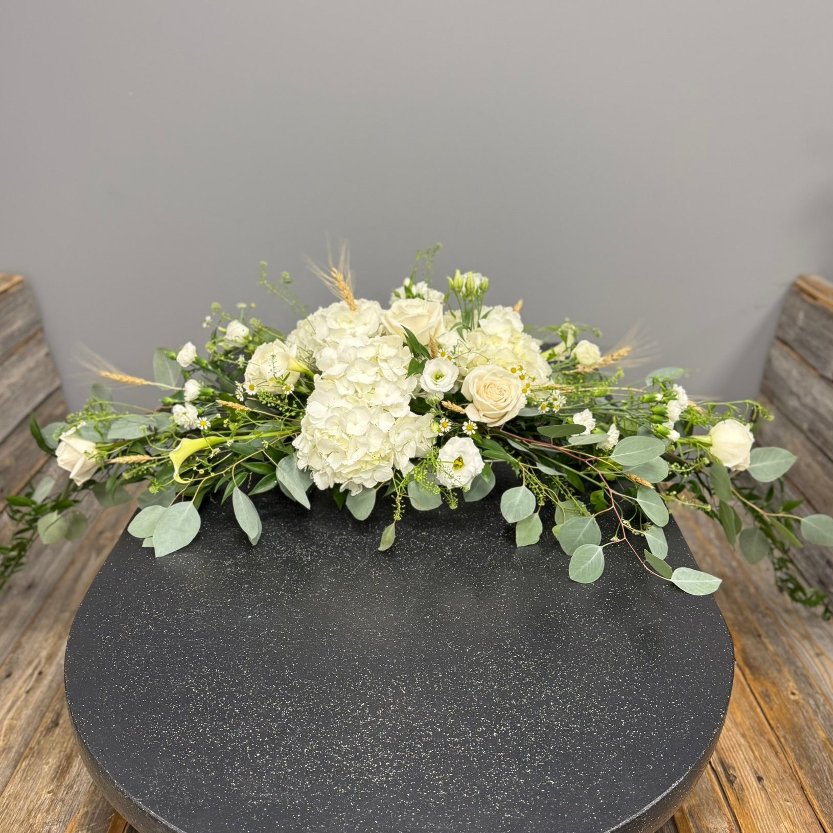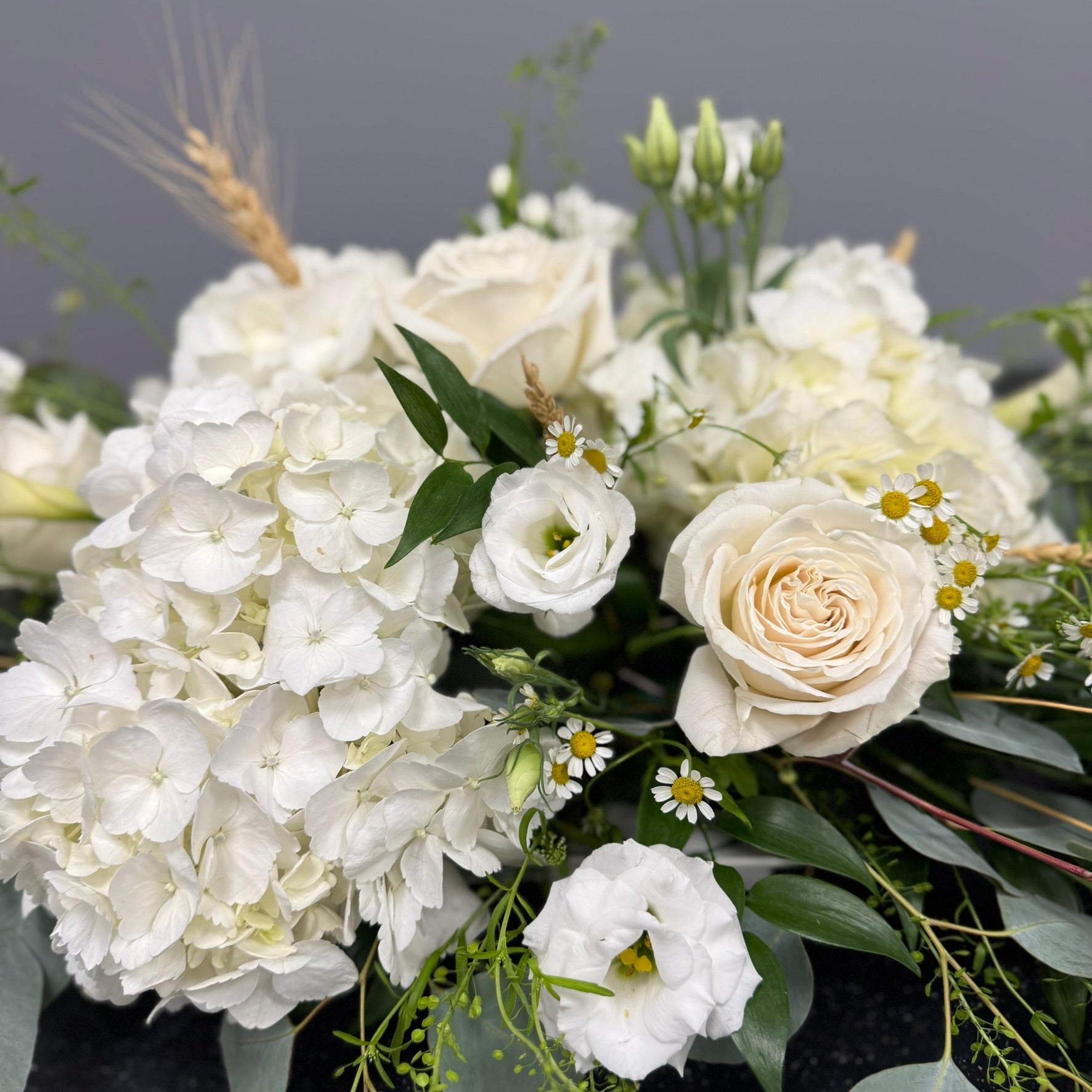 Discover understated elegance with this curated floral composition featuring lush hydrangea, creamy white lisianthus, and garden roses. Woven through with textural wheat and fragrant eucalyptus, each element has been selected to create a harmonious arrangement that speaks to refined taste. Ideal for celebrations, corporate settings, or as a luxurious gift, this bouquet embodies quiet sophistication and enduring charm.