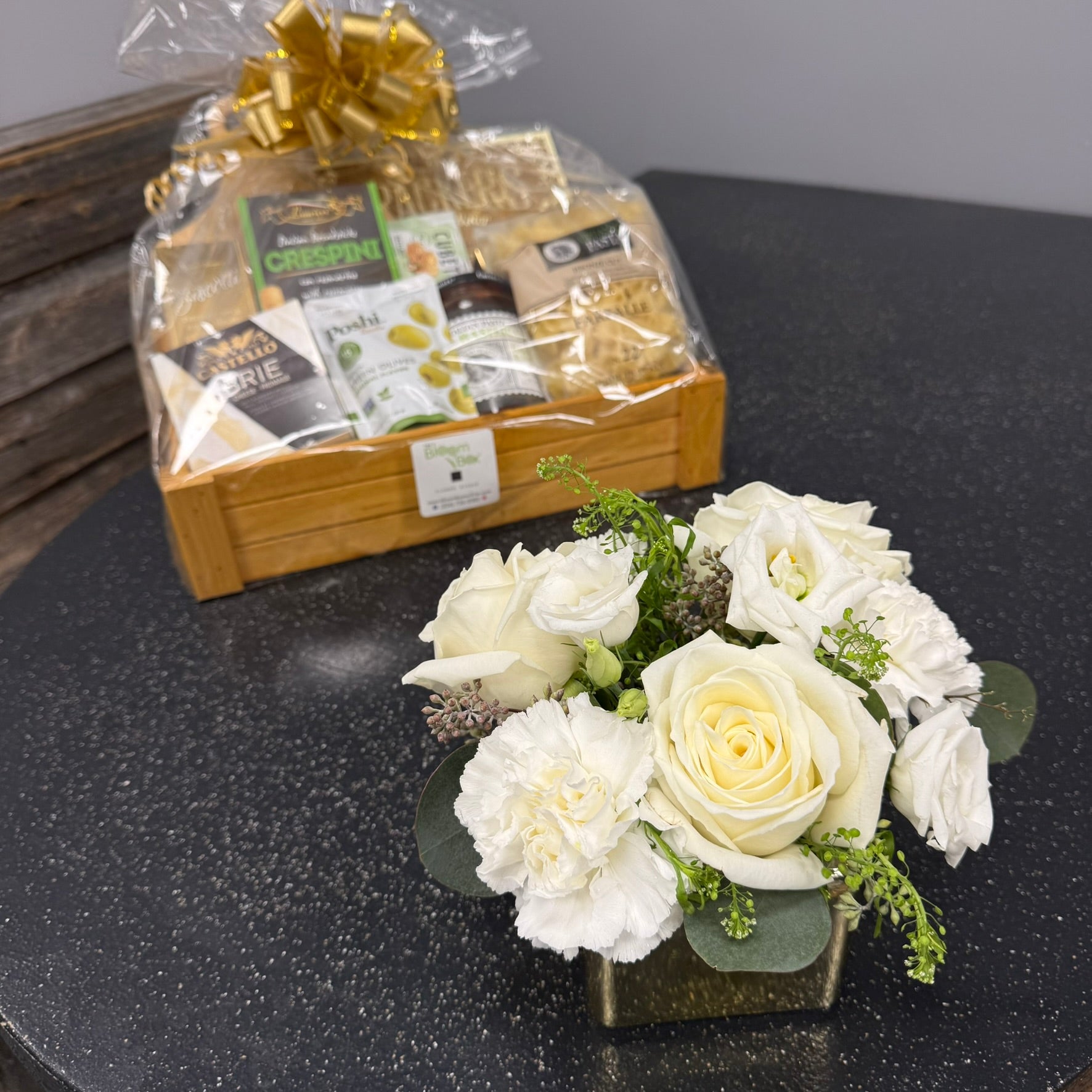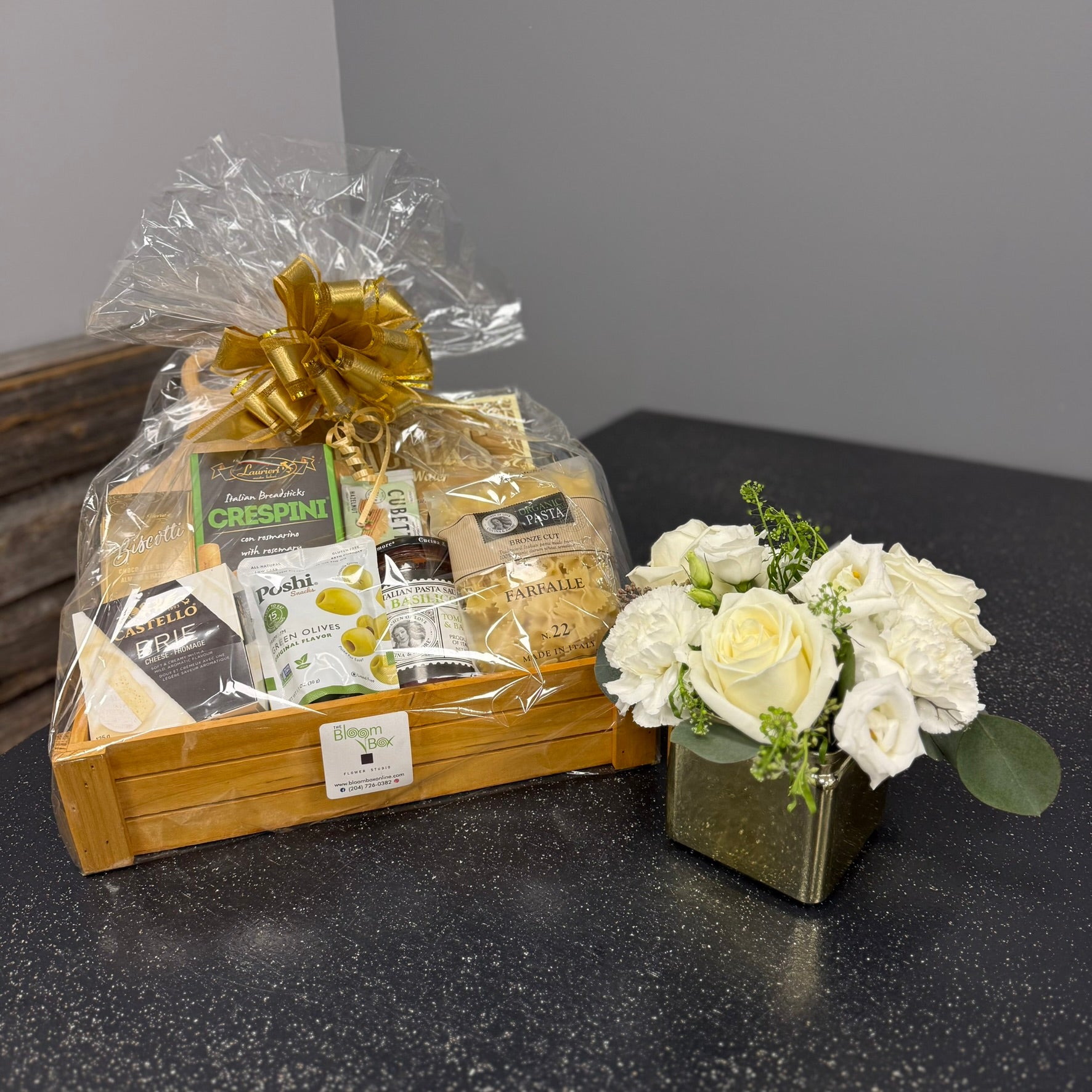 Celebrate love this Valentine's Day with an exquisitely curated dinner for two. This romantic collection delivers everything needed for an unforgettable Italian evening: organic penne rigate and basilico pasta sauce create the perfect main course, while Castello brie, water crackers, and breadsticks serve as elegant appetizers. Briny green olives add sophisticated flavor, and the meal concludes with chocolate-dipped biscotti, hazelnut wafers, and cappuccino. Presented in a rustic wooden crate with a practical bamboo cutting board, this gift is crowned with a pristine white floral cube—the ideal centerpiece for your intimate table. A thoughtful expression of affection for those who appreciate culinary refinement and meaningful moments shared together.