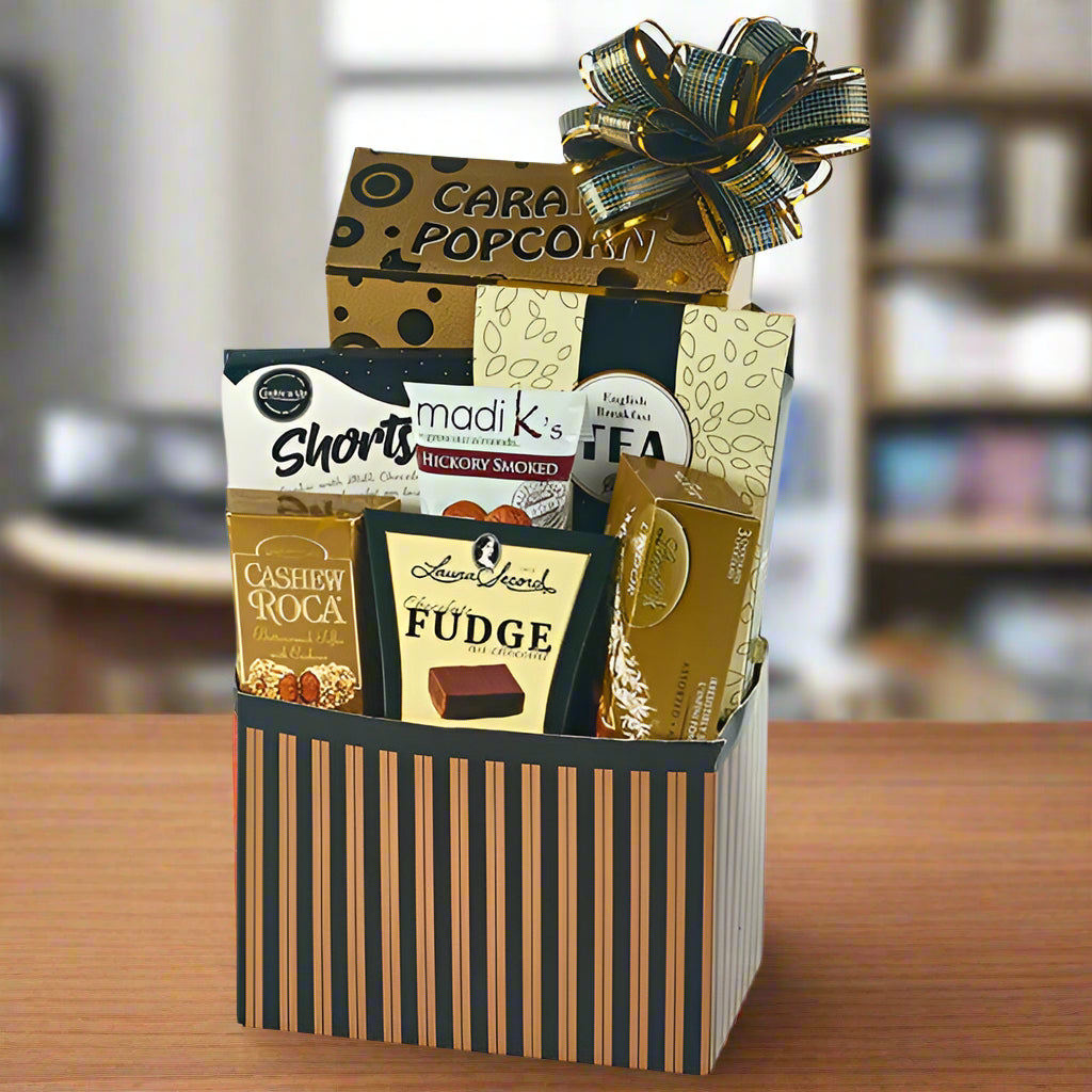 Indulge in Tea Time with 8 delicious treats including Lindt chocolate, Cashew Roca, smoked almonds, and more! Enjoy world-famous Choc Meltaways, Choc Chip Cookies, English Breakfast Tea, and a decadent Choc Fudge Brownie. Perfect for a cozy day in or as a gift for your foodie friends.