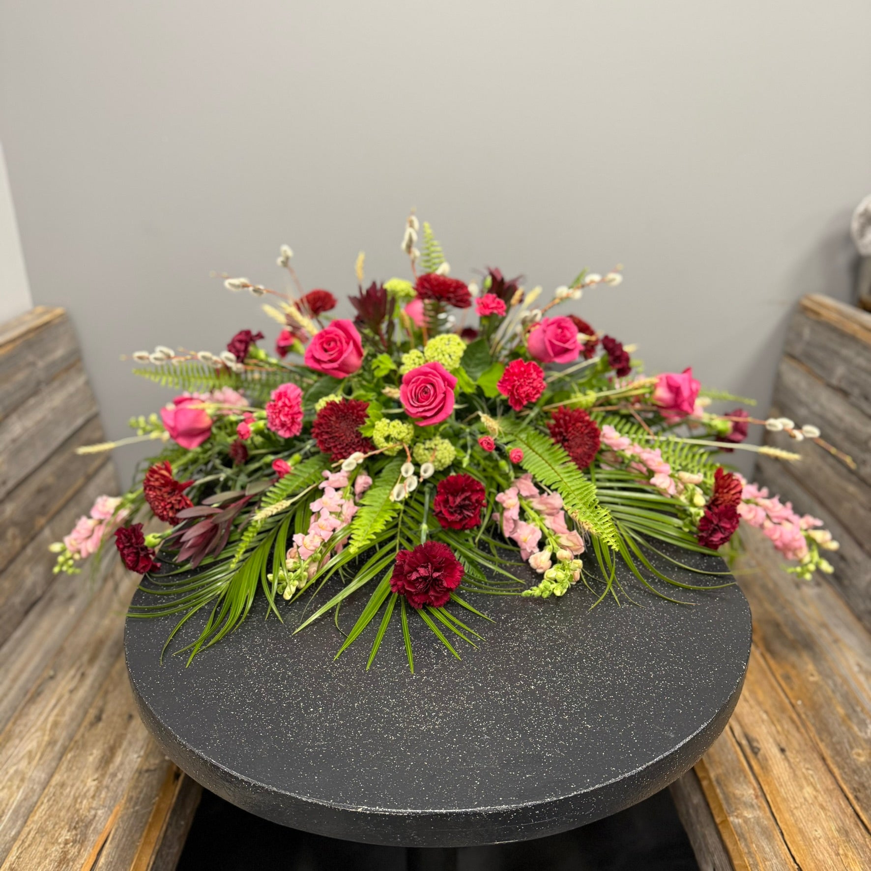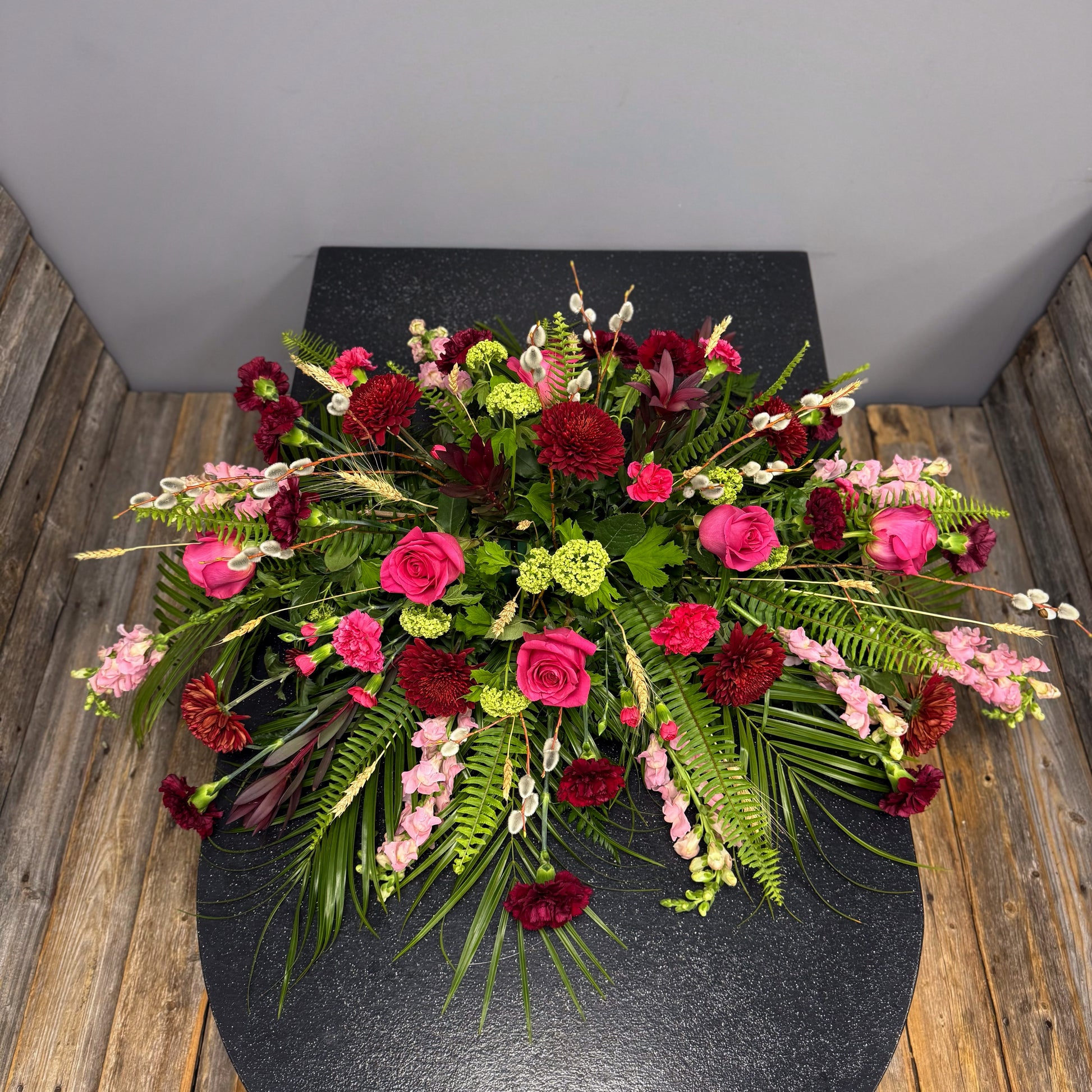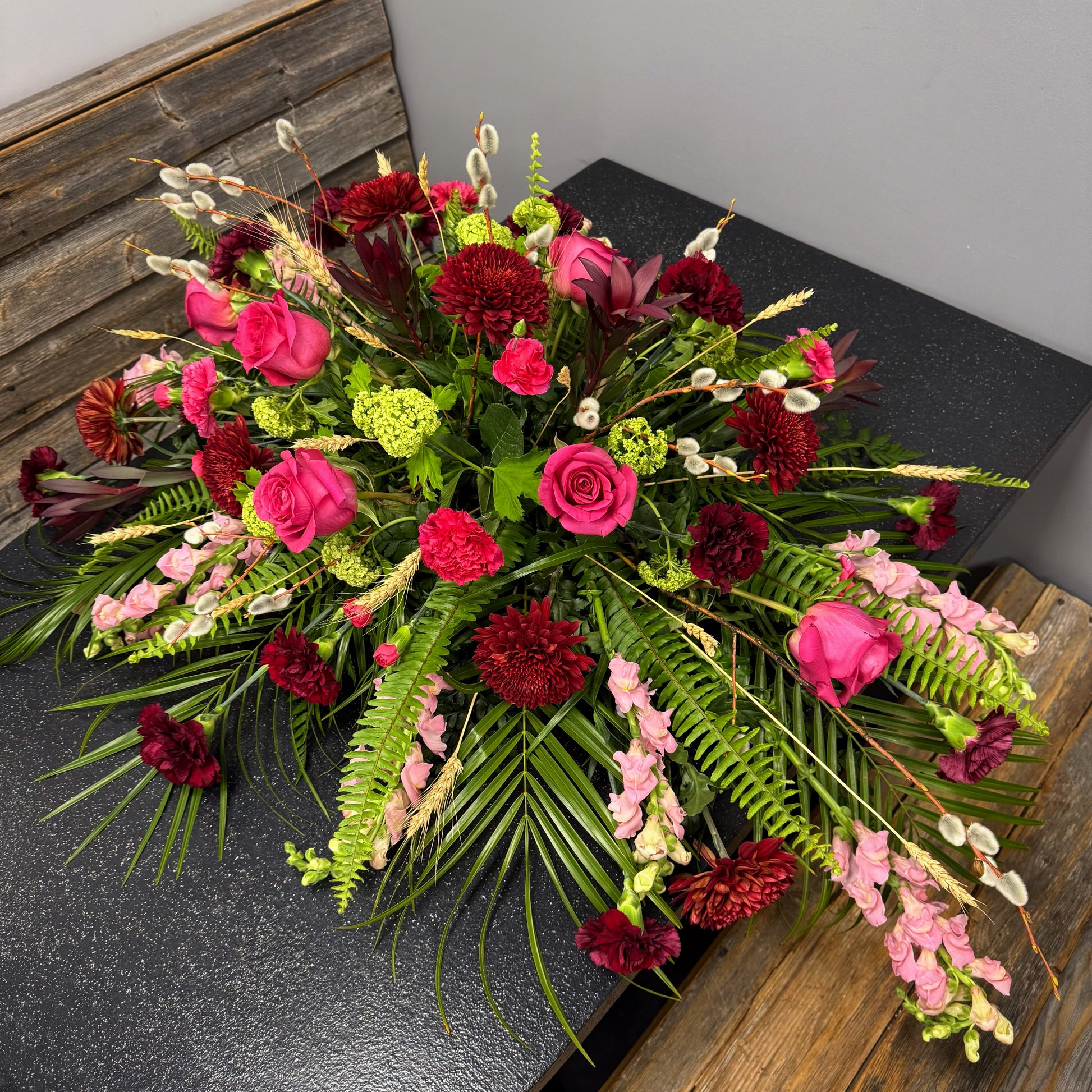 Honor your loved one with The Alberta casket spray, featuring dark pink and burgundy flowers with delicate ferns and palms. This soft and feminine arrangement also includes wheat, pussy willows, and mini callas, perfect for a country girl at heart. A beautiful tribute to Alberta Neufeld, this spray will bring comfort and love during this difficult time.