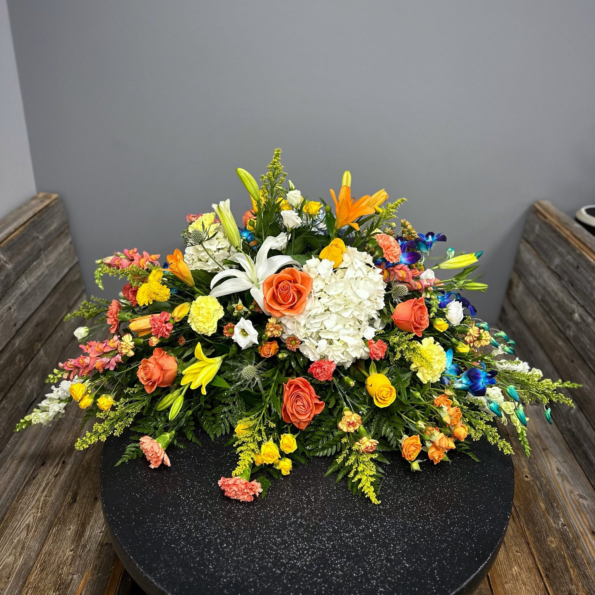 The Ann is a beautiful flower casket tribute featuring a stunning combination of orange, white, and yellow lilies, hydrangea, carnations, and orchids. This tribute is a perfect way to honor and celebrate the life of a loved one. With its vibrant colors and elegant design, The Ann is sure to bring comfort and beauty to any funeral or memorial service.