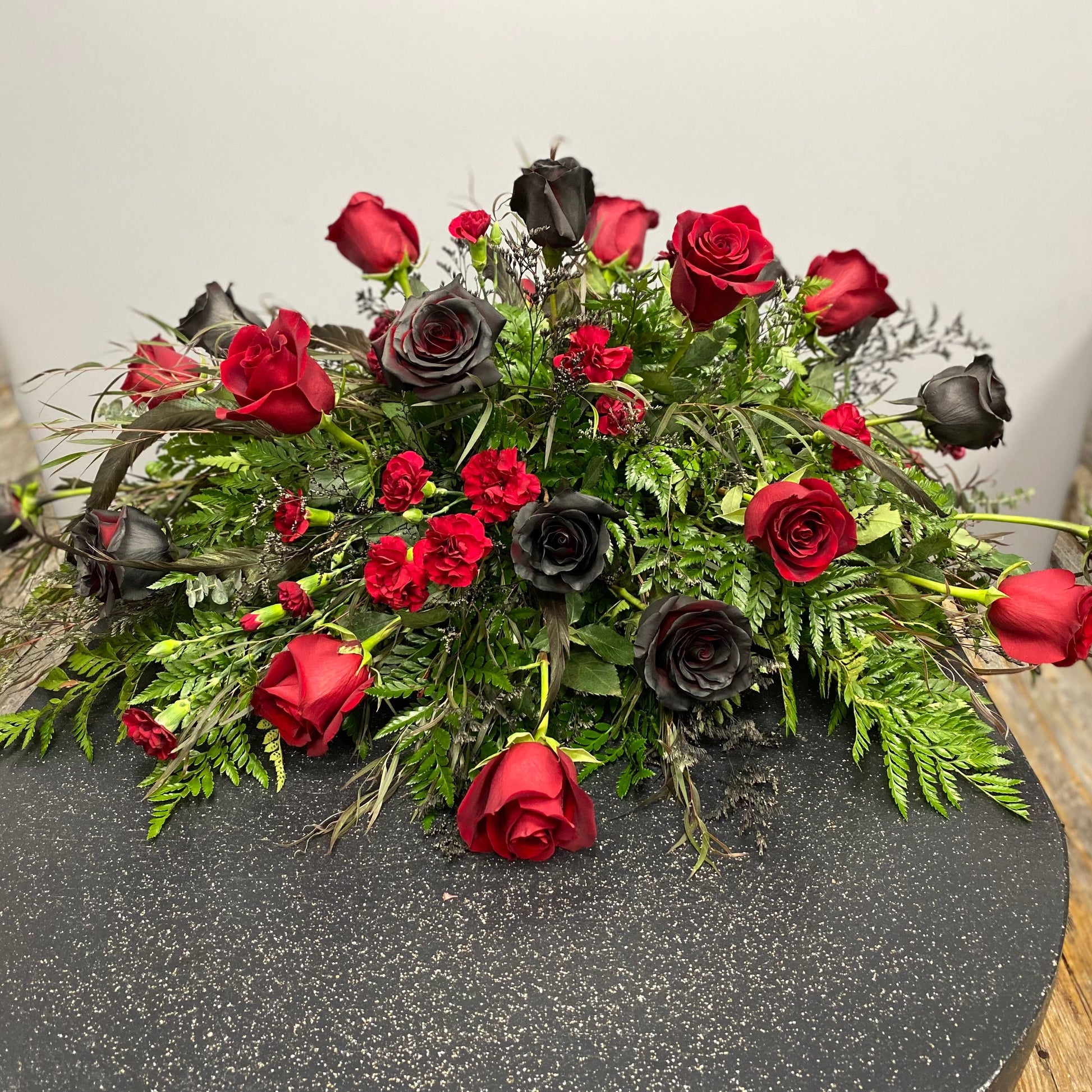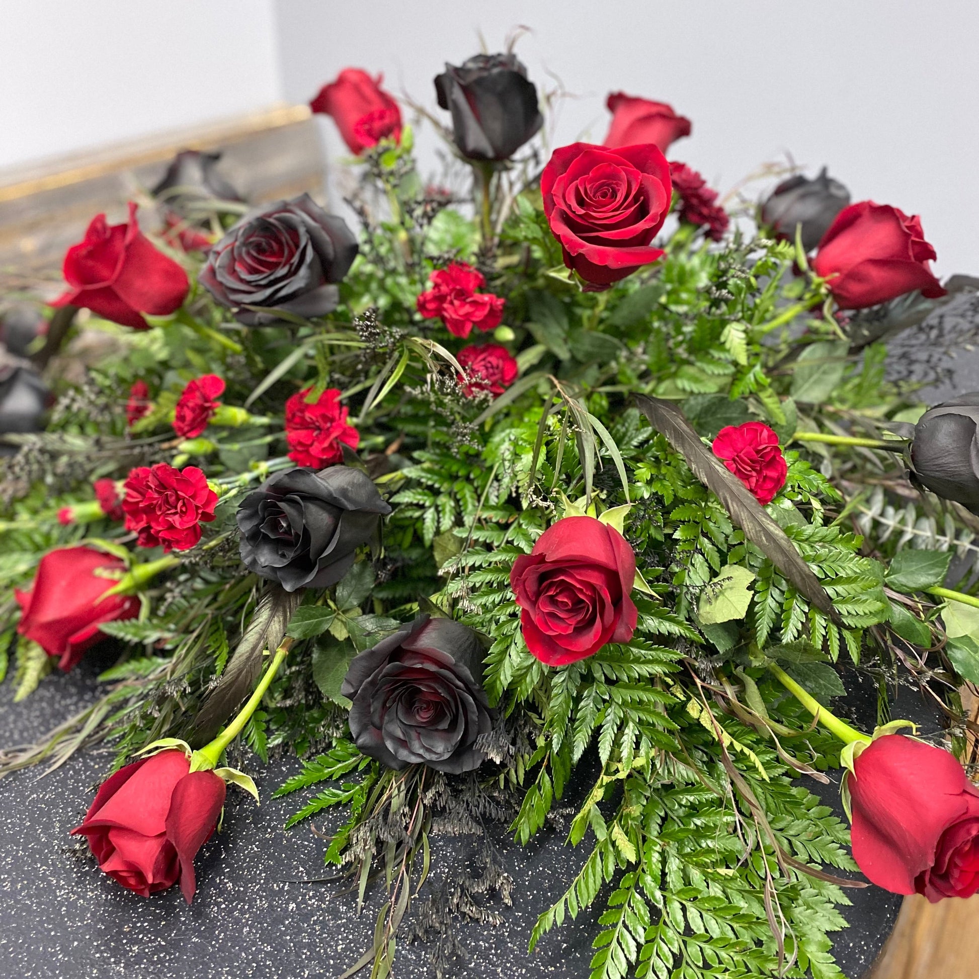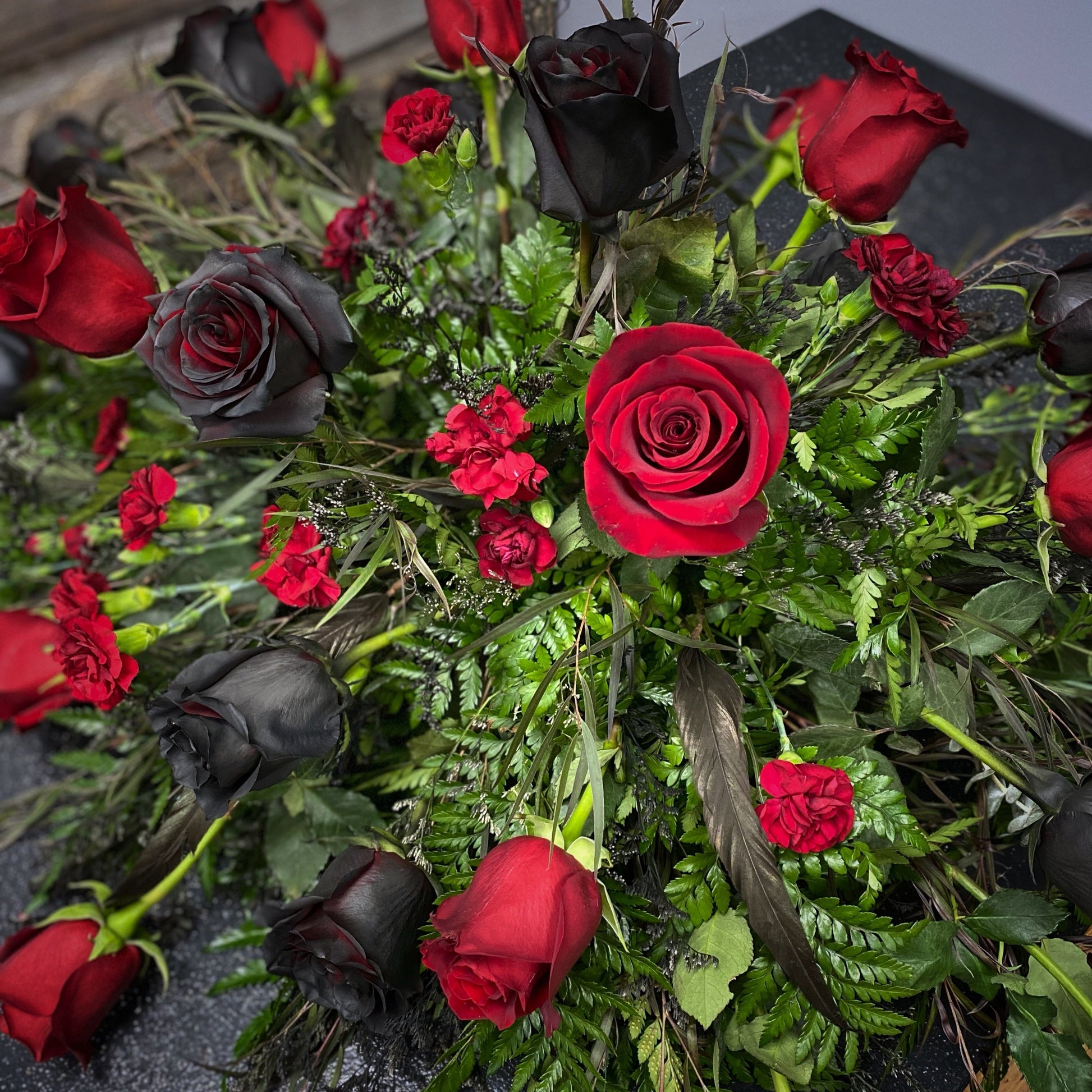 The Ashe is a beautiful casket spray featuring striking red and black roses, accented by deep burgundy mini carnations. With its unique and elegant design, it is the perfect way to honor your loved one's memory. Let The Ashe provide comfort and support during this difficult time.