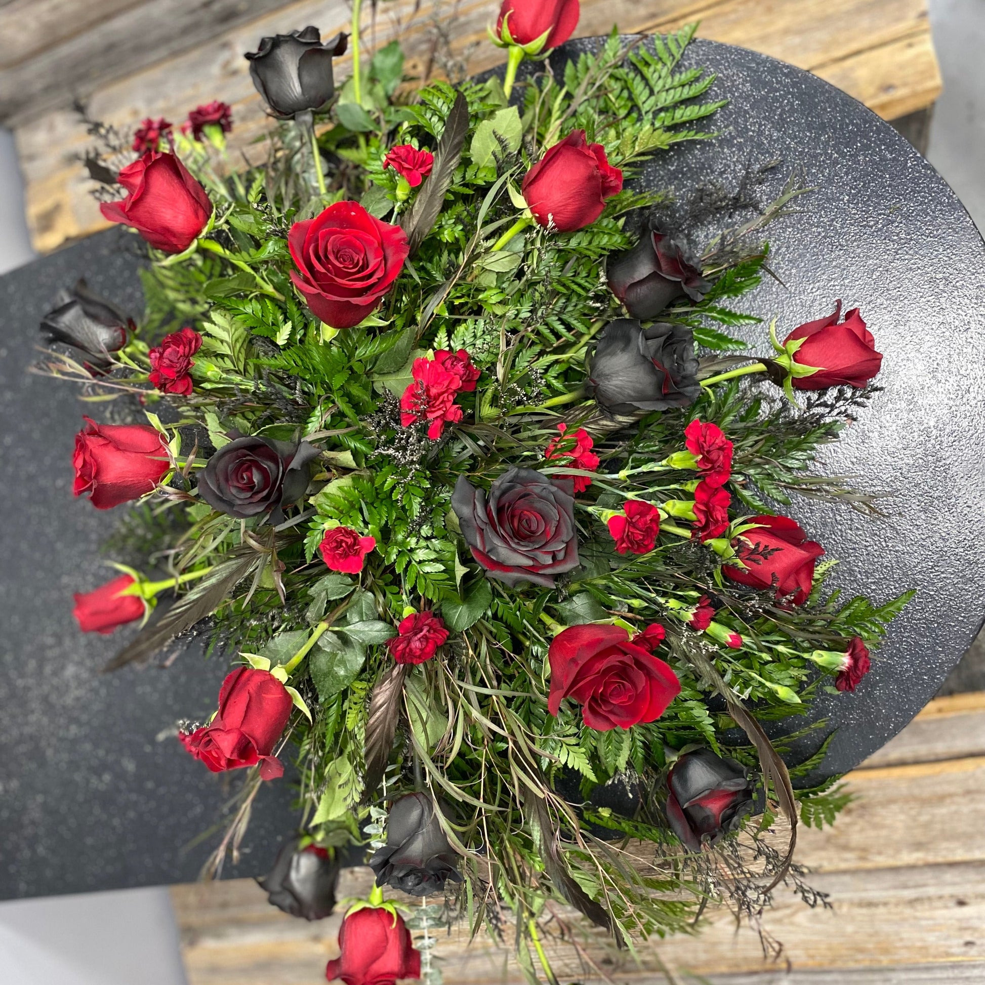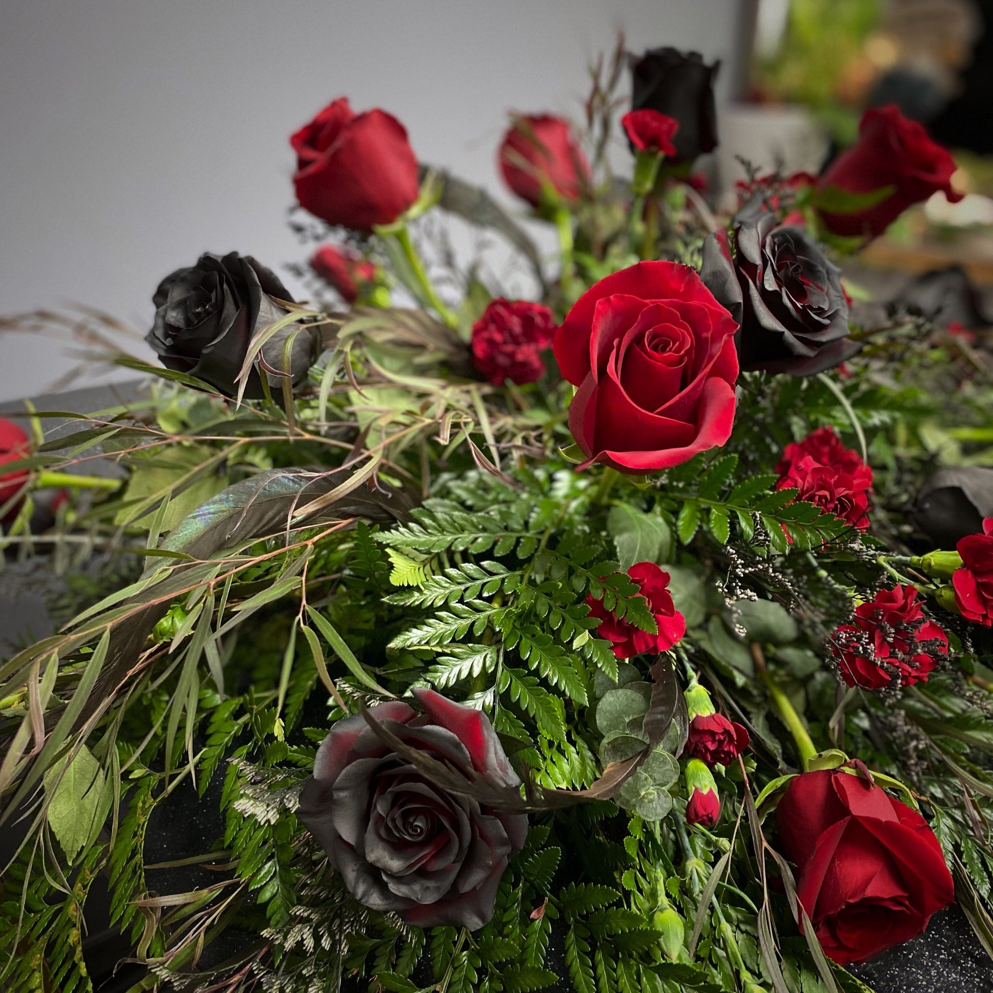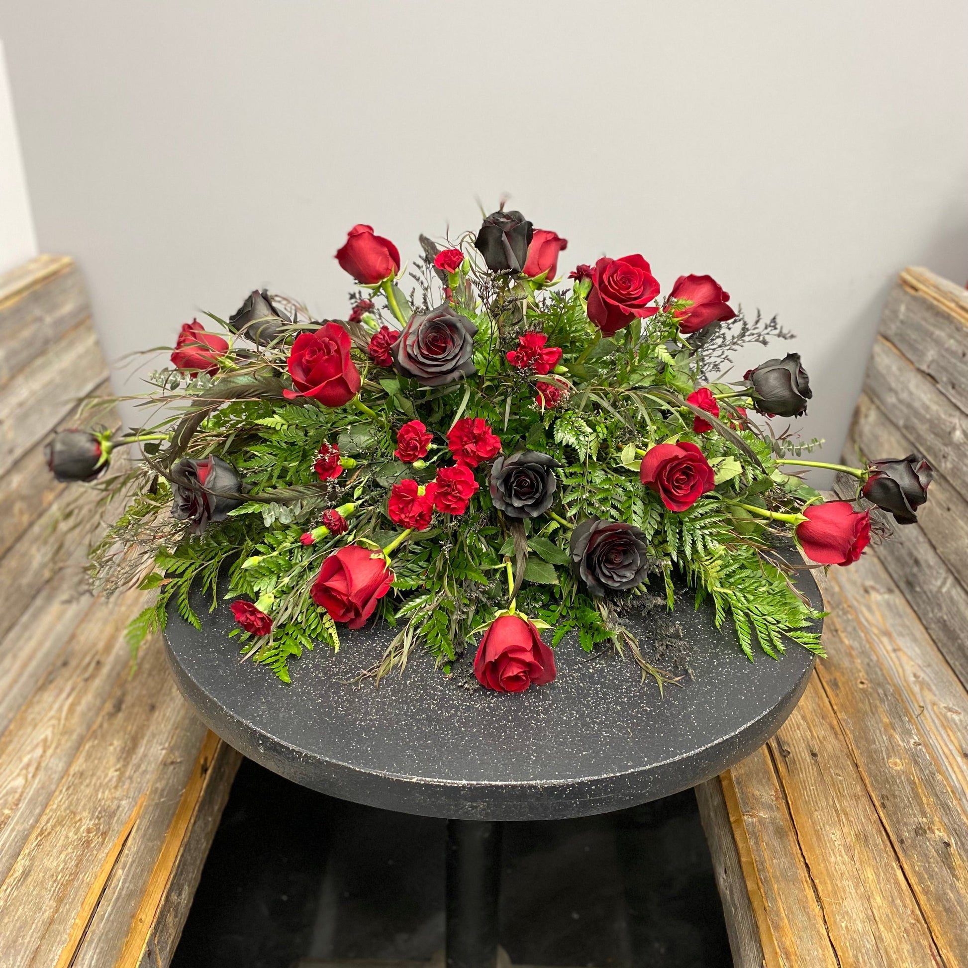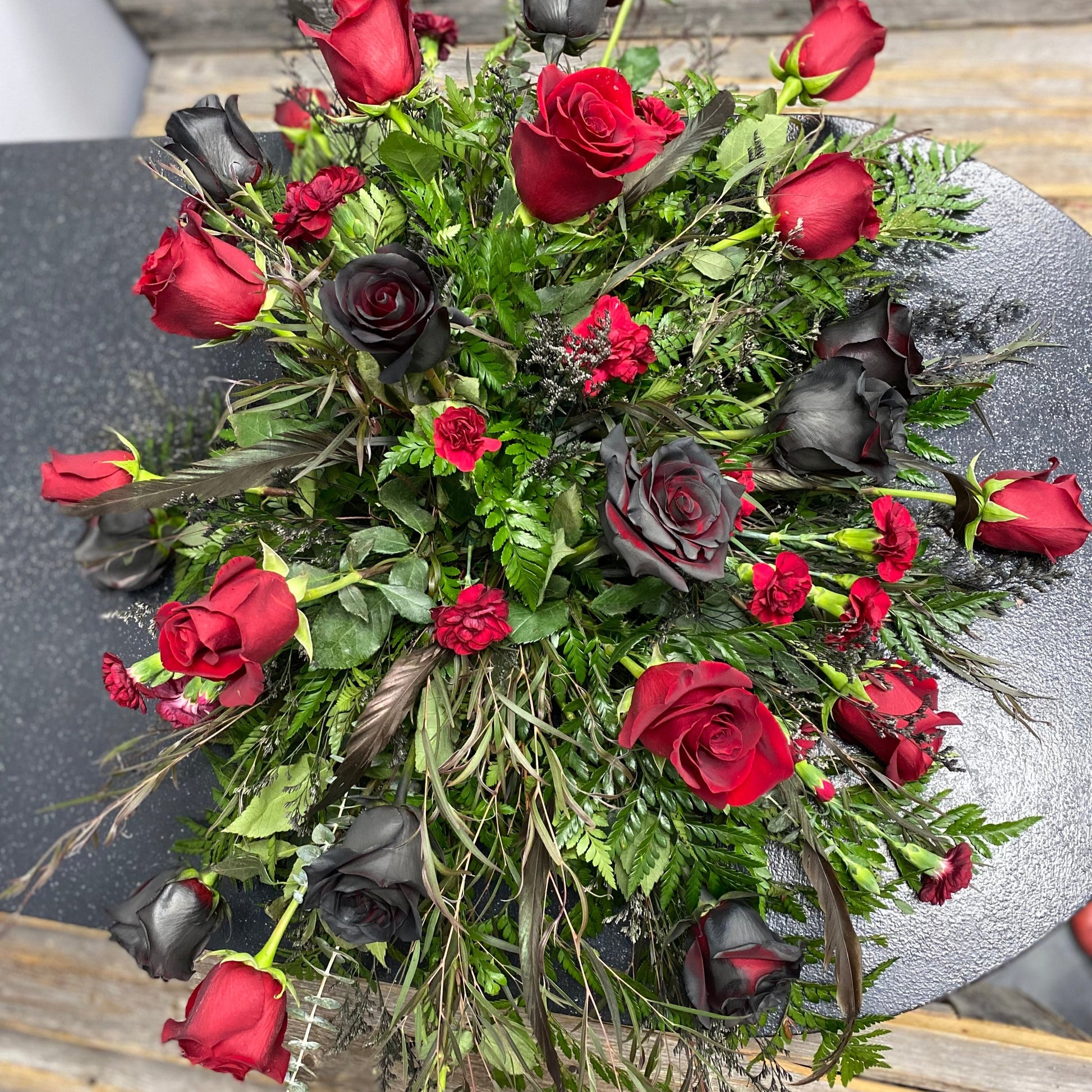 The Ashe is a beautiful casket spray featuring striking red and black roses, accented by deep burgundy mini carnations. With its unique and elegant design, it is the perfect way to honor your loved one's memory. Let The Ashe provide comfort and support during this difficult time.