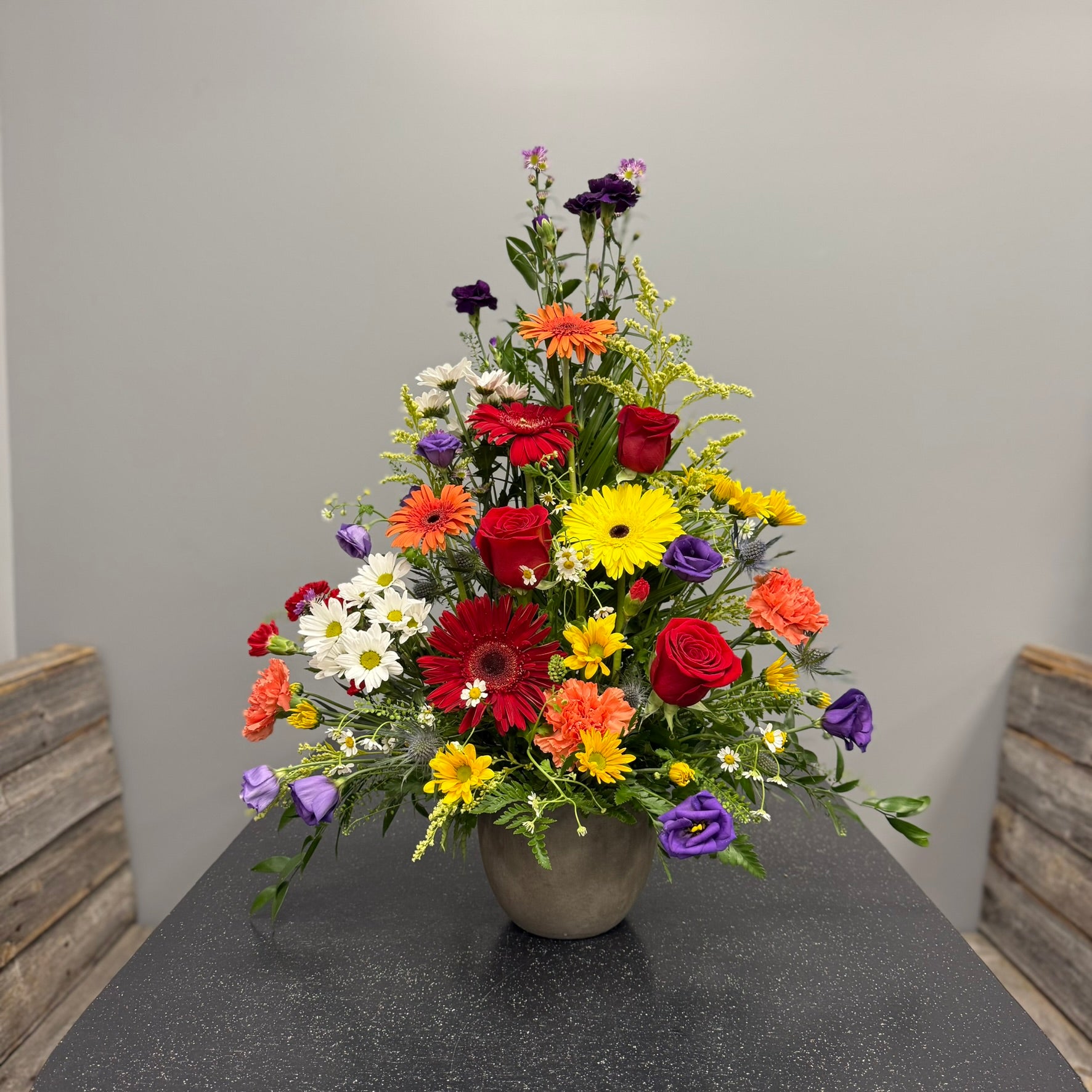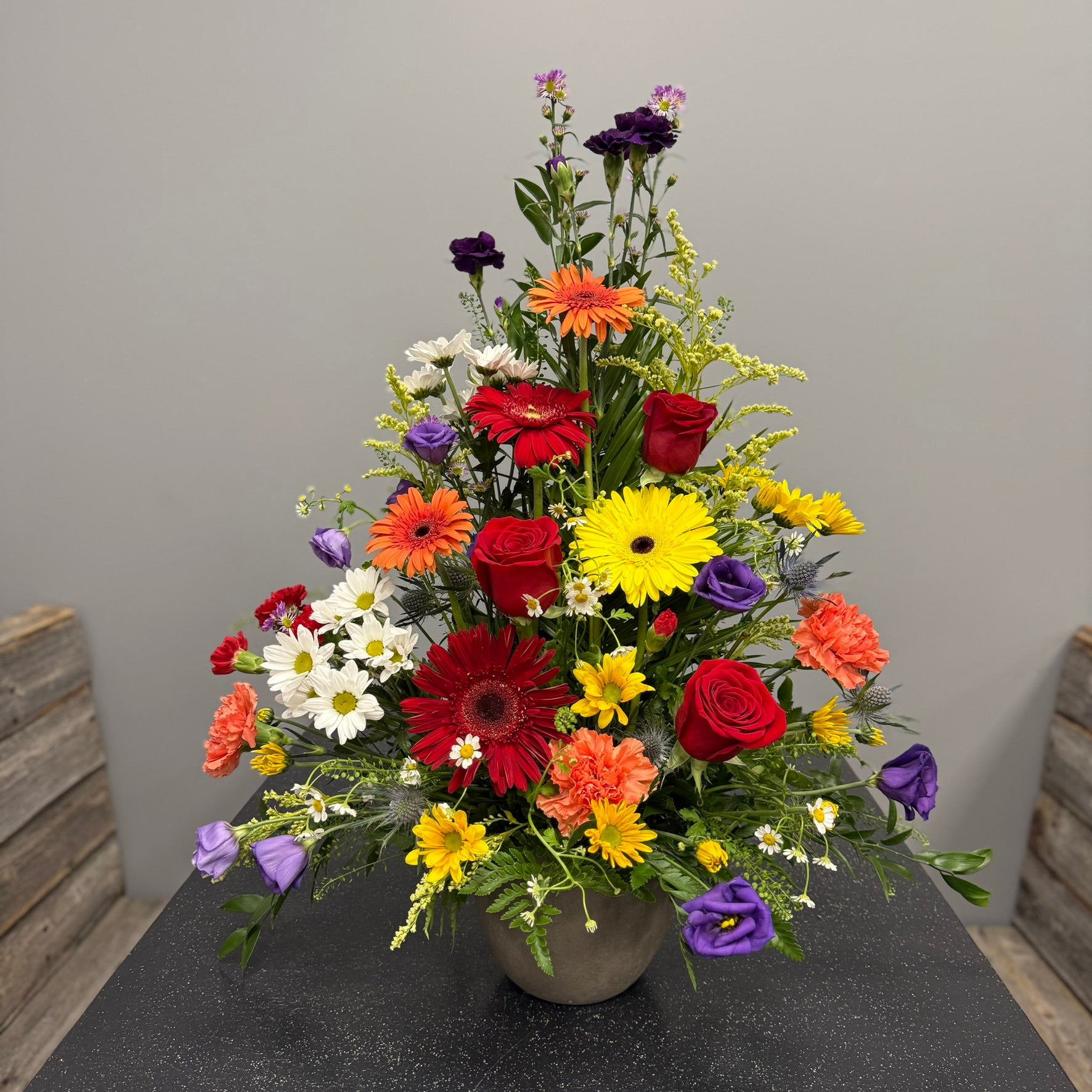 The Betty arrangement offers a striking blend of bold colors including yellow, red, orange, white, and purple, expertly composed in a classic A-line shape. Featuring gerbera daisies, roses, carnations, daisies, lisianthus, and yellow asters, this bouquet combines vivid hues and varied floral textures to create a balanced, eye-catching display ideal for adding vibrant elegance to any setting.