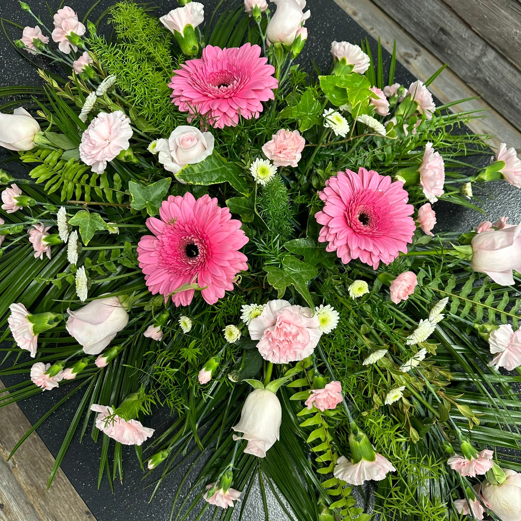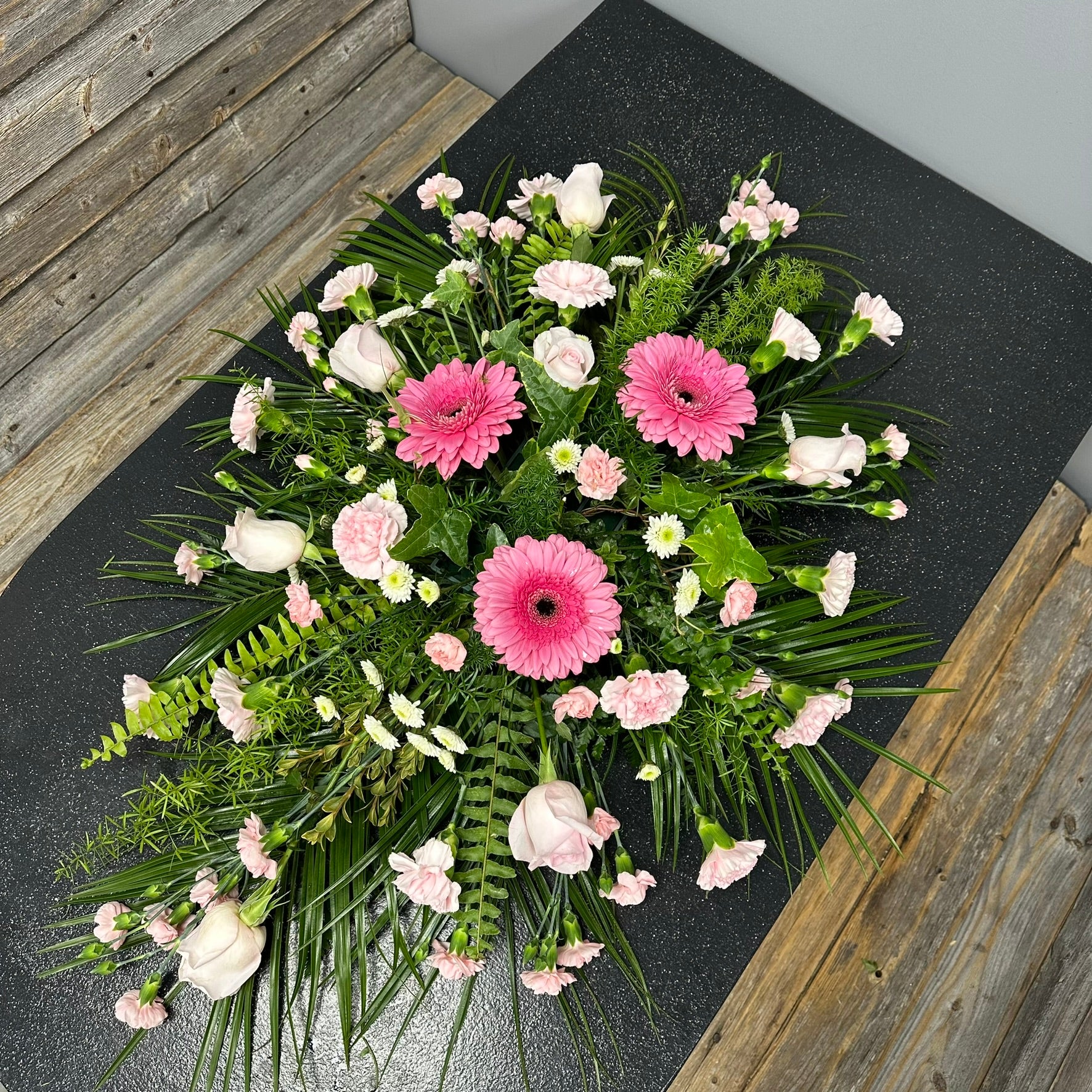 The Cecile standing spray tribute honors your loved one with beautiful pink shades of carnations, roses, and gerbera daisies. A heartfelt and vibrant tribute to celebrate and remember a cherished life.