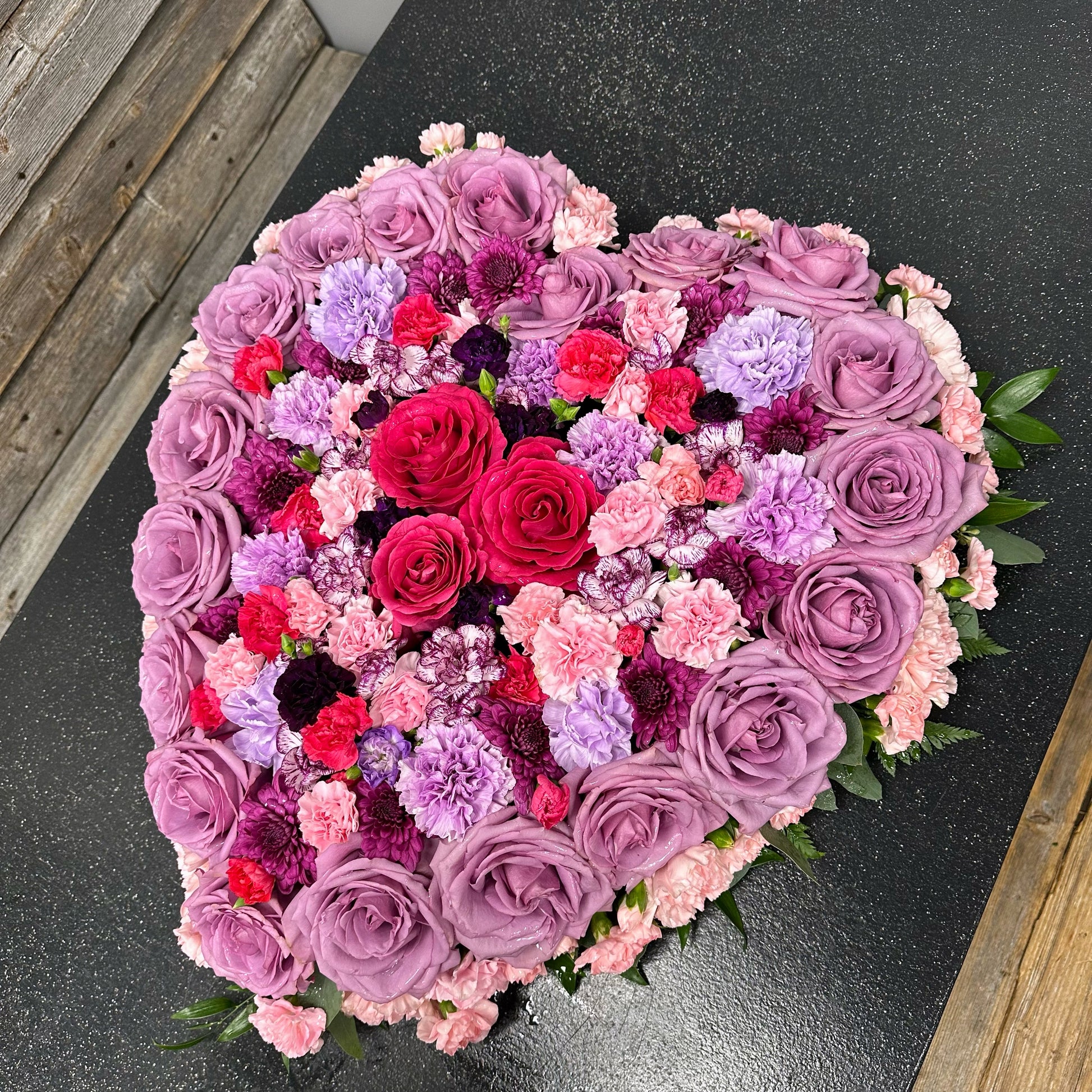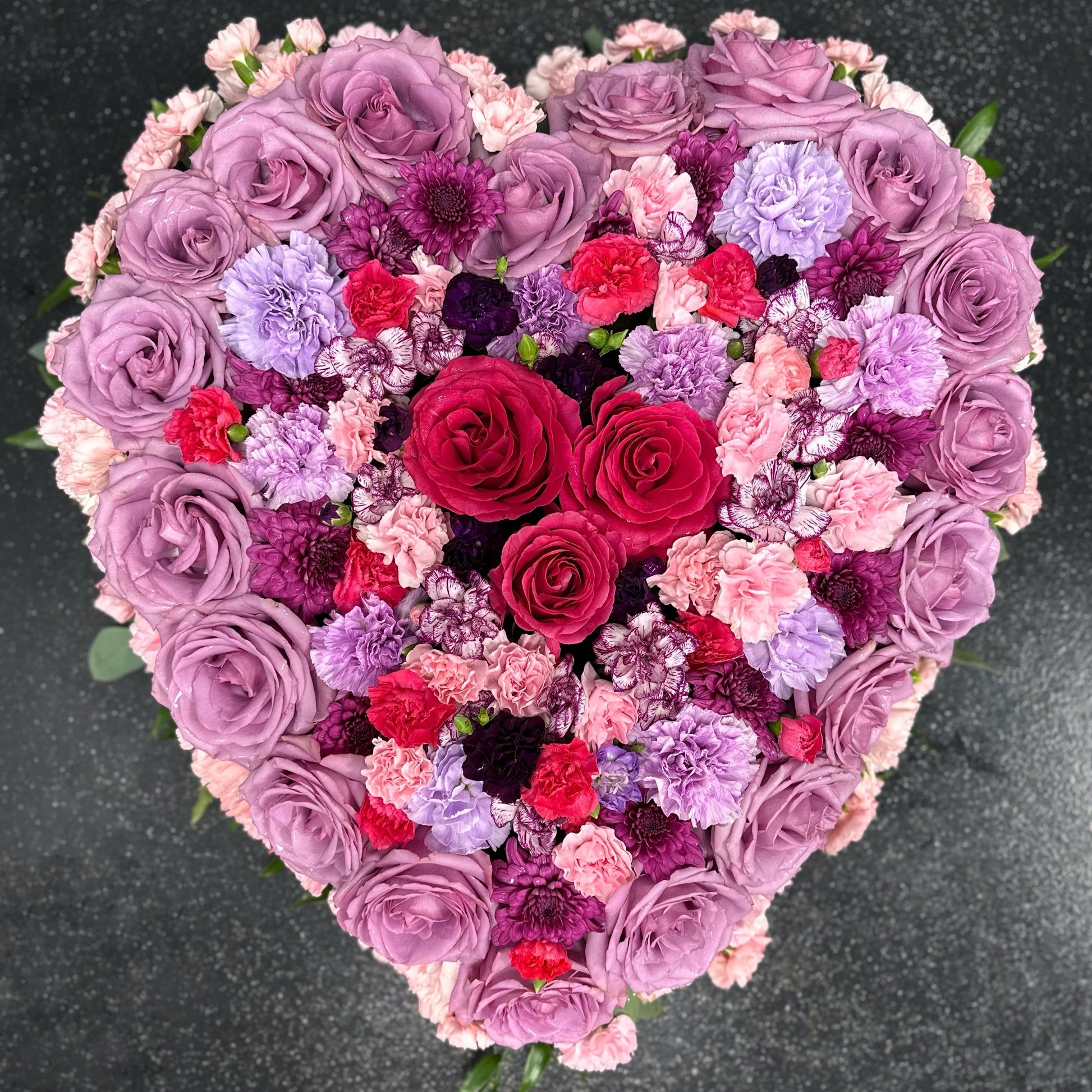 Honor your loved one with The Charlotte, a heart shaped standing spray in beautiful pink and purple hues. Adorned with delicate roses, mini carnations and carnations, this tribute is a heartfelt way to show your support and love during difficult times.