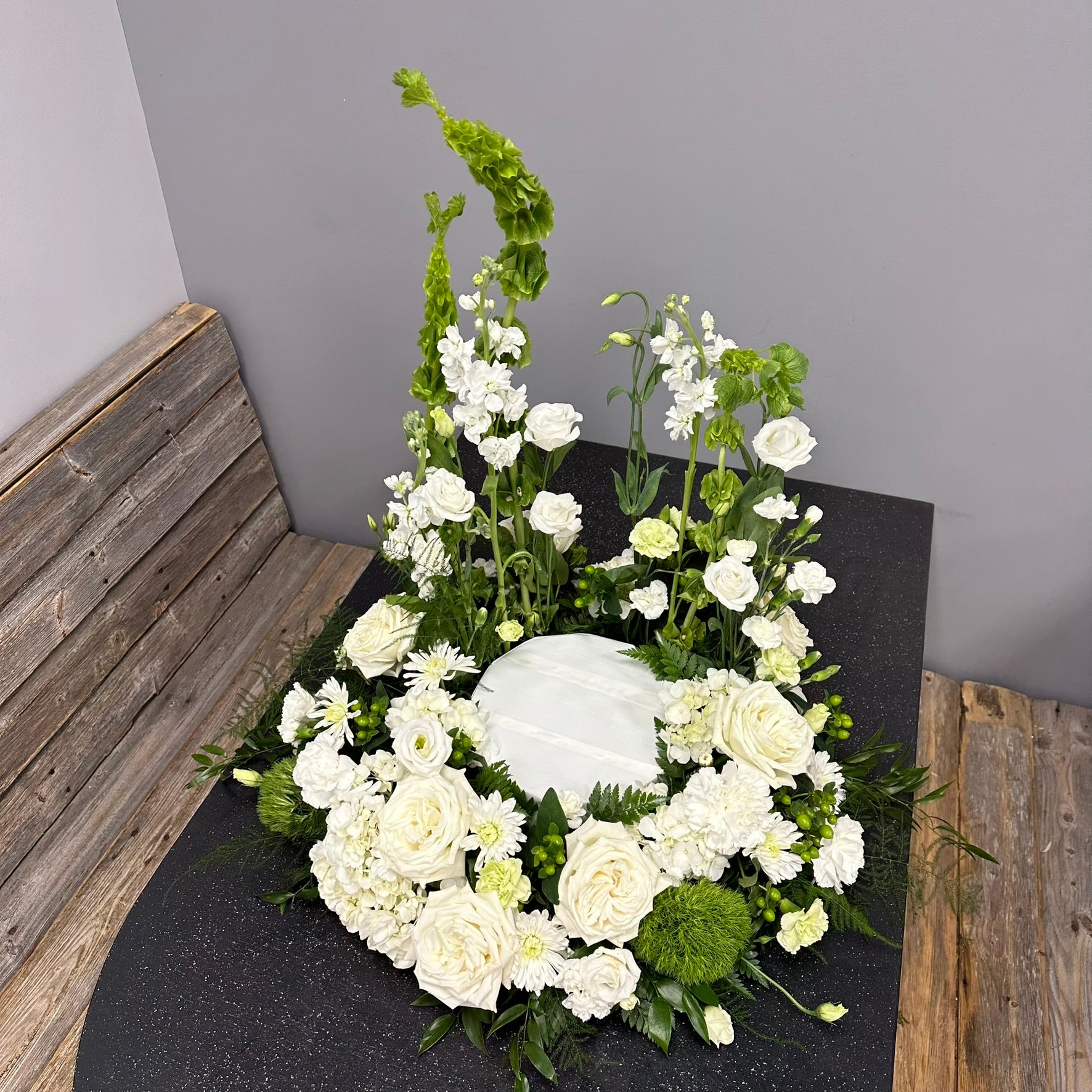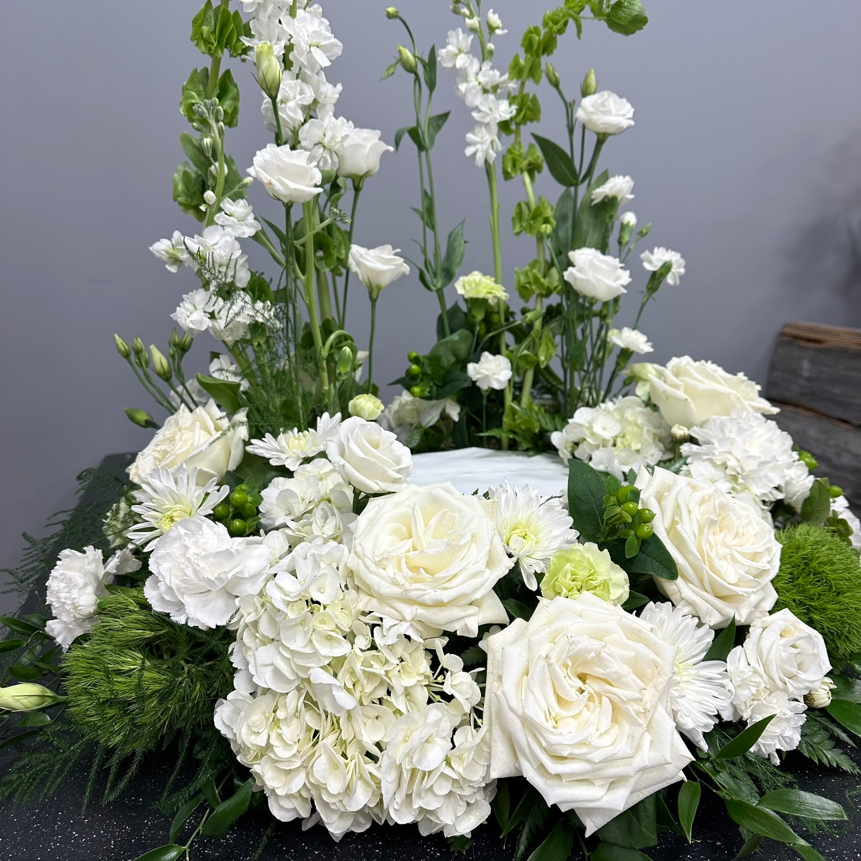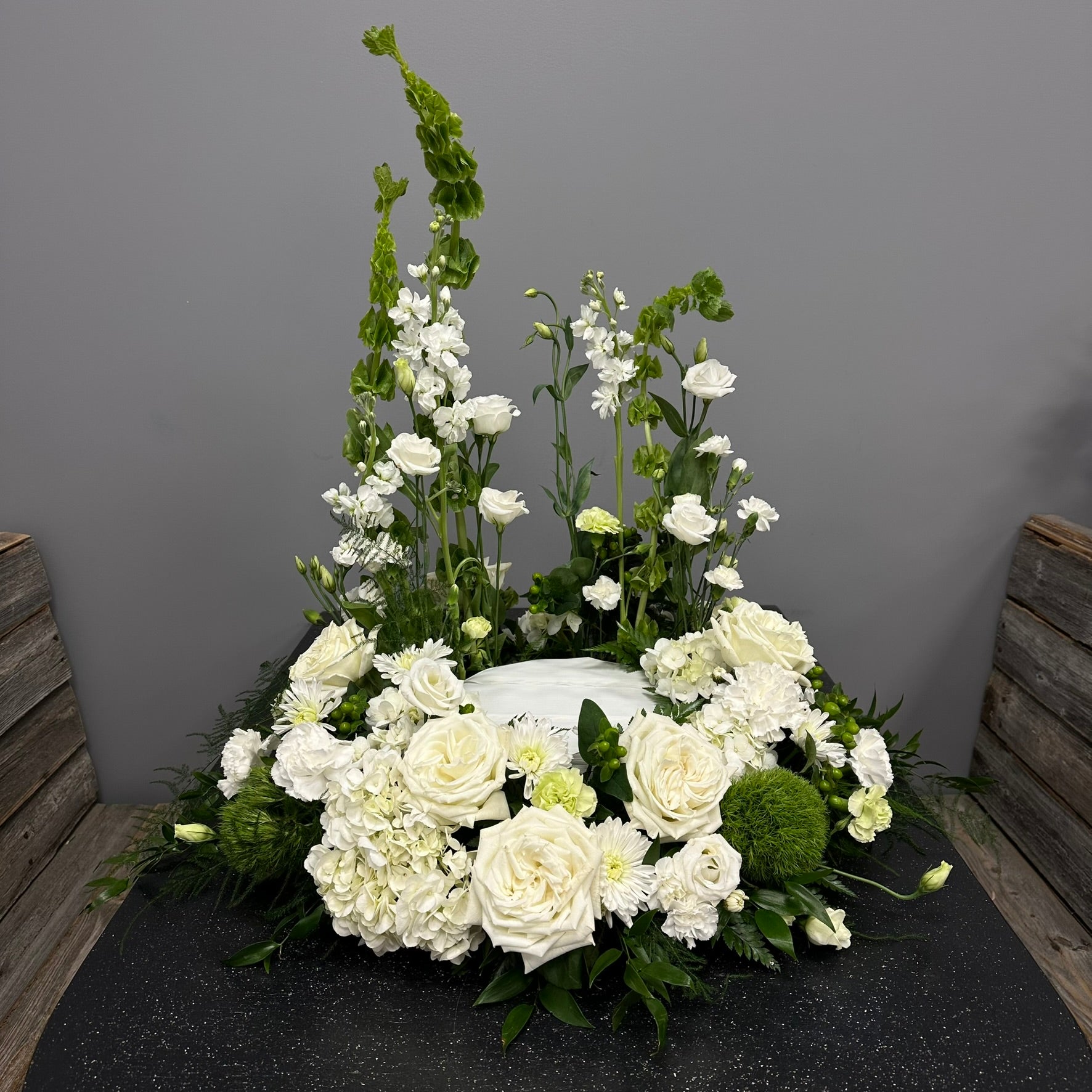 Honor and celebrate a life with The Edgar. This elegant urn tribute features a beautiful arrangement of white roses, hydrangea, daisies, and green dianthys, symbolizing love, purity, and new beginnings. A thoughtful way to express sympathy and show support in a time of loss.