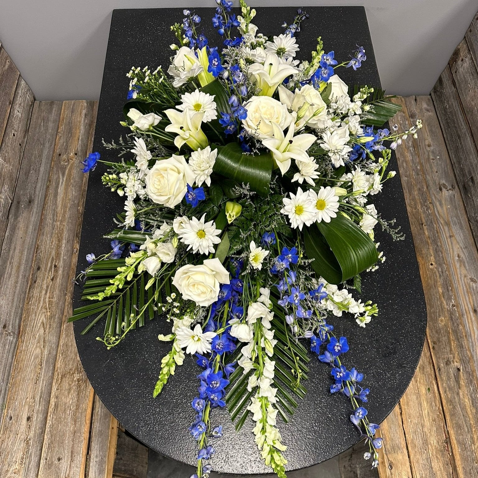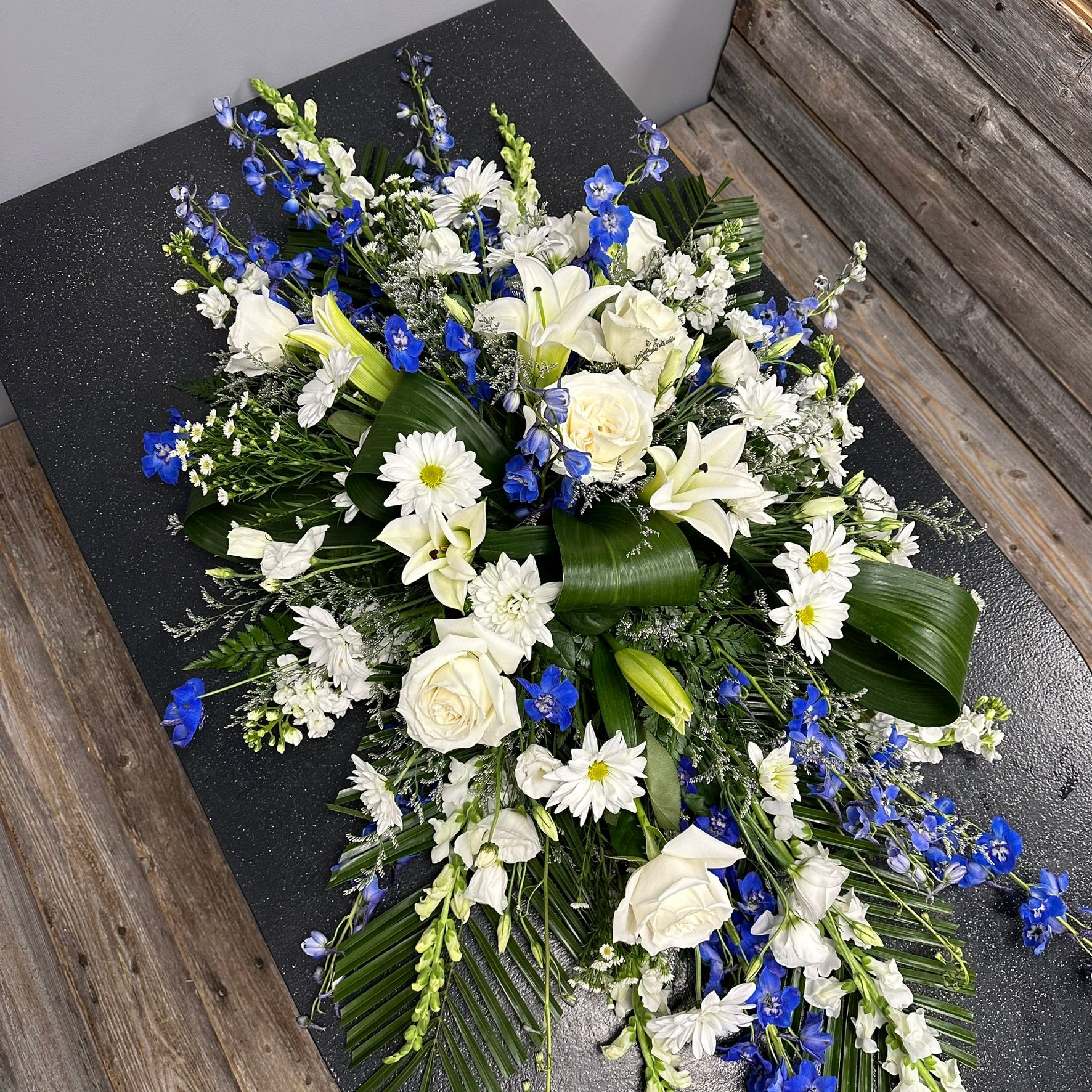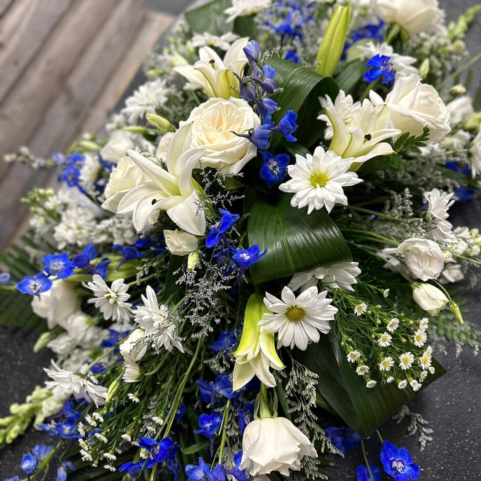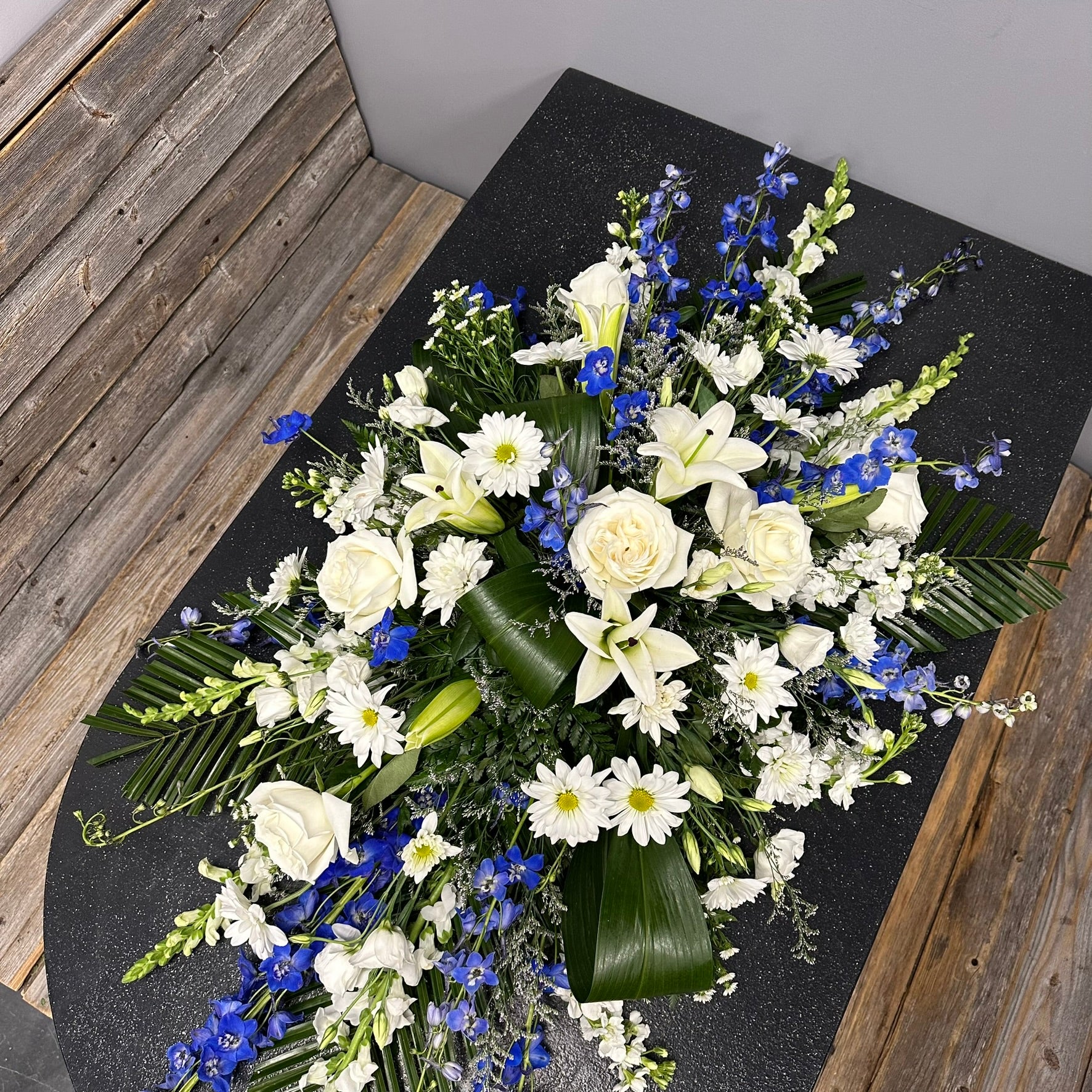 The Ellen standing spray is a beautiful tribute featuring a variety of white flowers, including roses, lilies, daisies, stock, snap dragons, and blue delphinium. Honor your loved one with this elegant and heartfelt arrangement.