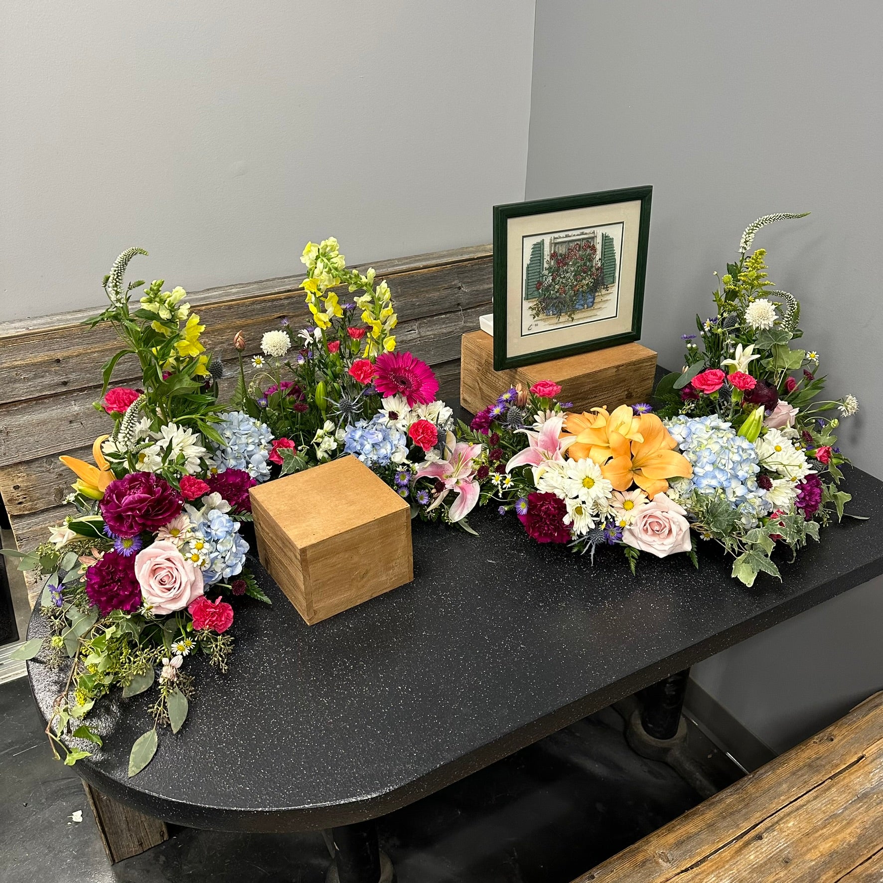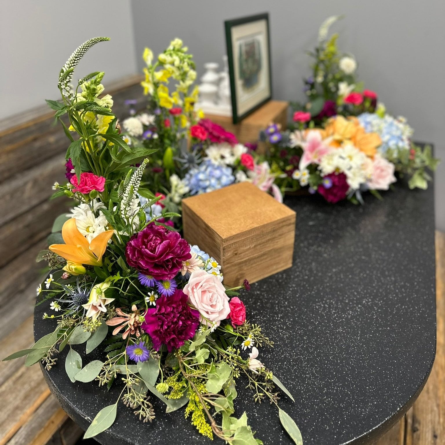 The Gracie is a beautiful "S" shaped urn tribute that embraces your loved one's memory. Featuring a stunning array of pink, white, orange, and purple flowers including lilies, blue hydrangea, and daisies, it's a heartfelt way to honor their life.