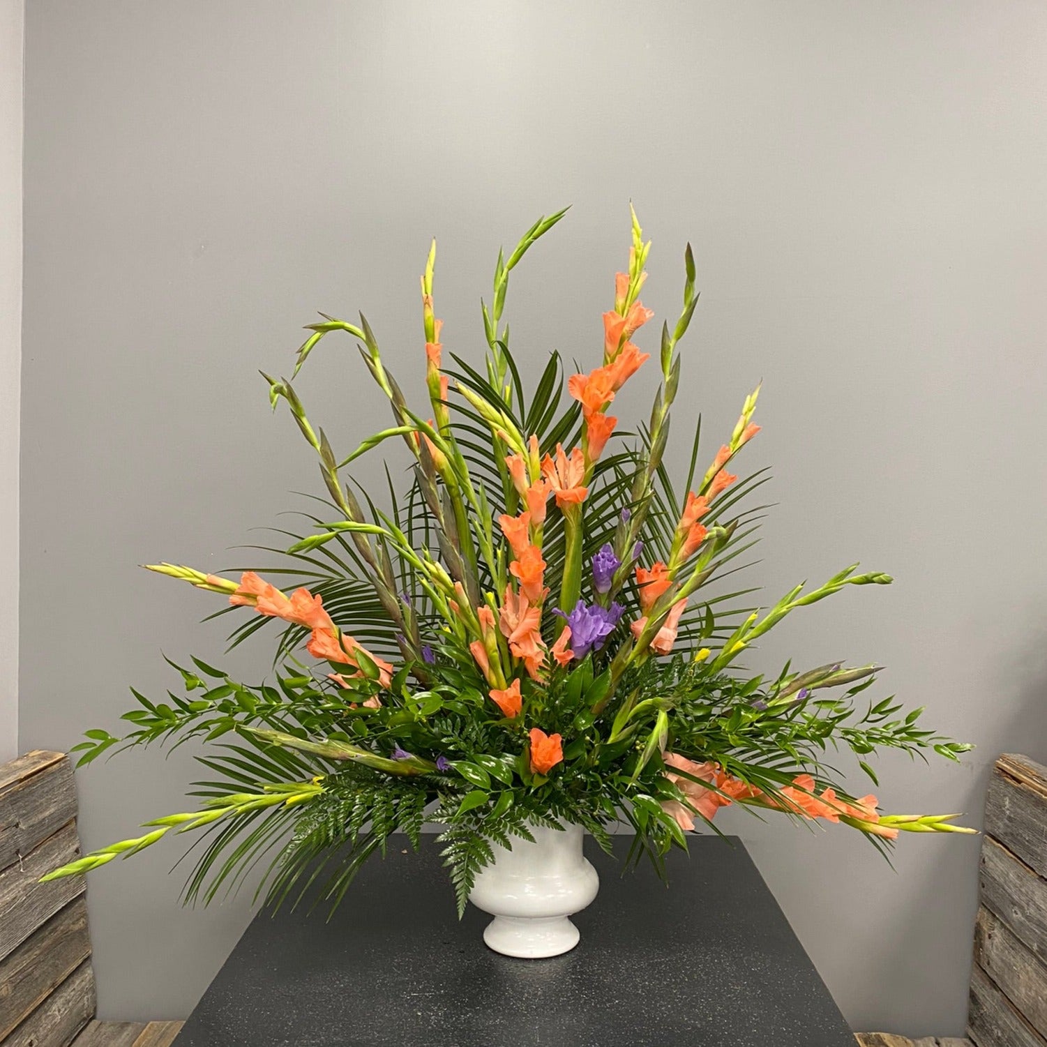 A classic of mixed color gladiolas in a simple and elegant container designed in a fan shape to showcase the beautiful colors.