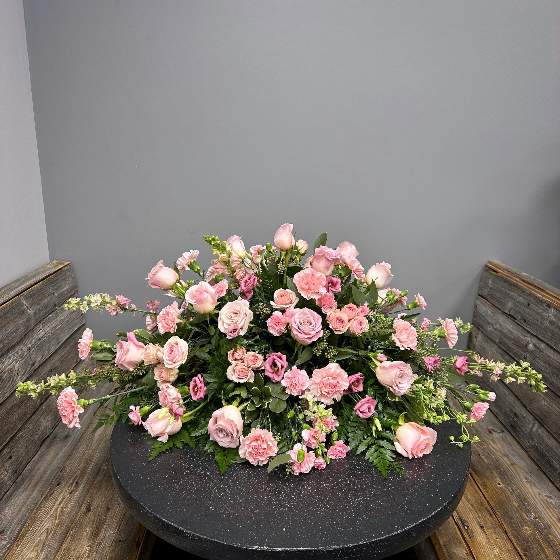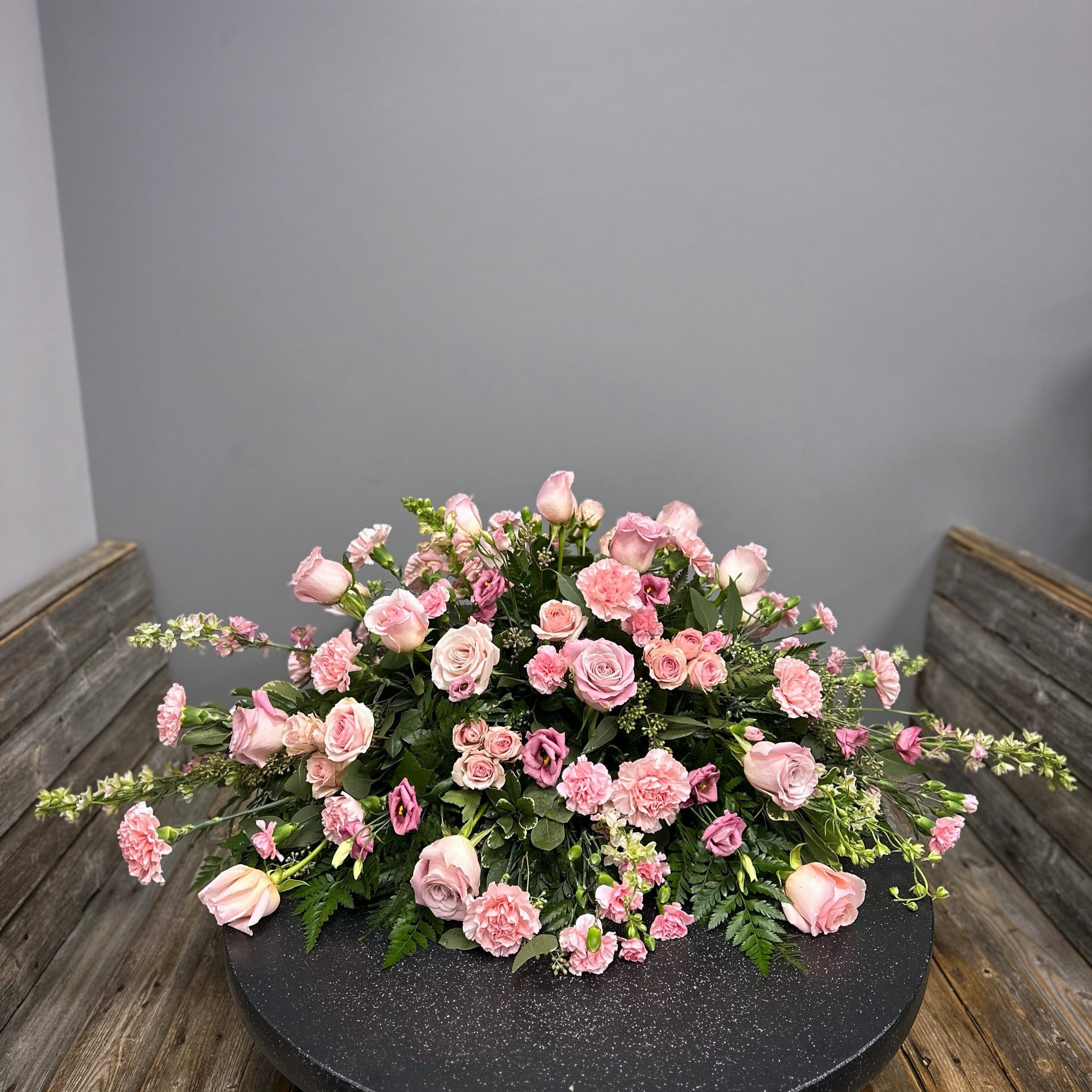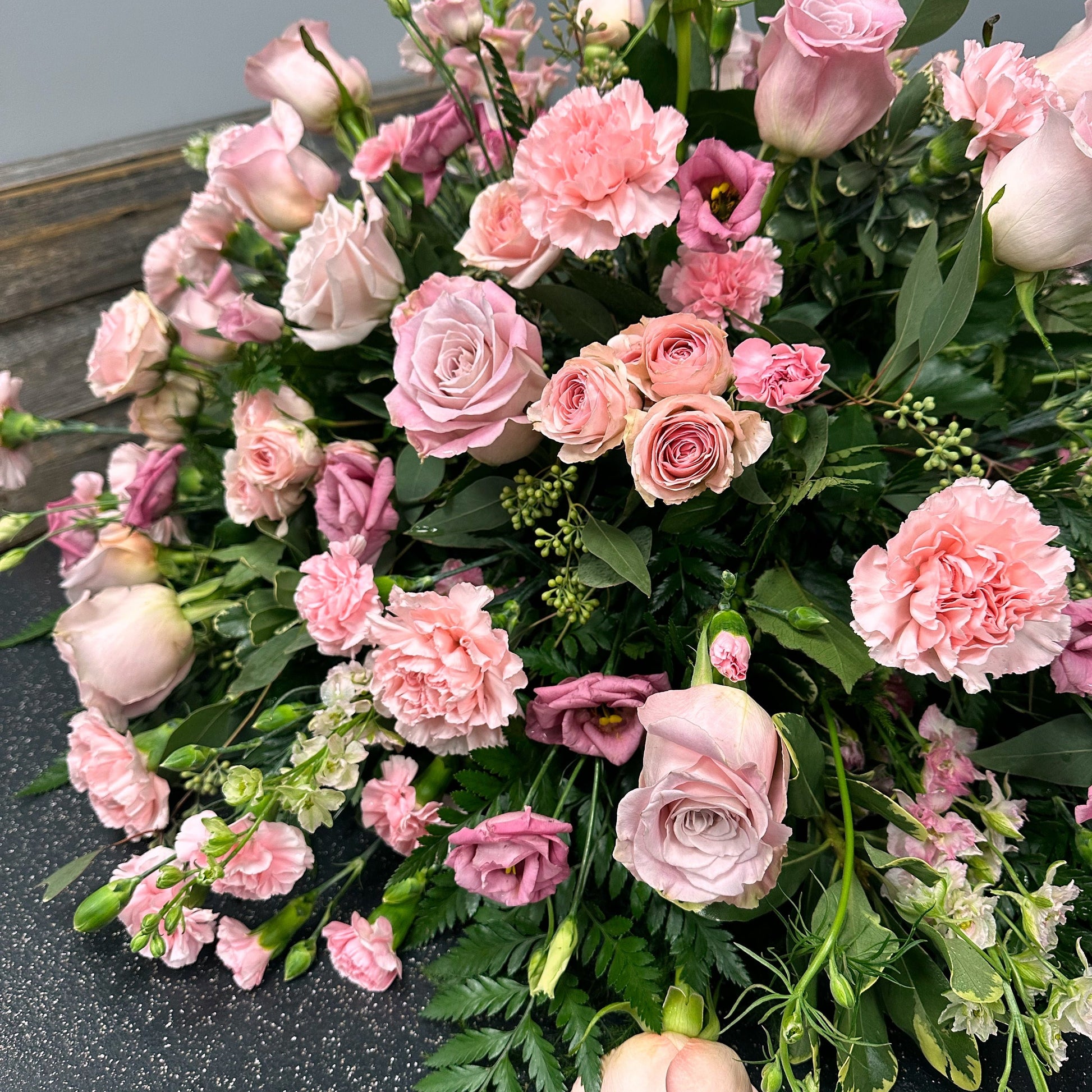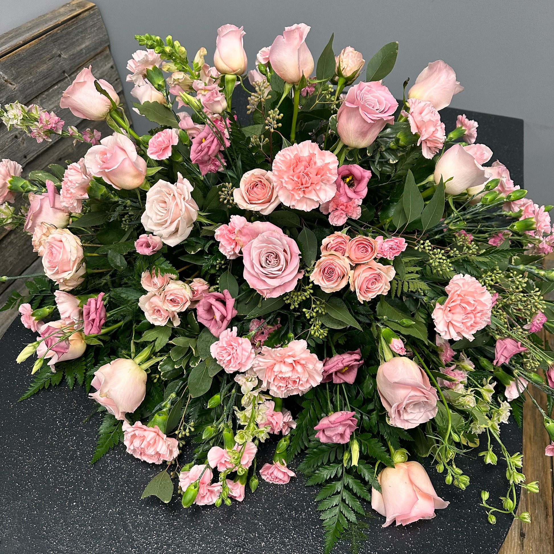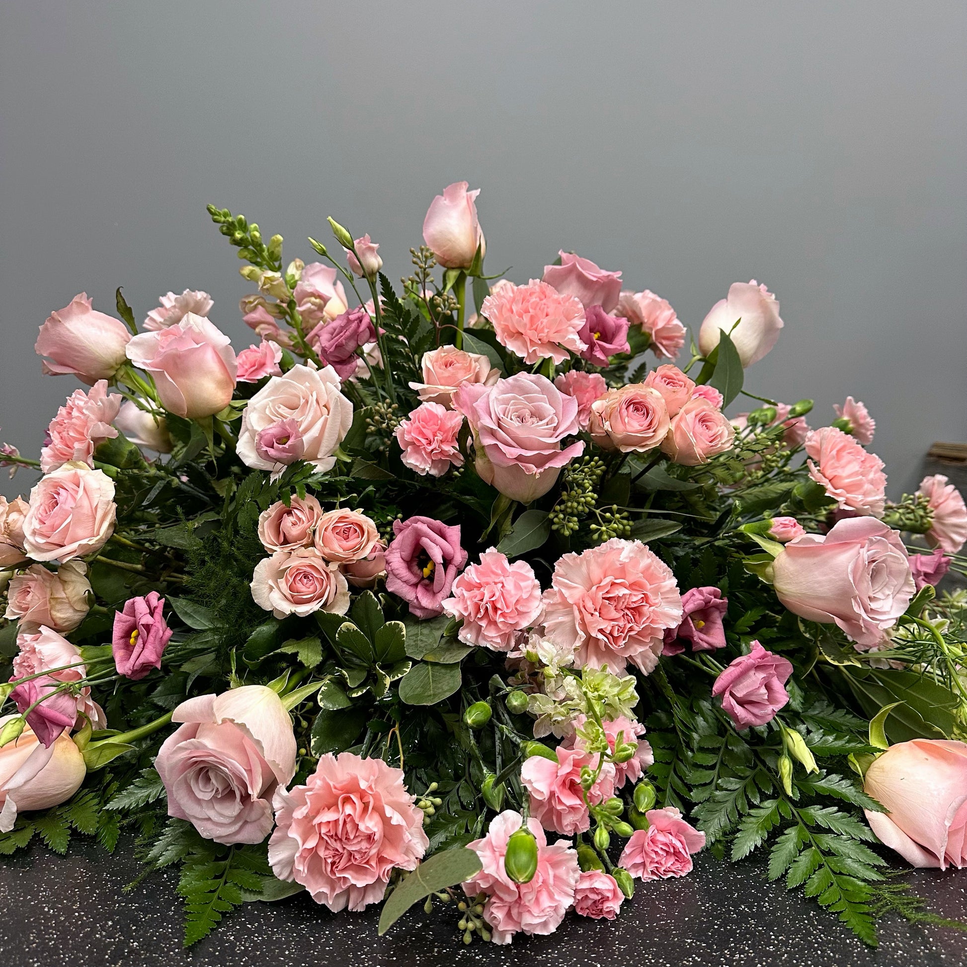 Honor your loved one with The Irene casket spray, a beautiful tribute featuring delicate pink roses, carns, lisianthus, snap dragons, and pink larkspur. Express your love and respect with this elegant arrangement. Honor your loved one with The Irene casket spray, a stunning and heartfelt tribute that combines the delicate beauty of pink roses, carns, lisianthus, snap dragons, and pink larkspur. This elegant arrangement is a thoughtful way to express your love and respect for your loved one during this difficult time.