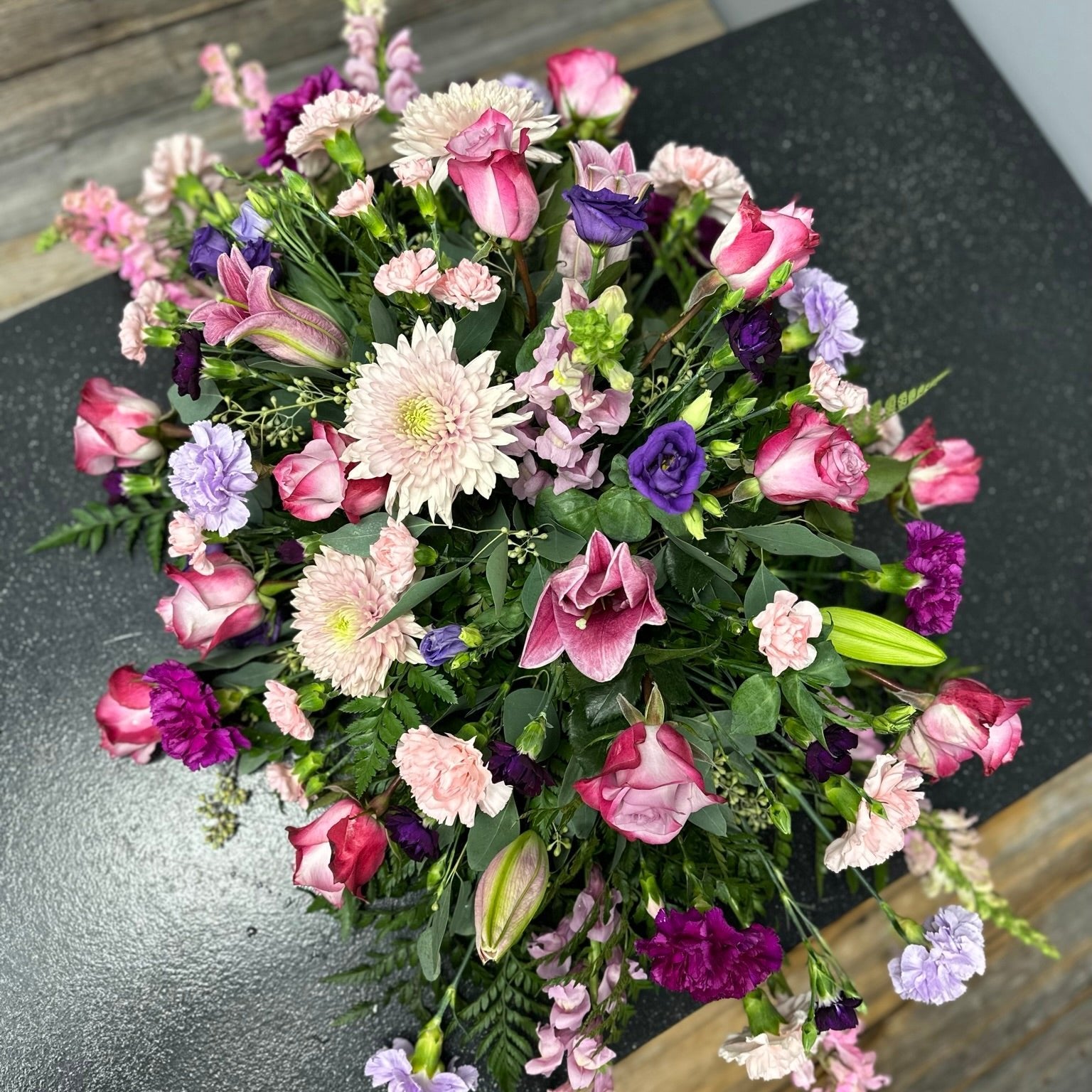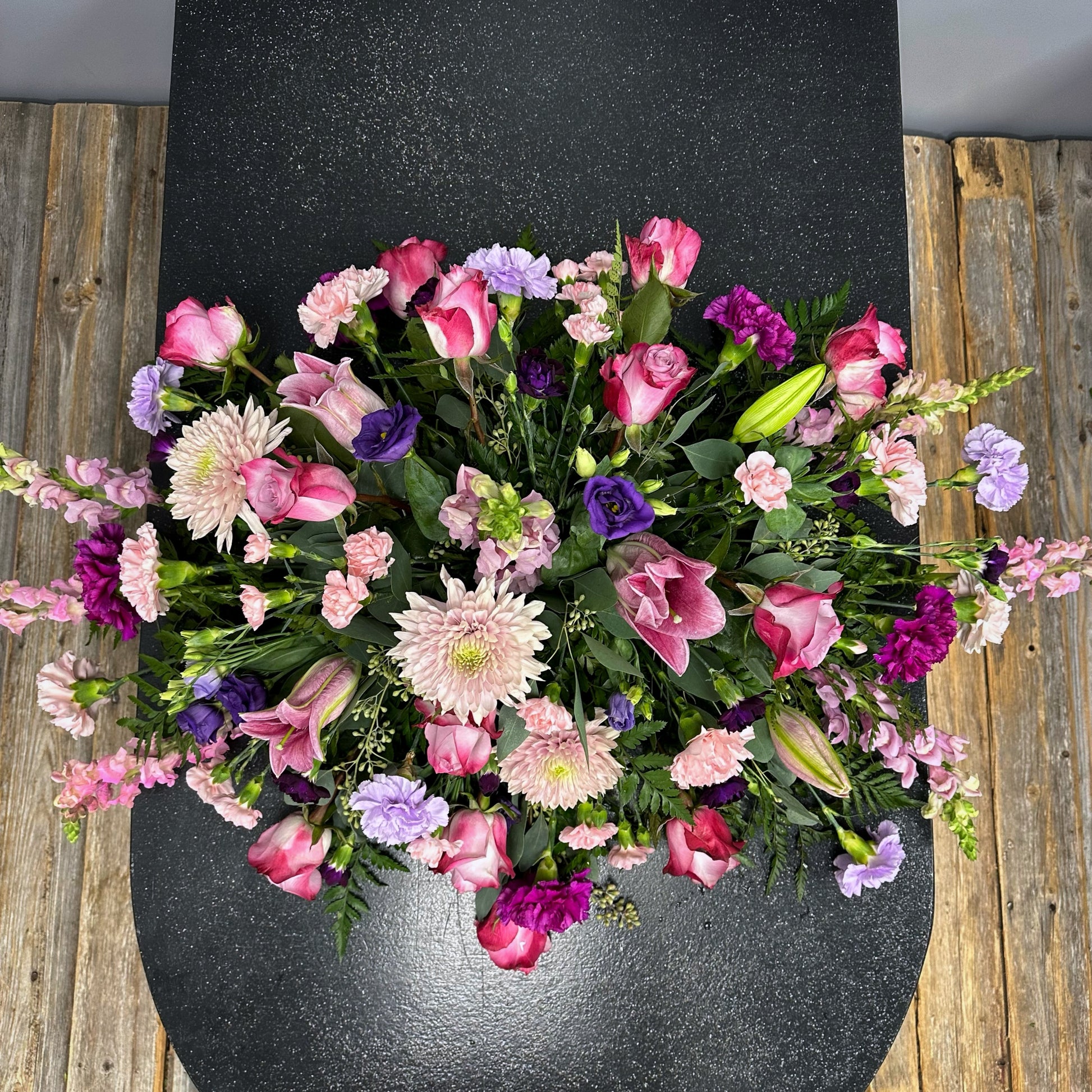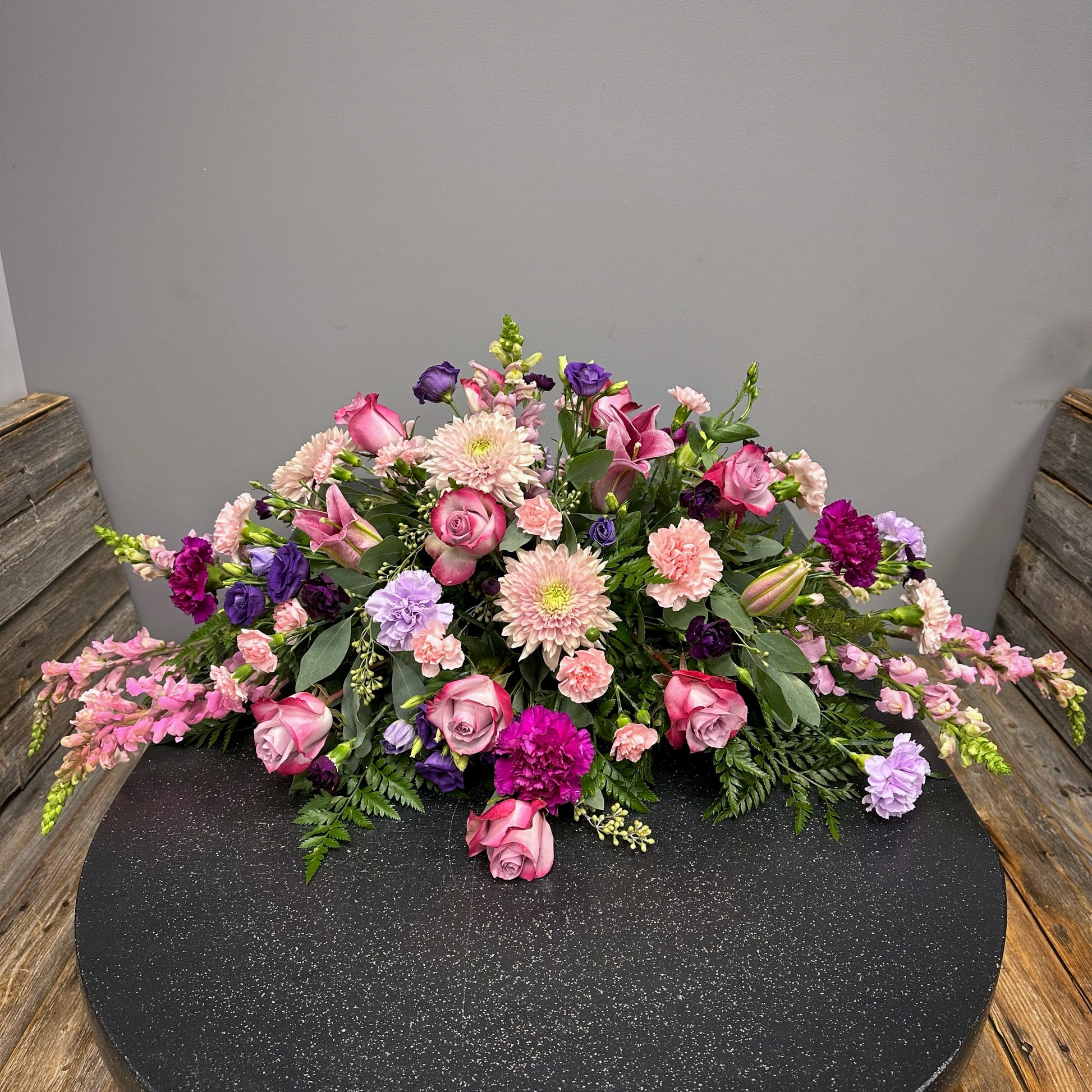 The Janet is a beautiful casket spray that features dark pink and purple roses, carnations, and chrysanthemums. It is a stunning display of vibrant colors that will honor and celebrate the life of your loved one. A heartfelt expression of sympathy and love.