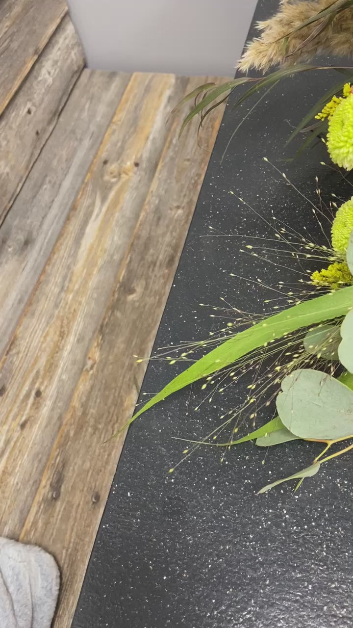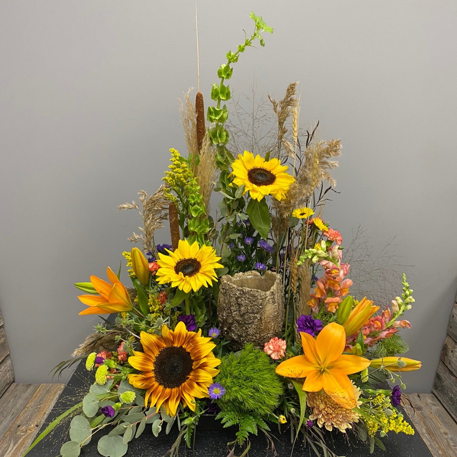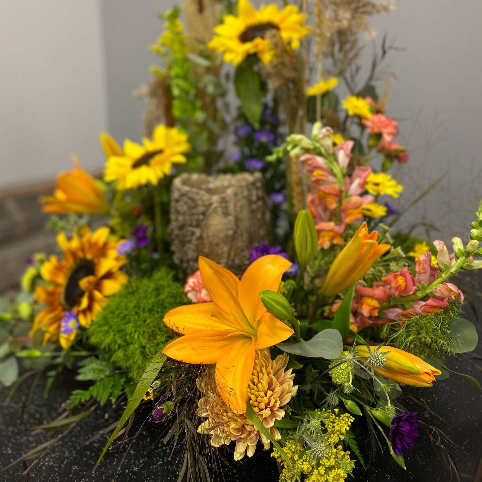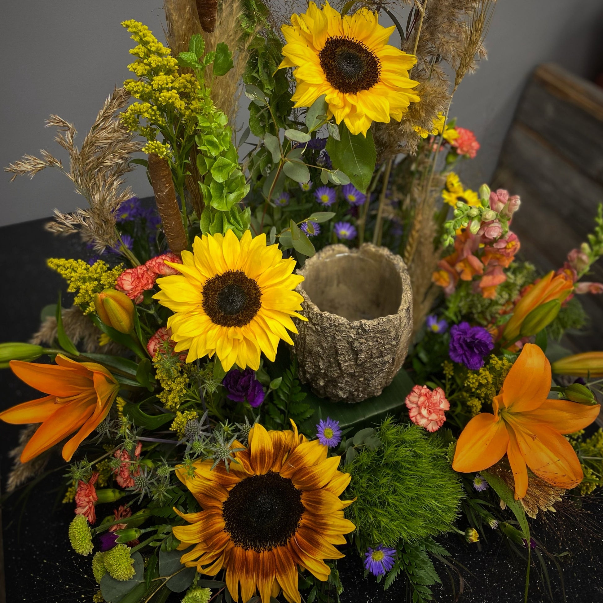 A mix of rustic flowers and grasses give this design a wildflower look and feel. Vibrant oranges and yellows with greens all brought together with wild grasses and bull rushes.