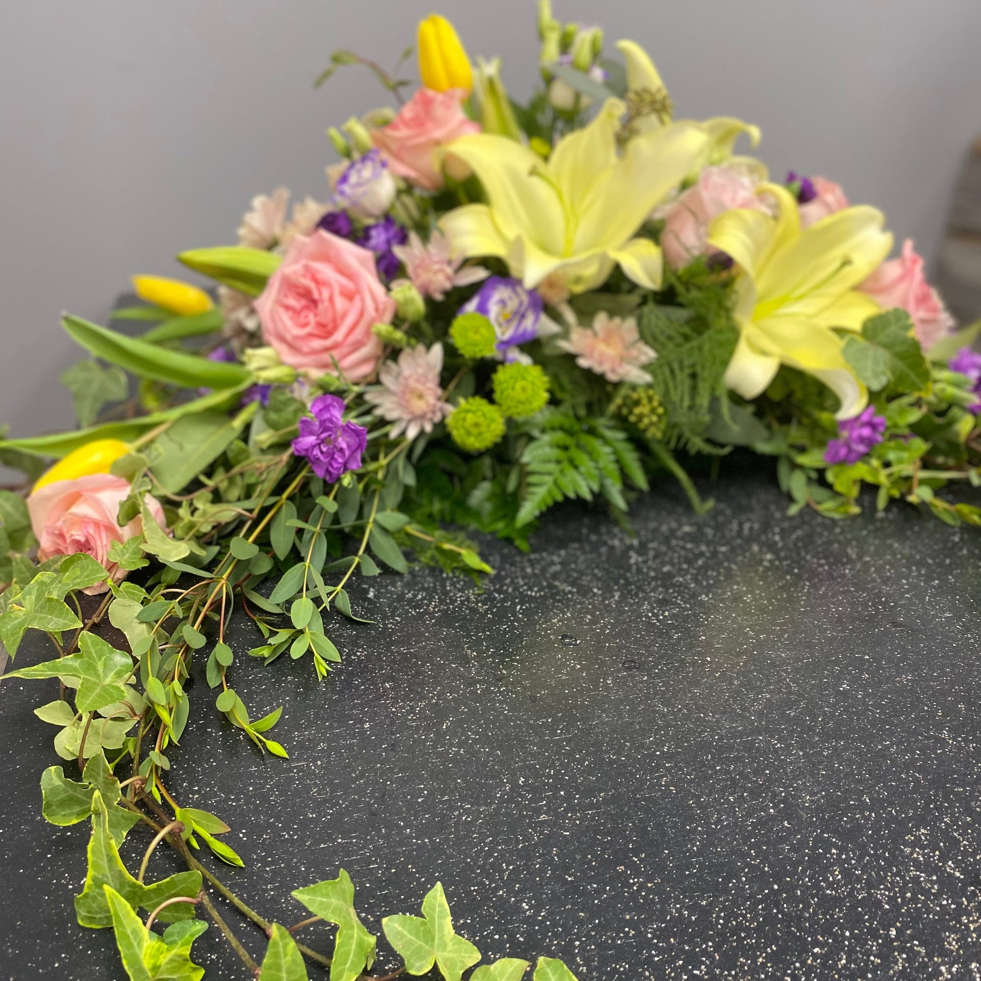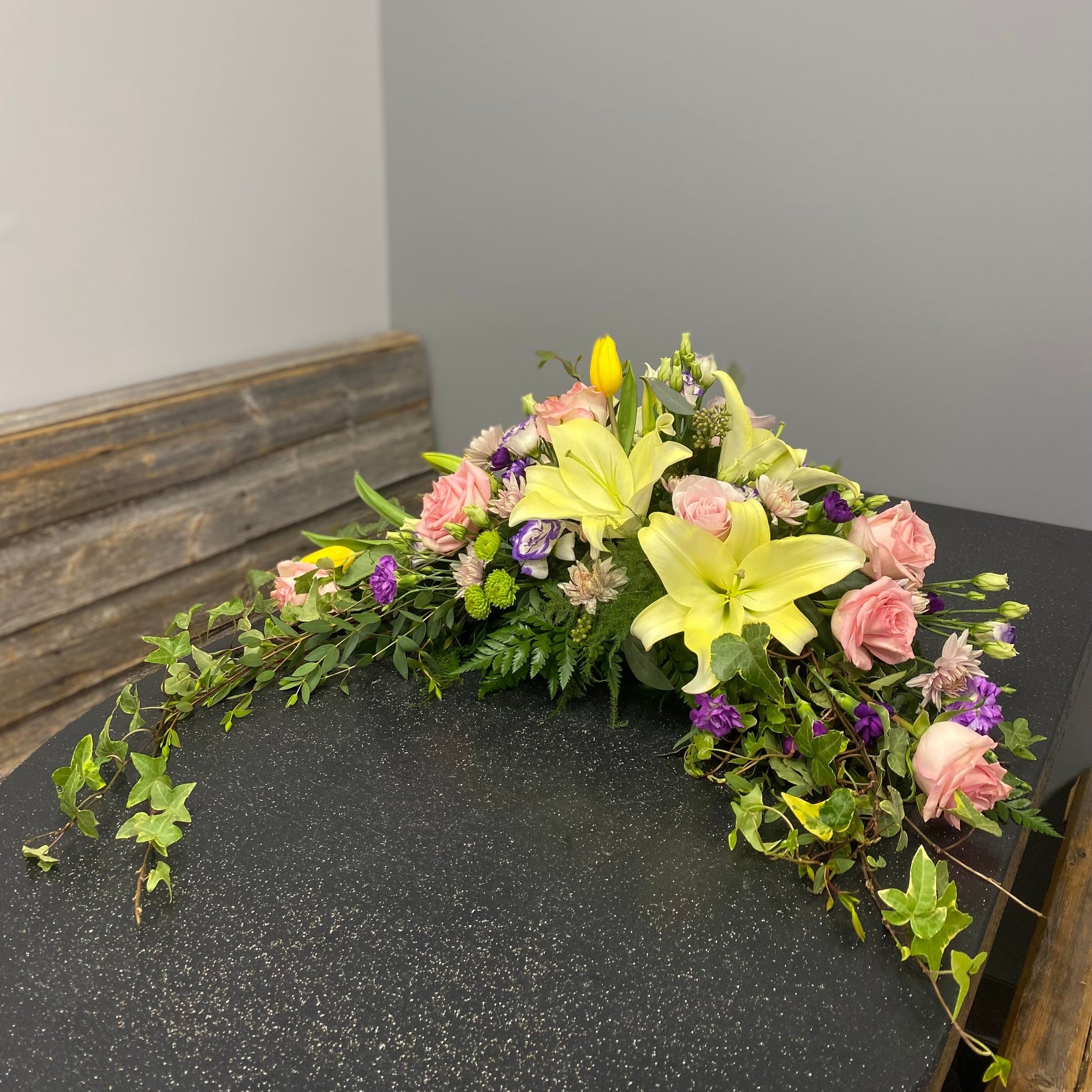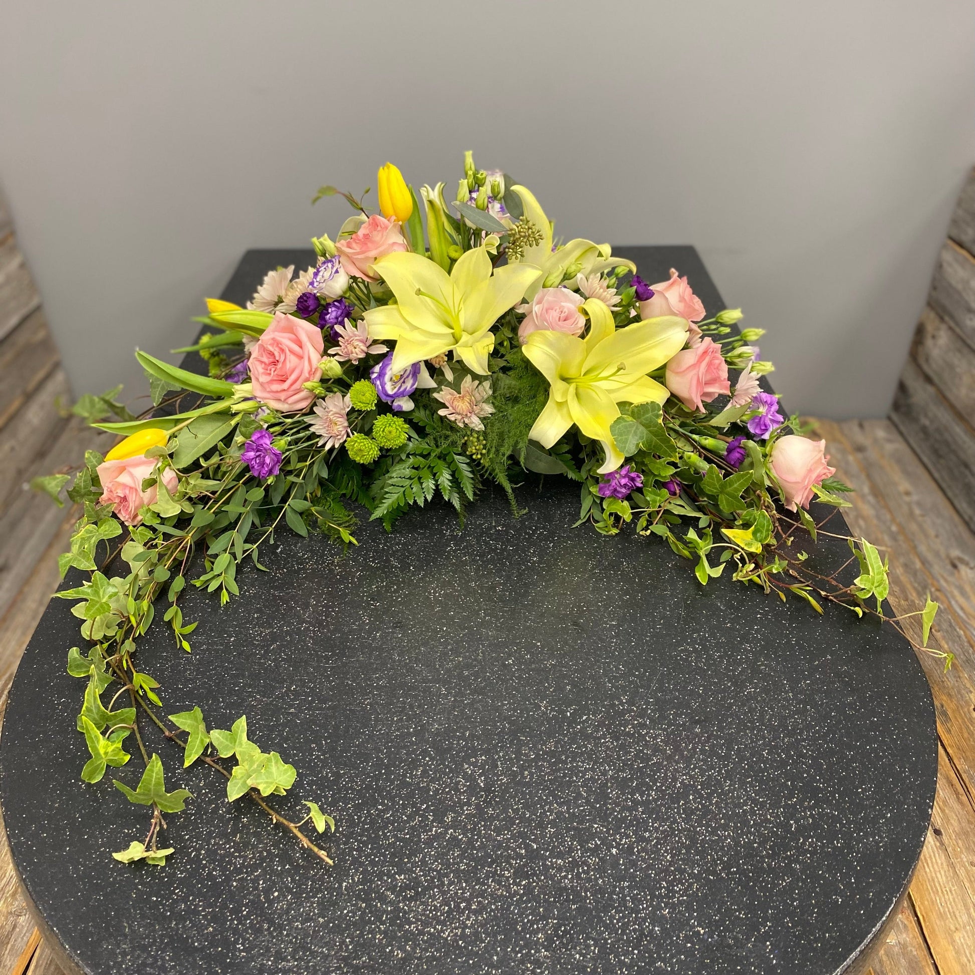 Bring comfort to your grieving loved ones with The Lois, a half moon urn tribute in soft pastel colors - pink, yellow, lavender, and green. This gentle embrace will honor and cherish the memory of your beloved.