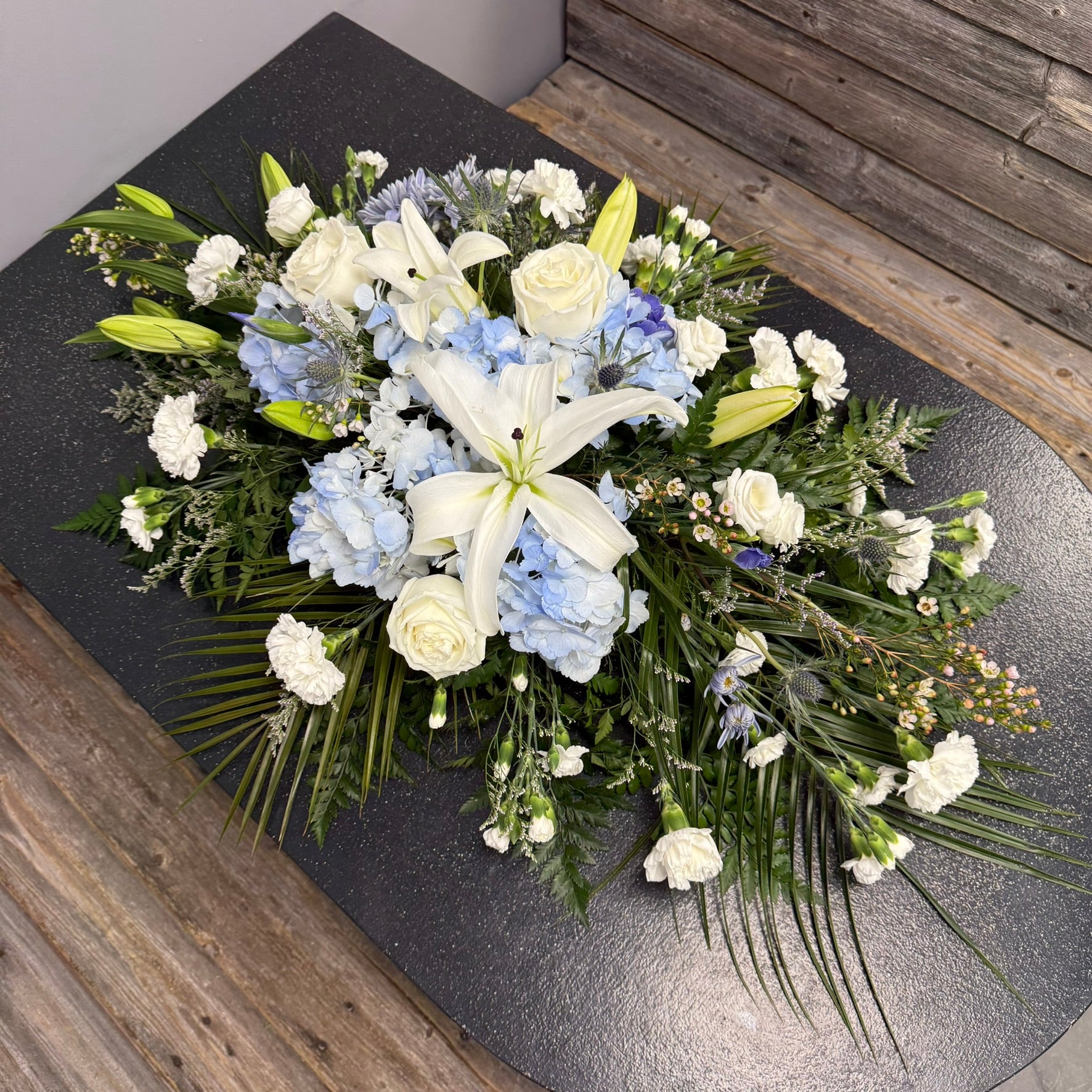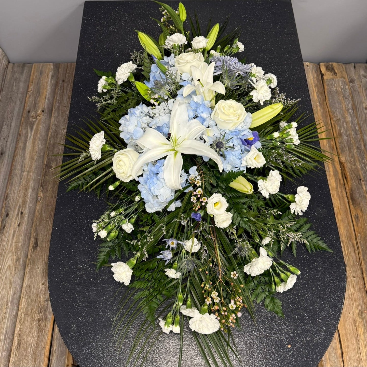 The Marilyn is a beautiful and peaceful arrangement, perfect for honoring a loved one. Featuring white Oriental lilies, delphinium, roses, and daisies, along with tropical greenery, this standing spray exudes a sense of serenity and comfort. It is a heartfelt tribute to Marilyn, who will be deeply missed by her family and friends.