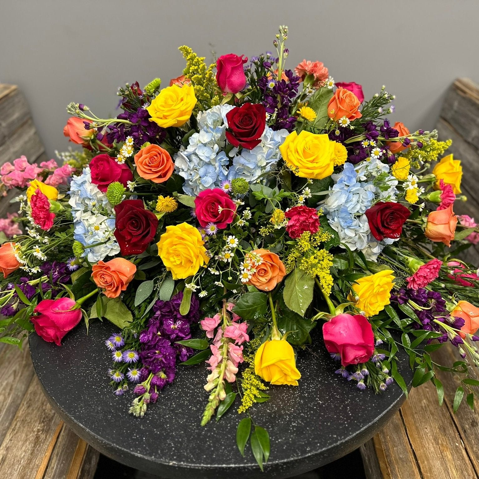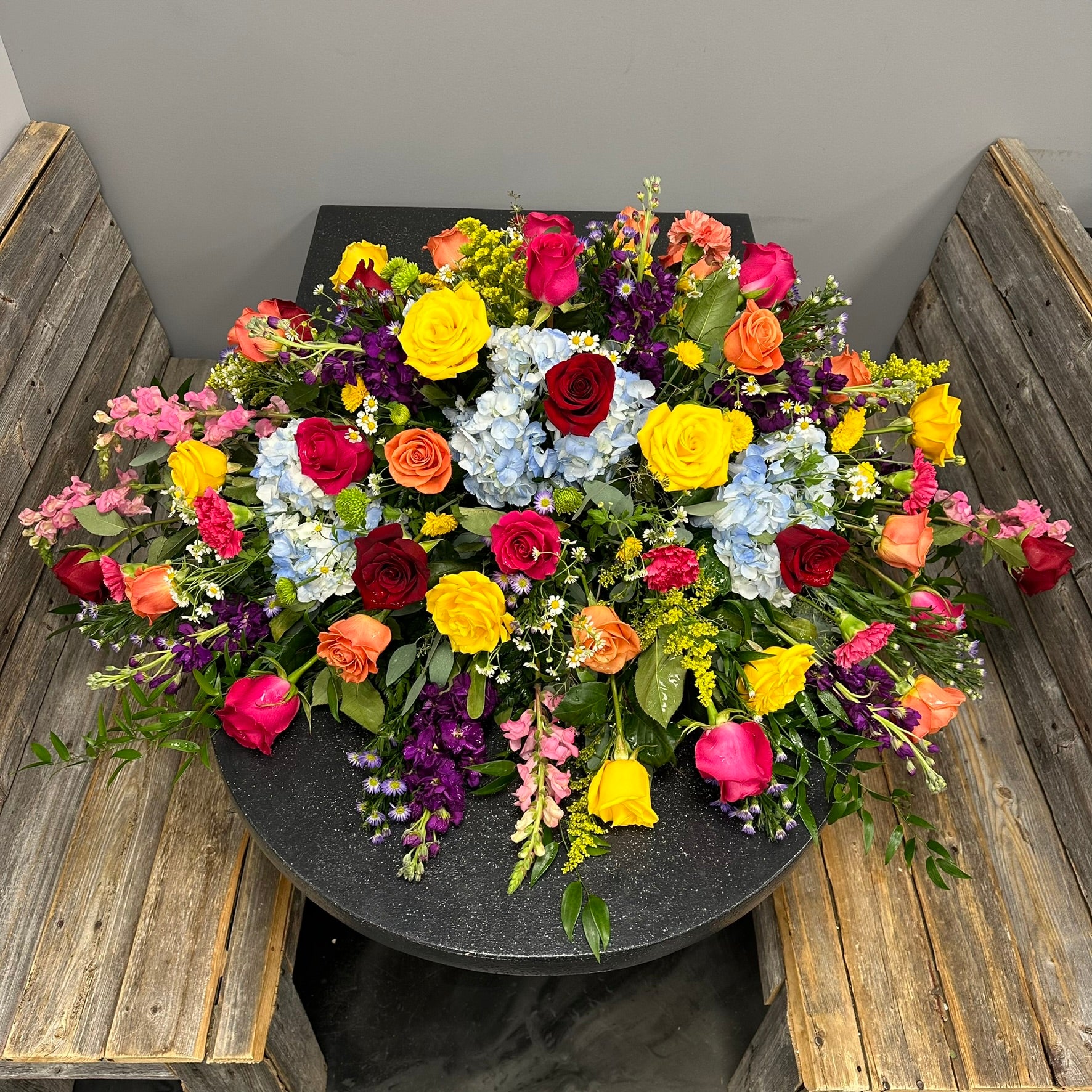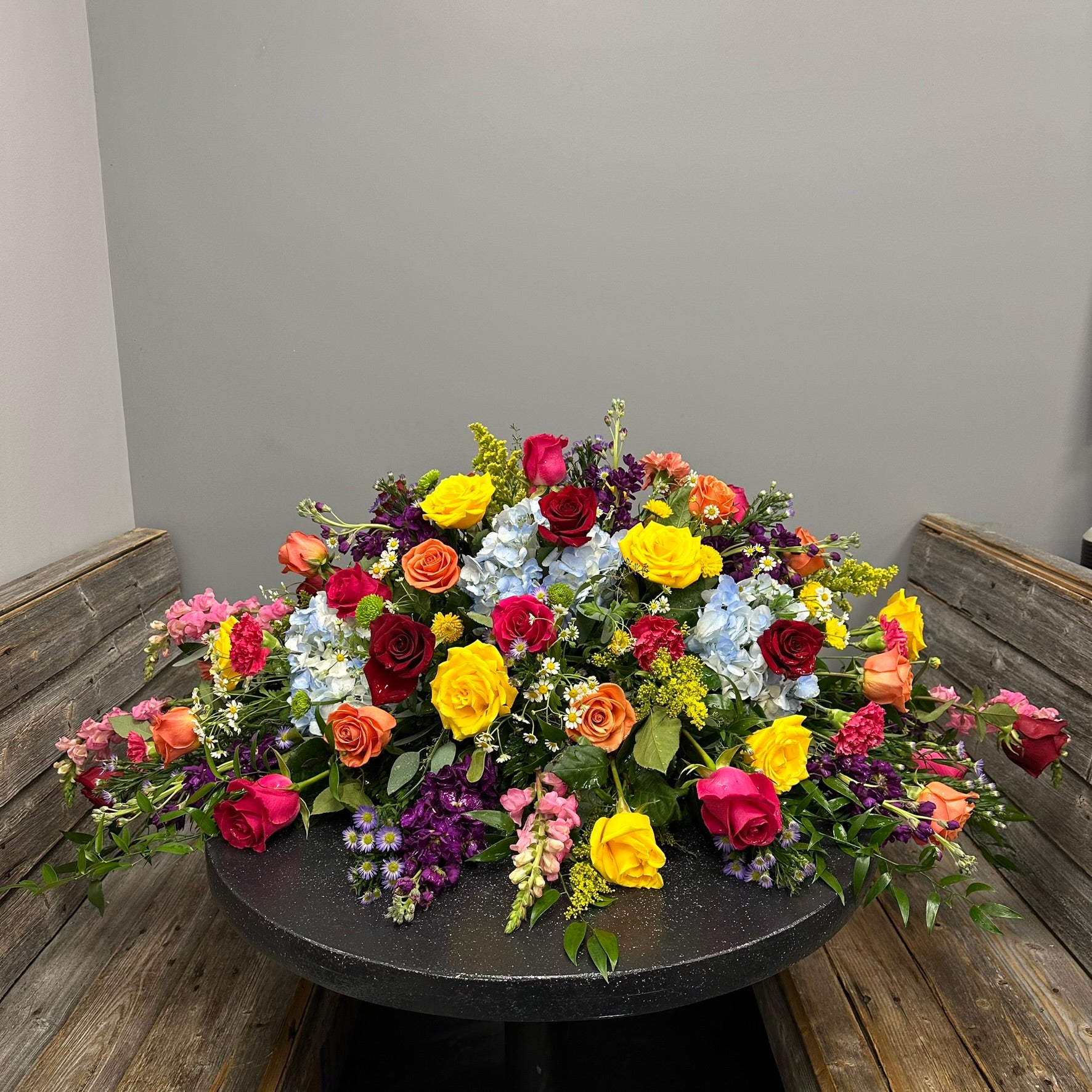 Discover the beauty of our Marion casket spray, a stunning tribute in bright mixed colors that will honor and celebrate your loved one's life. This beautiful piece will bring warmth and comfort to those who gather to remember them.