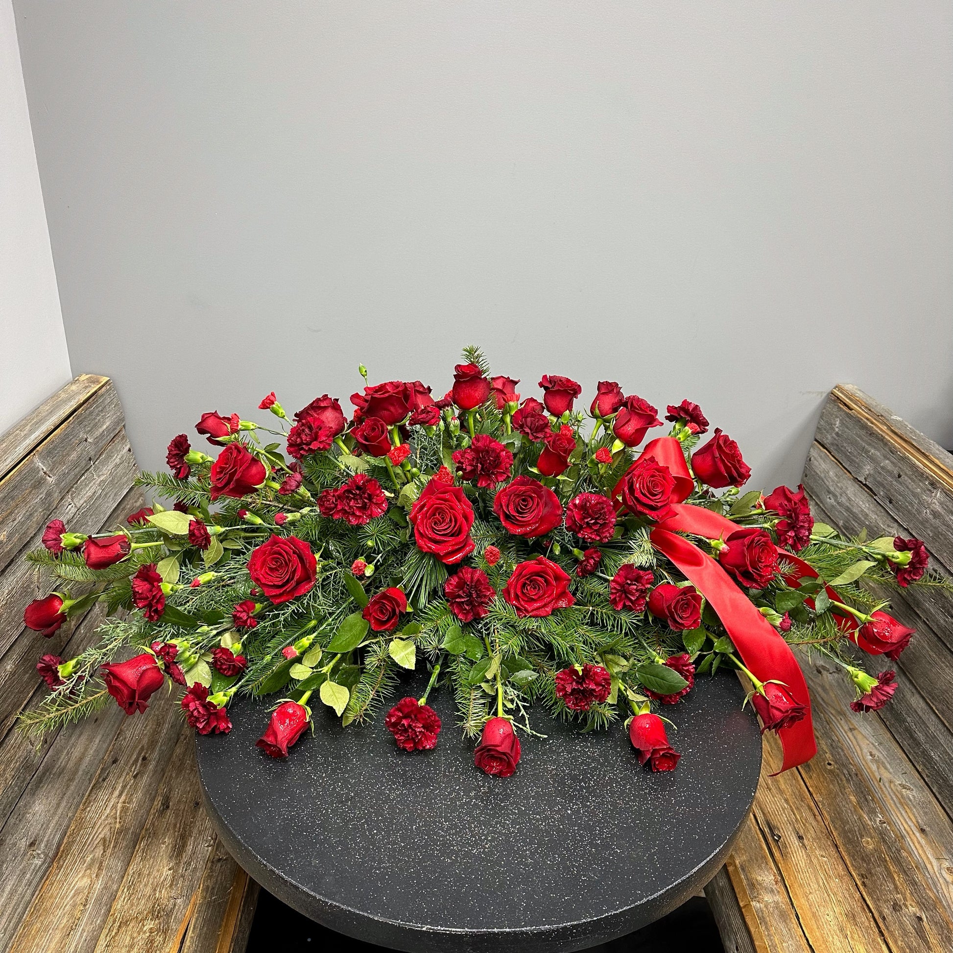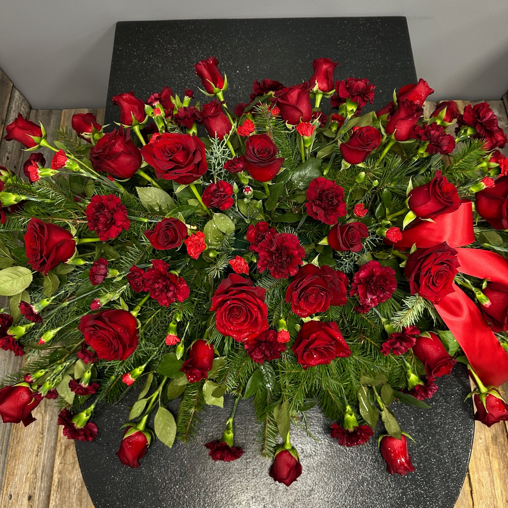 The Nicholas is the perfect way to remember a loved one. This epic casket spray features brilliant red roses and carnations, creating a classic and bold look. Honor your loved one in a beautiful and memorable way with The Nicholas.