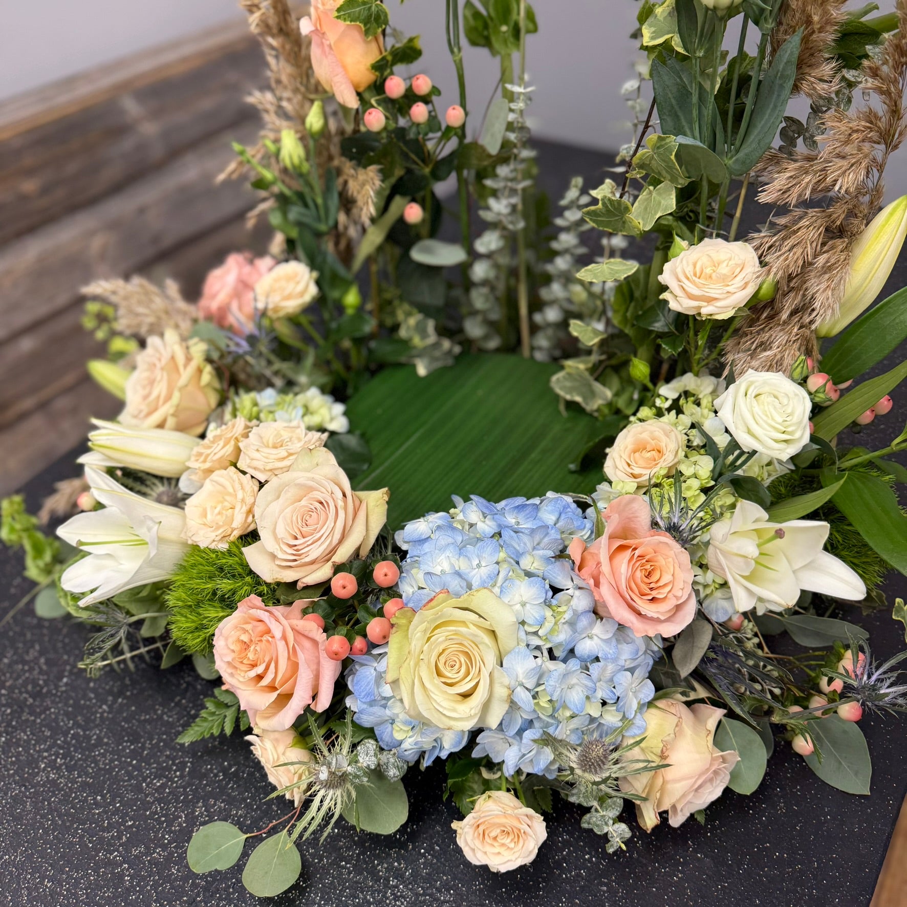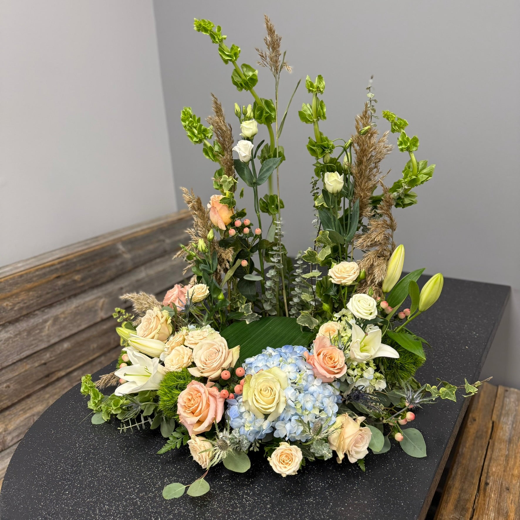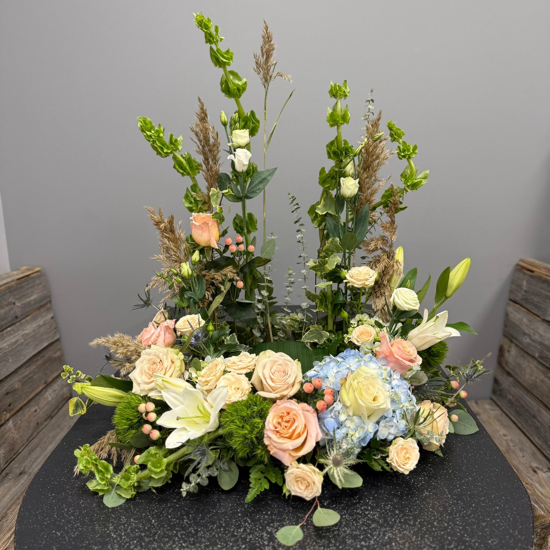 The Norma is a refined urn arrangement crafted with roses, lilies, hydrangea, and Belles of Ireland. Its classy, woodsy design offers a comforting and respectful tribute for sympathy or funeral occasions, expressing heartfelt support and honoring cherished memories with natural beauty.