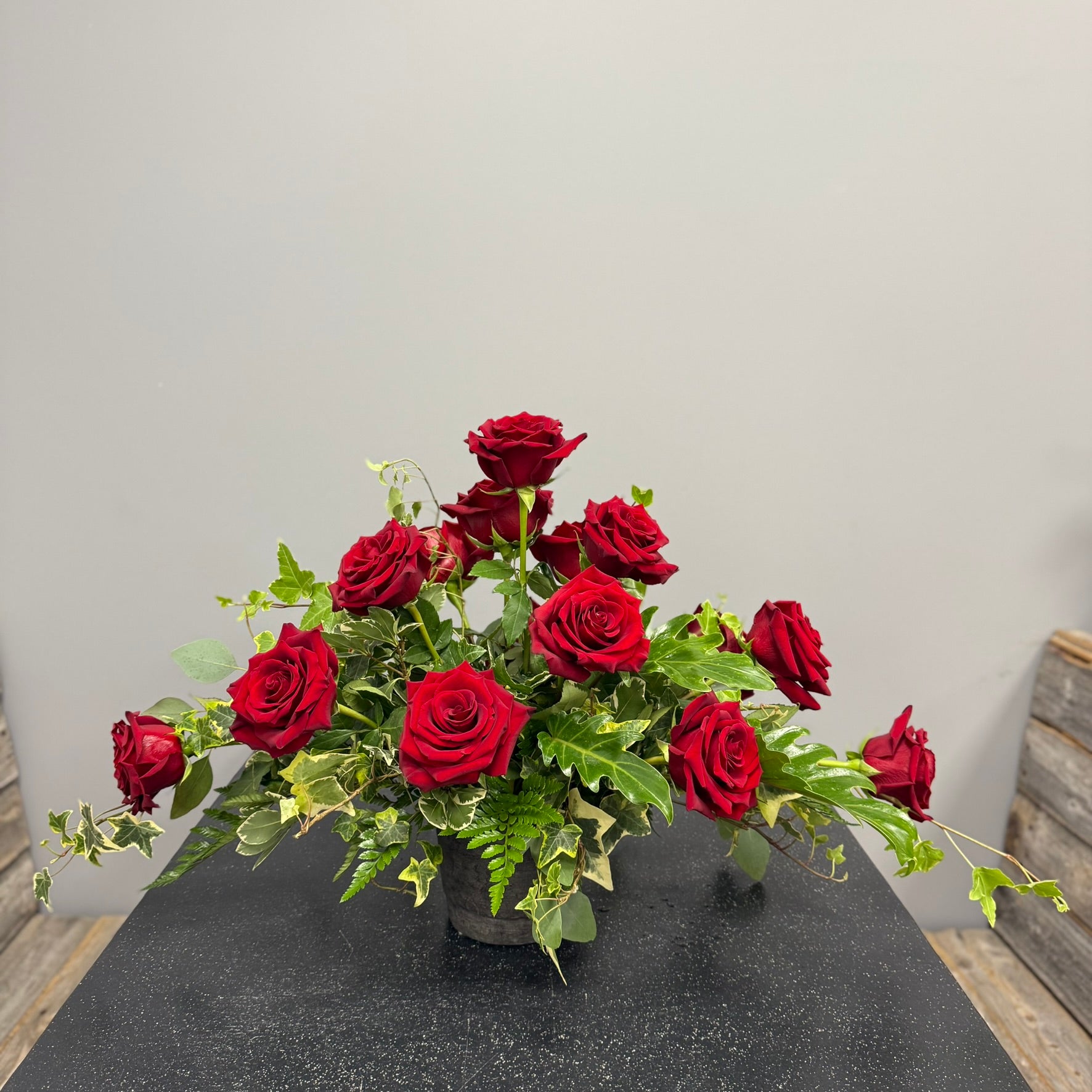 The Sandy is a timeless memorial arrangement featuring 15 elegant red roses intertwined with lush ivy. Designed with classic simplicity, this arrangement conveys deep respect and heartfelt remembrance, making it a fitting tribute to honor a cherished loved one.
