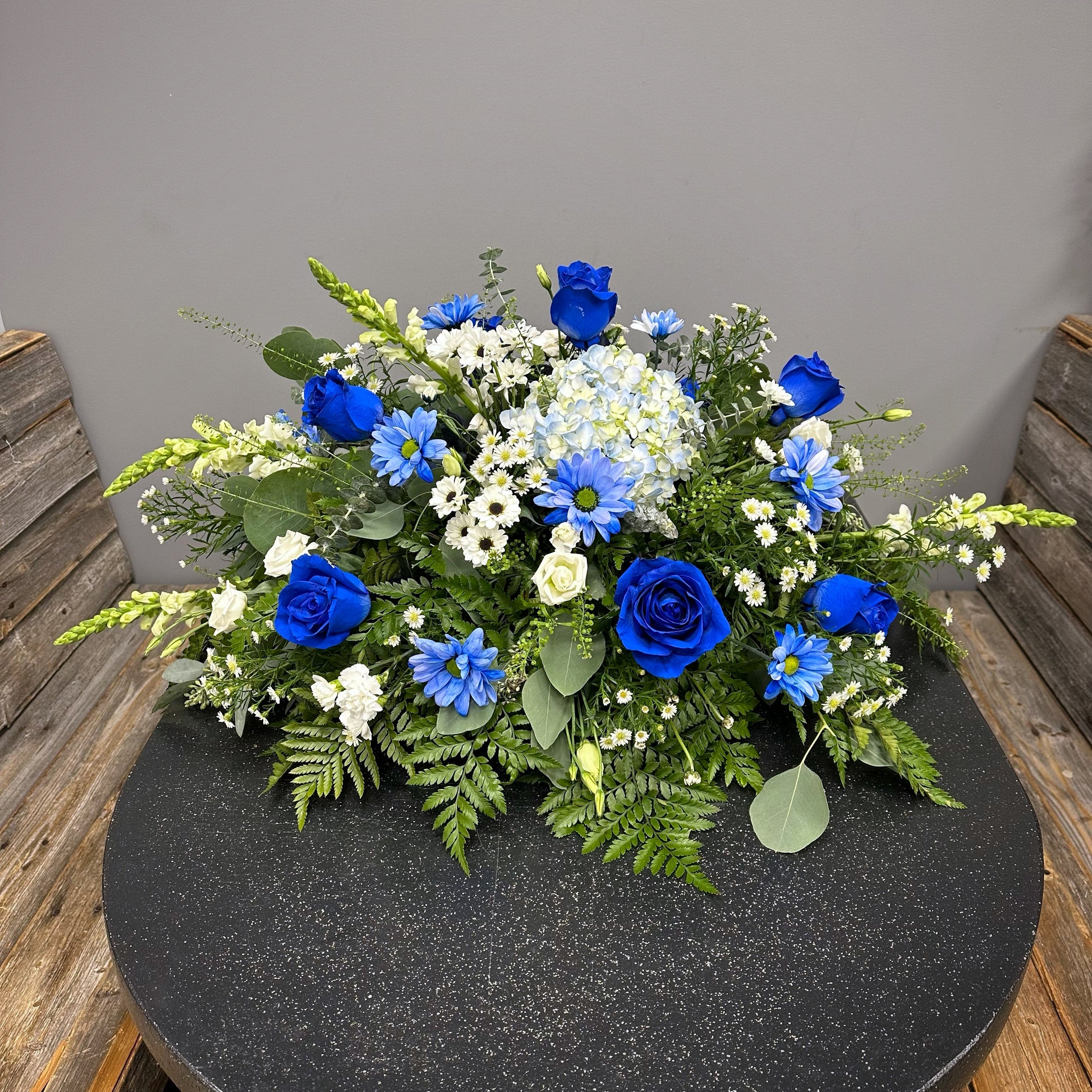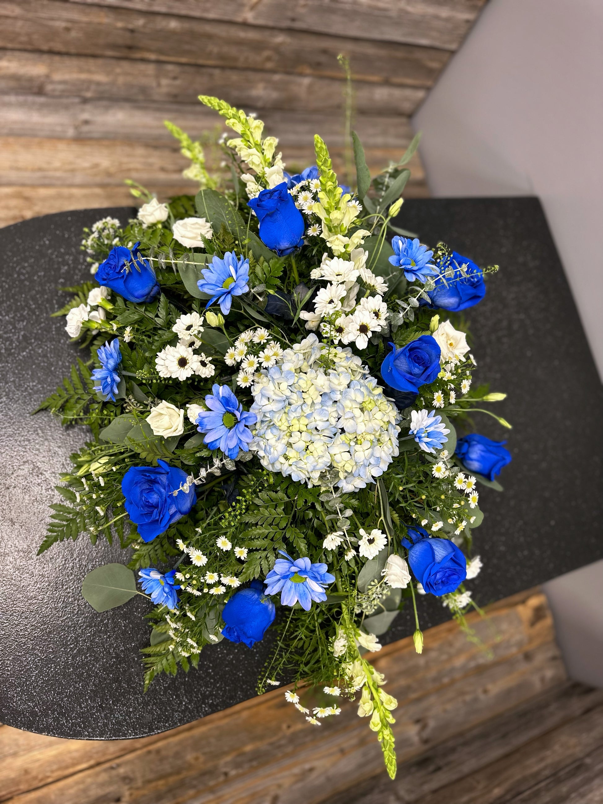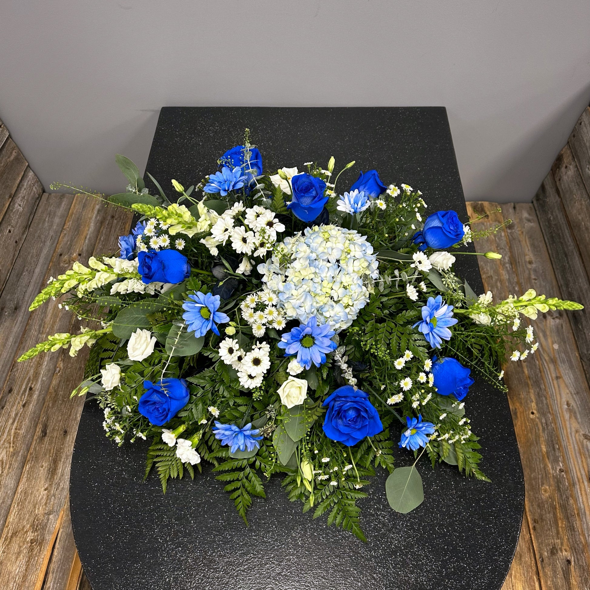 The Skye casket spray features a blend of white and blue flowers including roses, hydrangeas, chrysanthemums, and snap dragons. Honor your loved one with a beautiful and serene arrangement that brings comfort and peace during a difficult time.