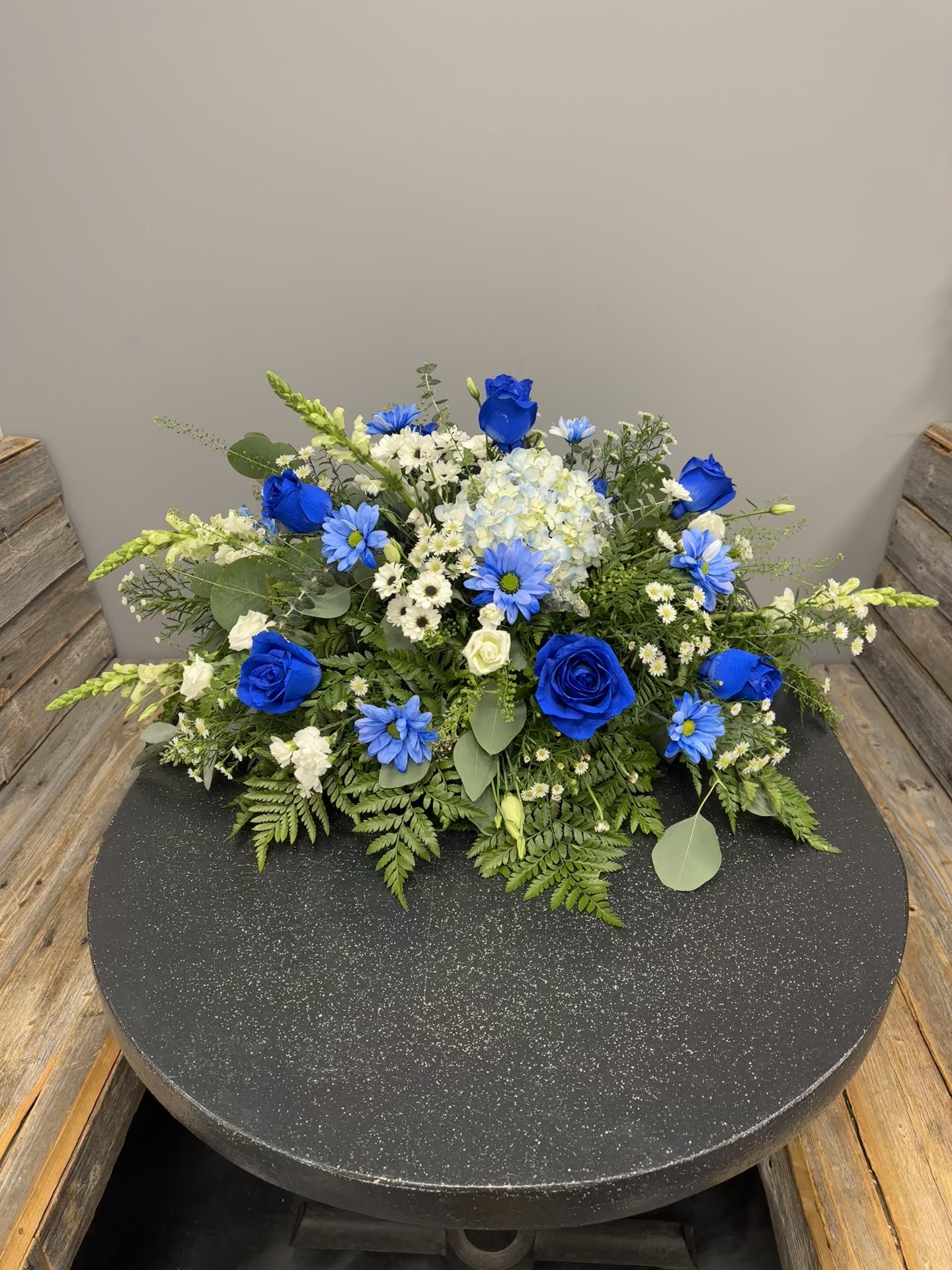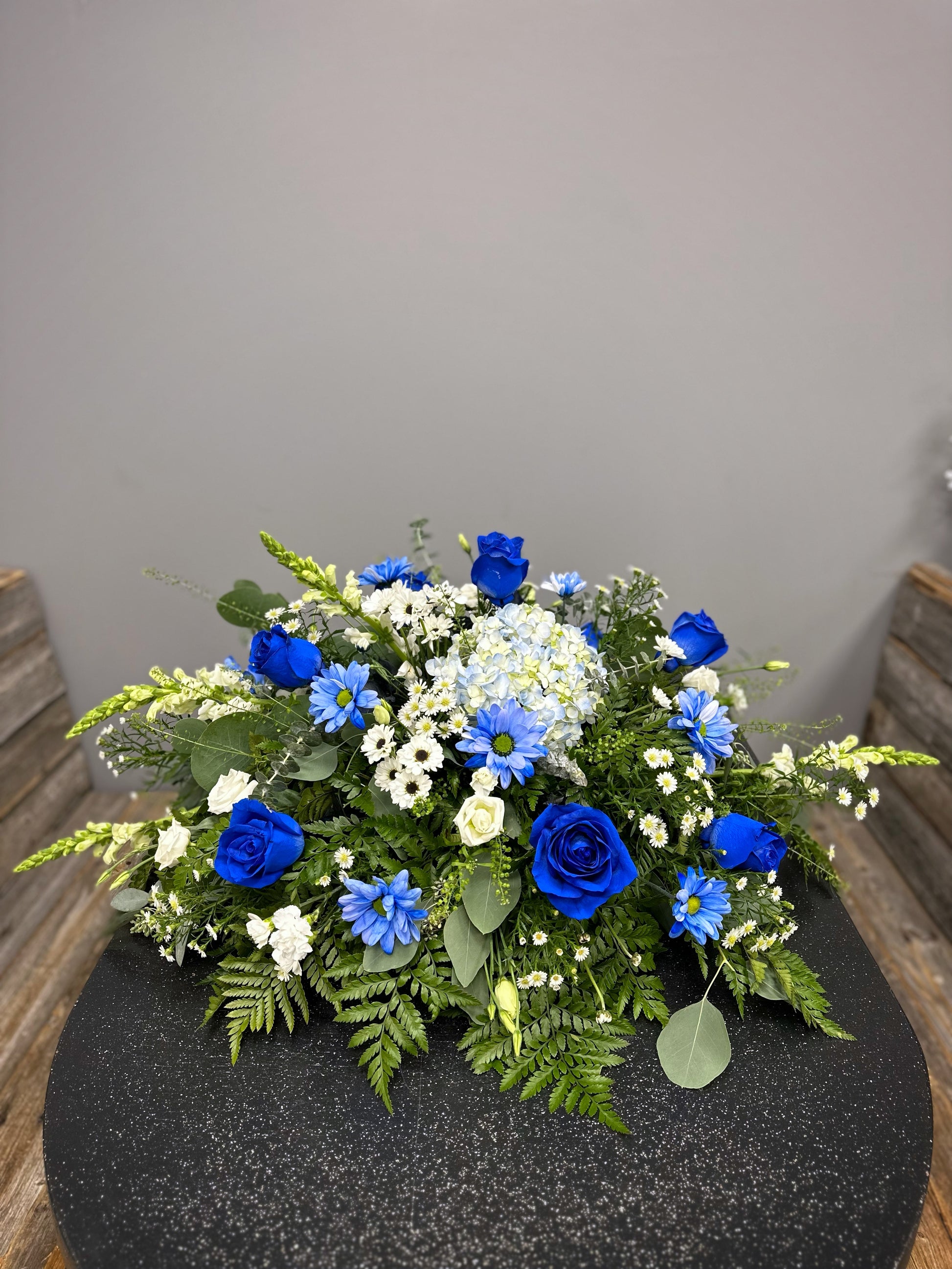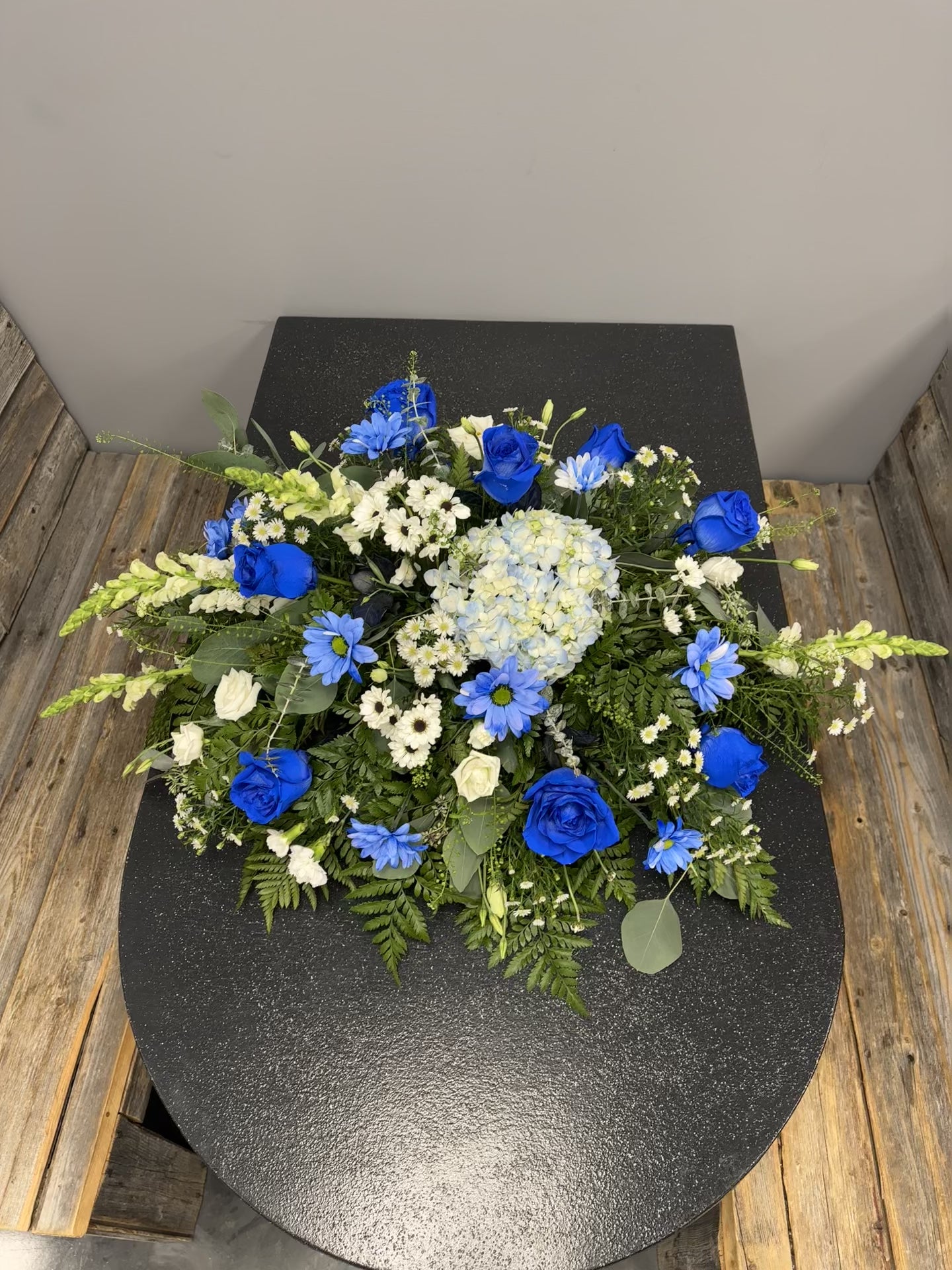 The Skye casket spray features a blend of white and blue flowers including roses, hydrangeas, chrysanthemums, and snap dragons. Honor your loved one with a beautiful and serene arrangement that brings comfort and peace during a difficult time.